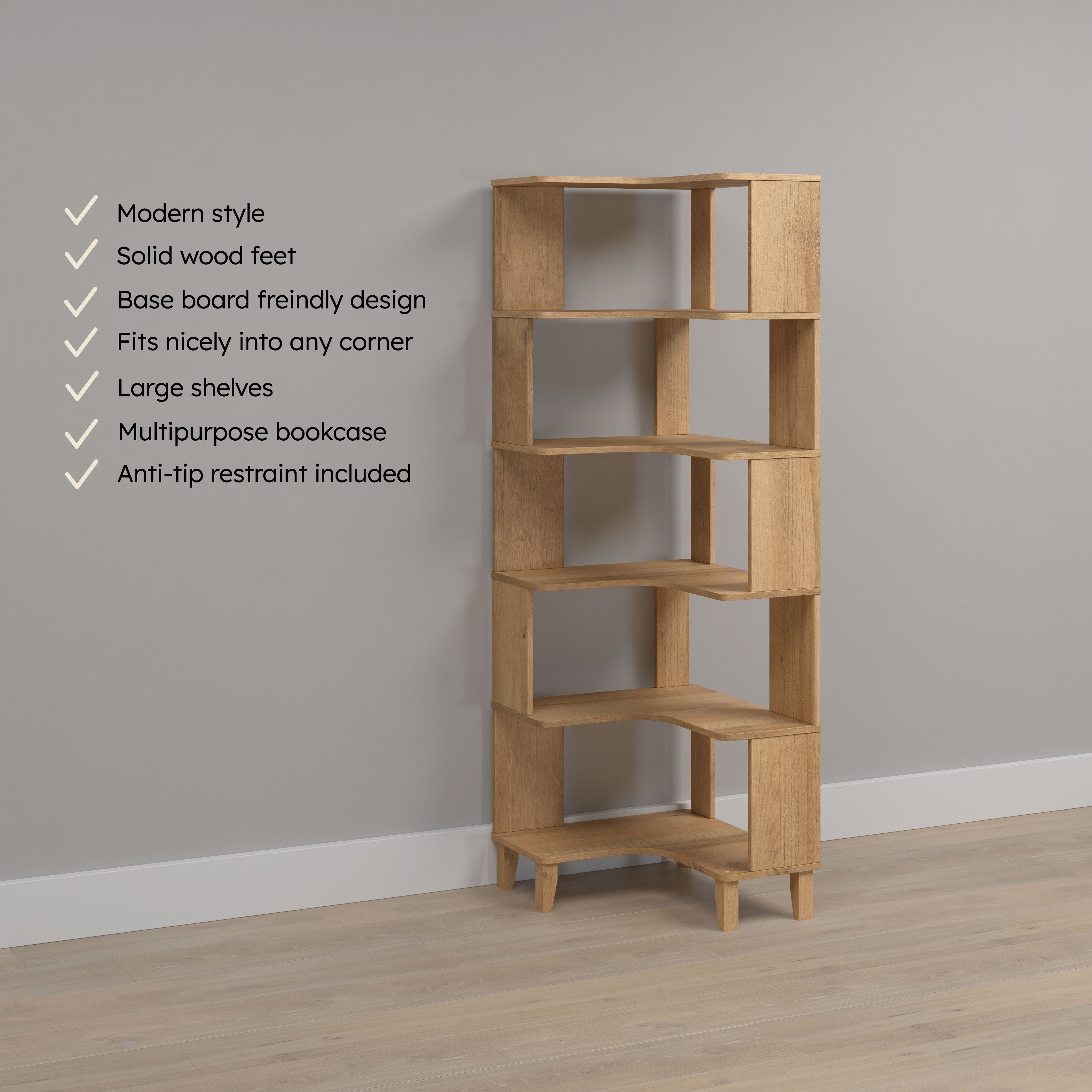Prepac Nordik 6-Tier Natural Oak Modern Mid Century Corner Bookcase, 71.5″ Extra Tall Corner Shelf with Storage, Multifunctional Freestanding Bookshelf for Home Office, Living Room, Bedroom