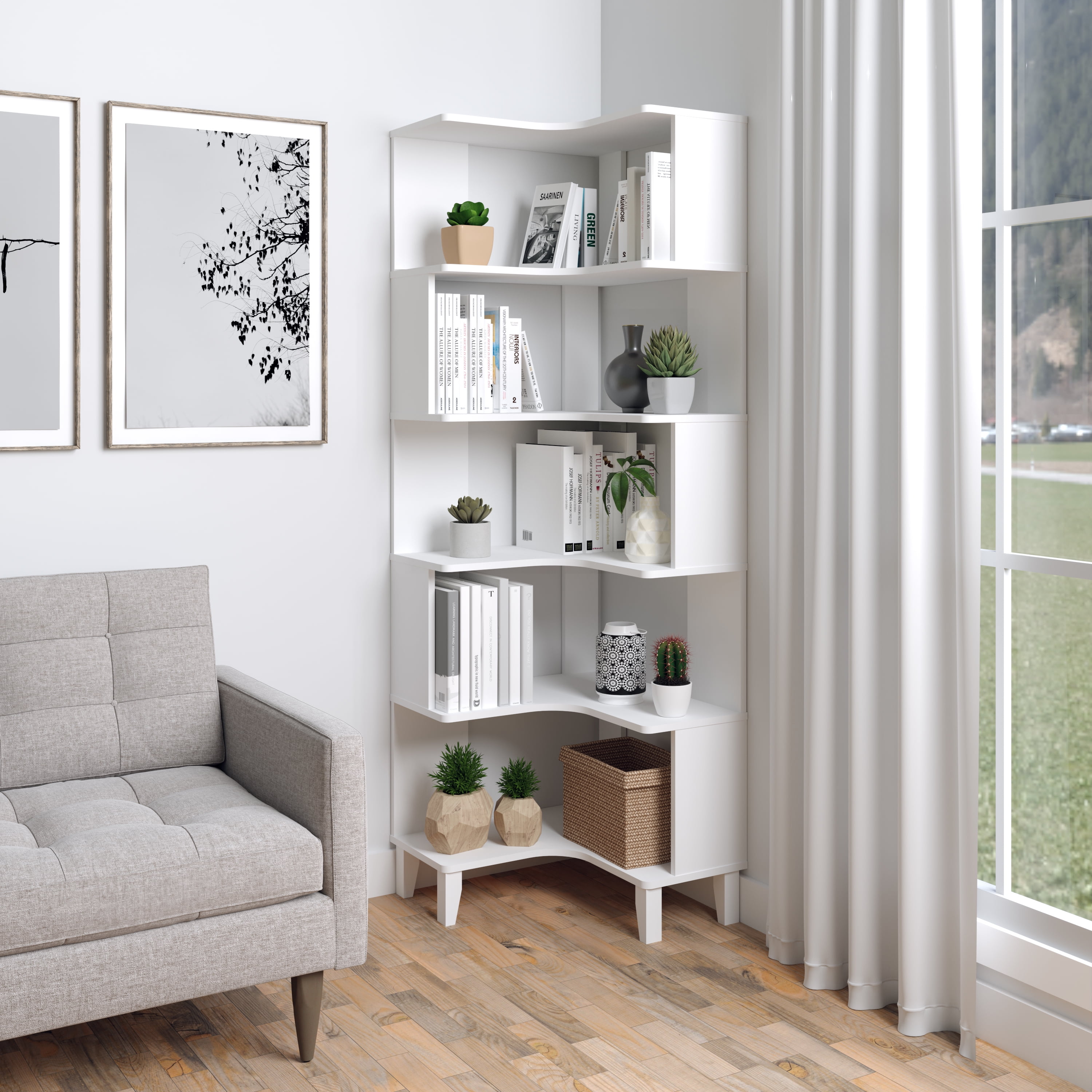 ASSEMBLED DIMENSIONS & WEIGHT: Corner Bookshelf 23.25″D x 23.25″W x 71.5″H, Total weight- 59.50 lbs., All pieces arrive ready to assemble in 1 Box. DESIGNED & MADE IN North America AND CANADA: Prepac furniture products are proudly made in North America for trusted quality & reliability and backed by our knowledgeable North America based customer support team. EXTRA TALL CORNER BOOKCASE WITH MAXIMUM STORAGE: Designed to stand taller than most competitor options, this corner bookshelf with storage offers more capacity for books, decor, and essentials, making it ideal for any room needing extra organization space. STURDY BUILD FOR LONG-LASTING DURABILITY: With thick modeling and solid sides, this corner bookshelf ensures stability and durability, providing a robust structure that keeps your items safe and secure over time. SPACE-SAVING LEG DESIGN: The unique leg design allows the white corner shelf to sit flush against the wall, helping you fully utilize your room’s corner space without any gaps, perfect for compact or awkward spaces. VERSATILE DESIGN FOR ANY ROOM: Whether used in a living room, home office, bedroom, or kitchen, this corner shelf white offers flexible functionality to fit any space, offering style and practicality for a wide variety of home décor styles. DURABLE MATERIAL FOR LONG TERM USE: The white corner bookshelf is constructed from non-toxic (CARB 2 Compliant), laminated composite woods with a sturdy medium-density fiberboard backer for added strength- this white modern bookshelf is easy to clean and environmentally friendly. FAST CUSTOMER SERVICE: We’re here to help with quick responses and solutions to ensure a hassle-free shopping experience. 5 YEAR WARRANTY: All Prepac products are backed by our 5 Year Limited Warranty- if your product arrives damaged or missing parts, contact us for replacement parts at no charge. EASY TO ASSEMBLE: White corner modern bookshelf includes detailed, step-by-step instructions & all necessary parts- the versatile mid-century bookshelf typically be assembled in 45 minutes or less with basic hand tools by 2 persons.