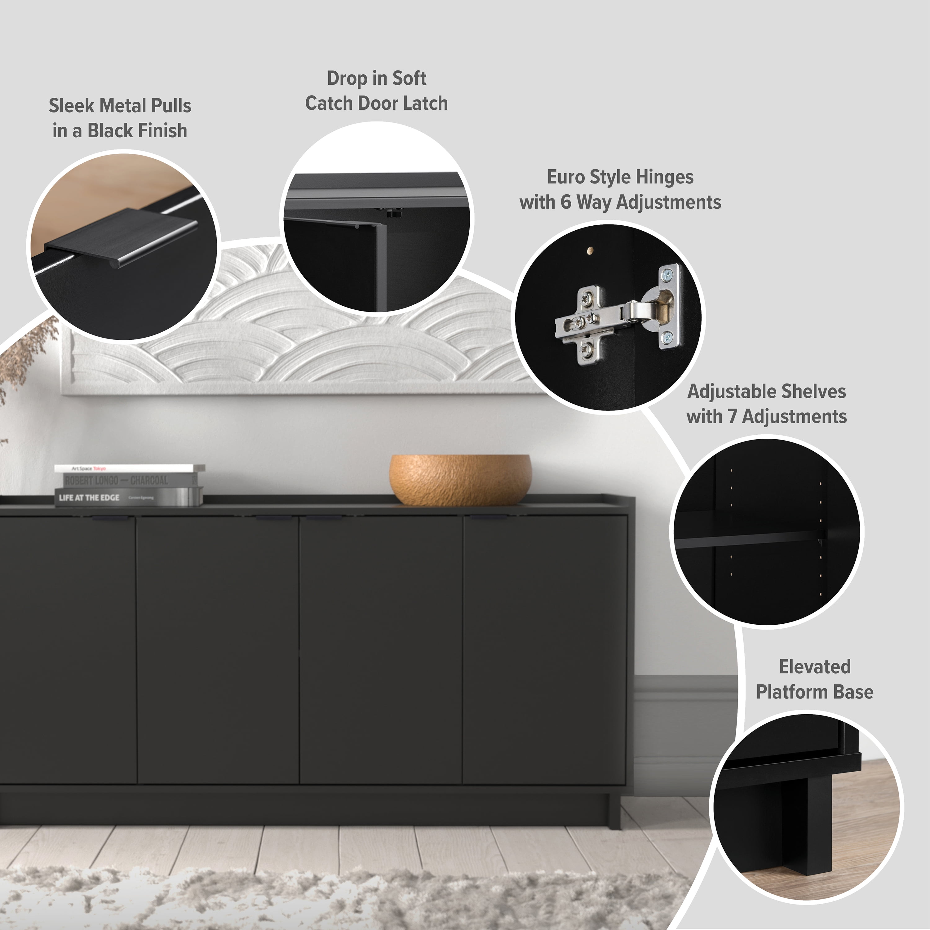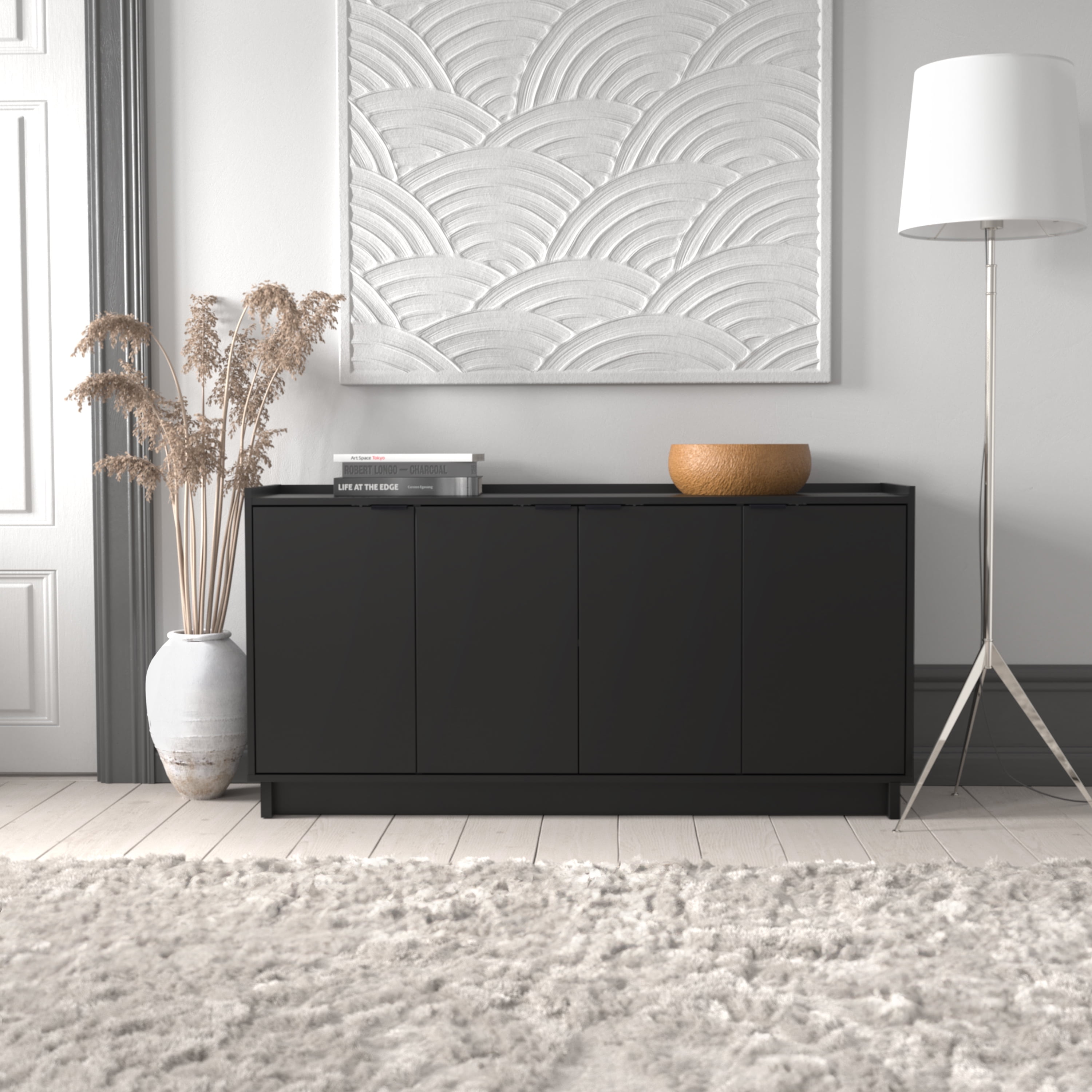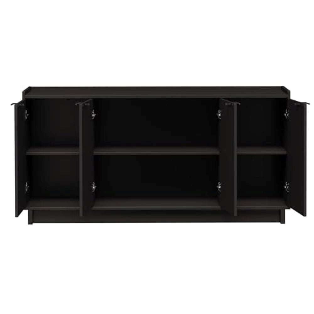 PREPAC RTA STORAGE & FURNITURE Prepac Simply Adjustable Shelves Modern 4 Door Console Table, Black Assembled Dimensions & Weight: Console Table measures 60″ W x 30″ H x 16″ D with a total weight of 113 lbs All pieces arrive ready to assemble Functional and Stylish: Features a modern design with clean lines and metal drawer pulls all in a lustrous black finish Durable Material for Long Term Use: Constructed from non toxic (CARB 2 Compliant) laminated composite woods with a sturdy medium density fiberboard backer for added strength Easy to clean and environmentally friendly Versatile Storage Cabinet: Customize this accent cabinet for various uses whether as a sideboard in your living or dining room or as a TV cabinet to store DVDs CDs and gaming accessories Deep Storage Cabinet: The 16″ D cabinet offers 34% more storage space than standard cabinets The middle shelf holds up to 25 lbs side shelves hold up to 20 lbs and the top can support up to 70 lbs