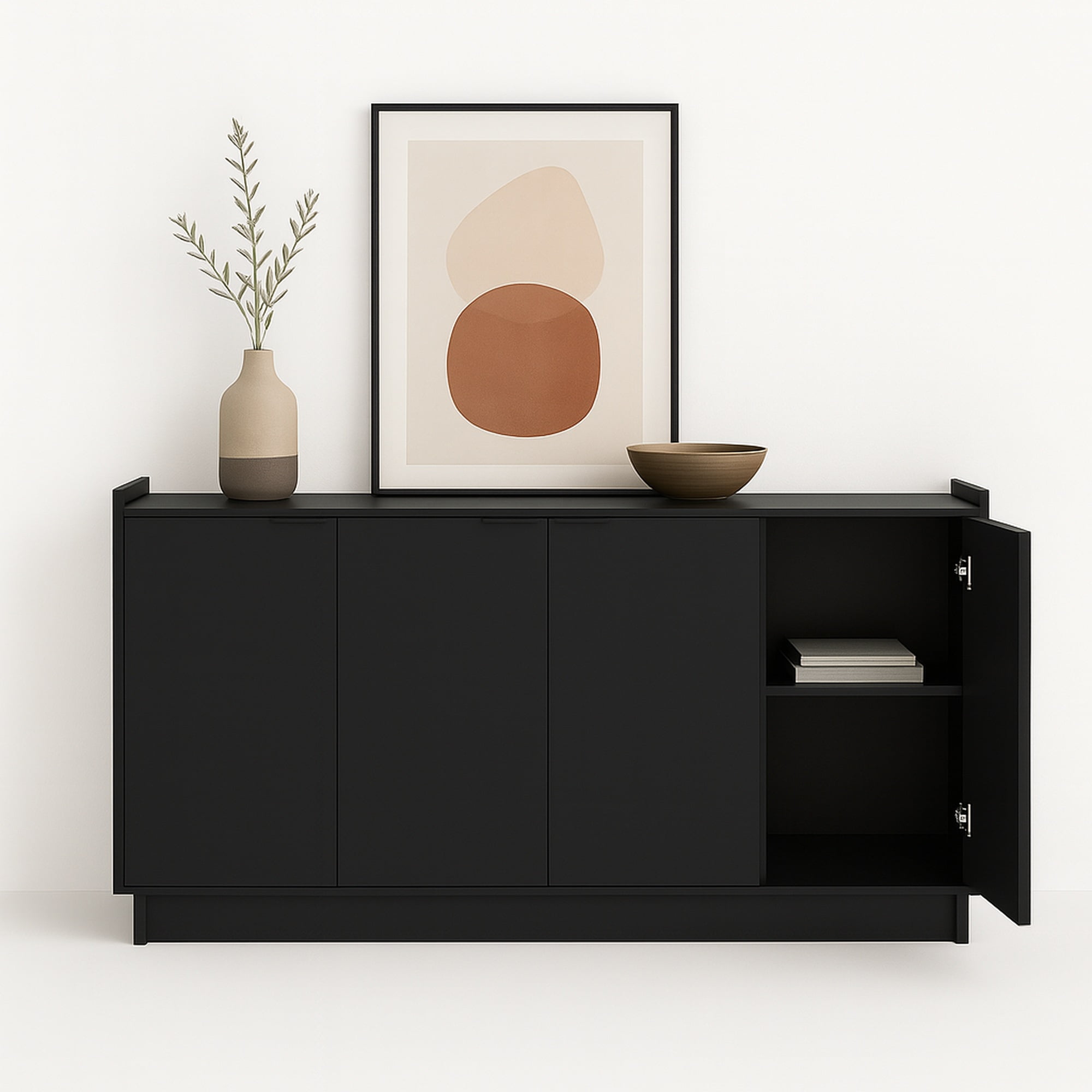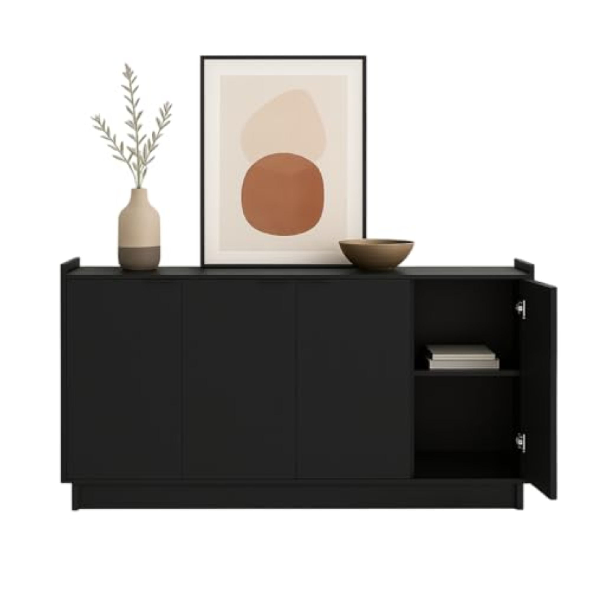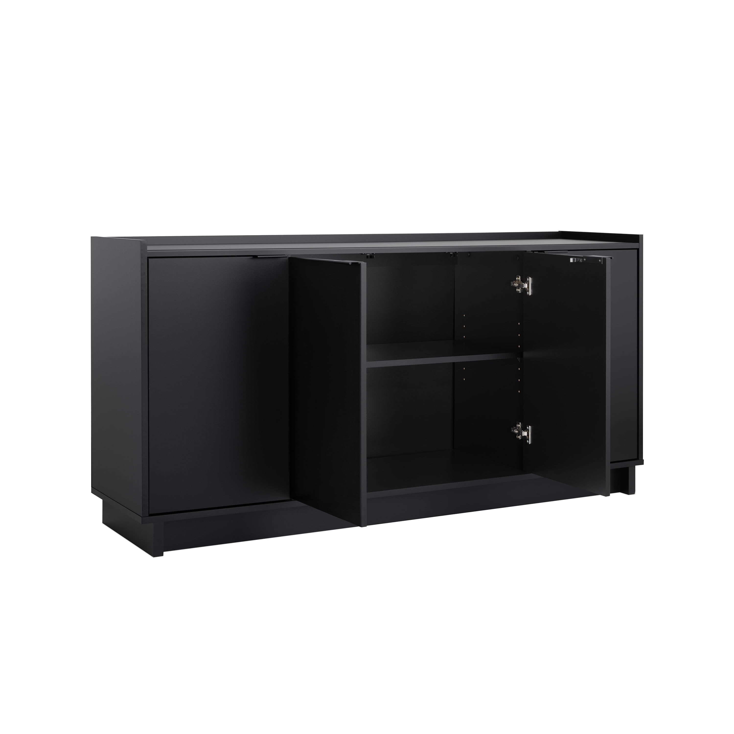 PREPAC RTA STORAGE & FURNITURE Prepac Simply Adjustable Shelves Modern 4 Door Console Table, Black Assembled Dimensions & Weight: Console Table measures 60″ W x 30″ H x 16″ D with a total weight of 113 lbs All pieces arrive ready to assemble Functional and Stylish: Features a modern design with clean lines and metal drawer pulls all in a lustrous black finish Durable Material for Long Term Use: Constructed from non toxic (CARB 2 Compliant) laminated composite woods with a sturdy medium density fiberboard backer for added strength Easy to clean and environmentally friendly Versatile Storage Cabinet: Customize this accent cabinet for various uses whether as a sideboard in your living or dining room or as a TV cabinet to store DVDs CDs and gaming accessories Deep Storage Cabinet: The 16″ D cabinet offers 34% more storage space than standard cabinets The middle shelf holds up to 25 lbs side shelves hold up to 20 lbs and the top can support up to 70 lbs