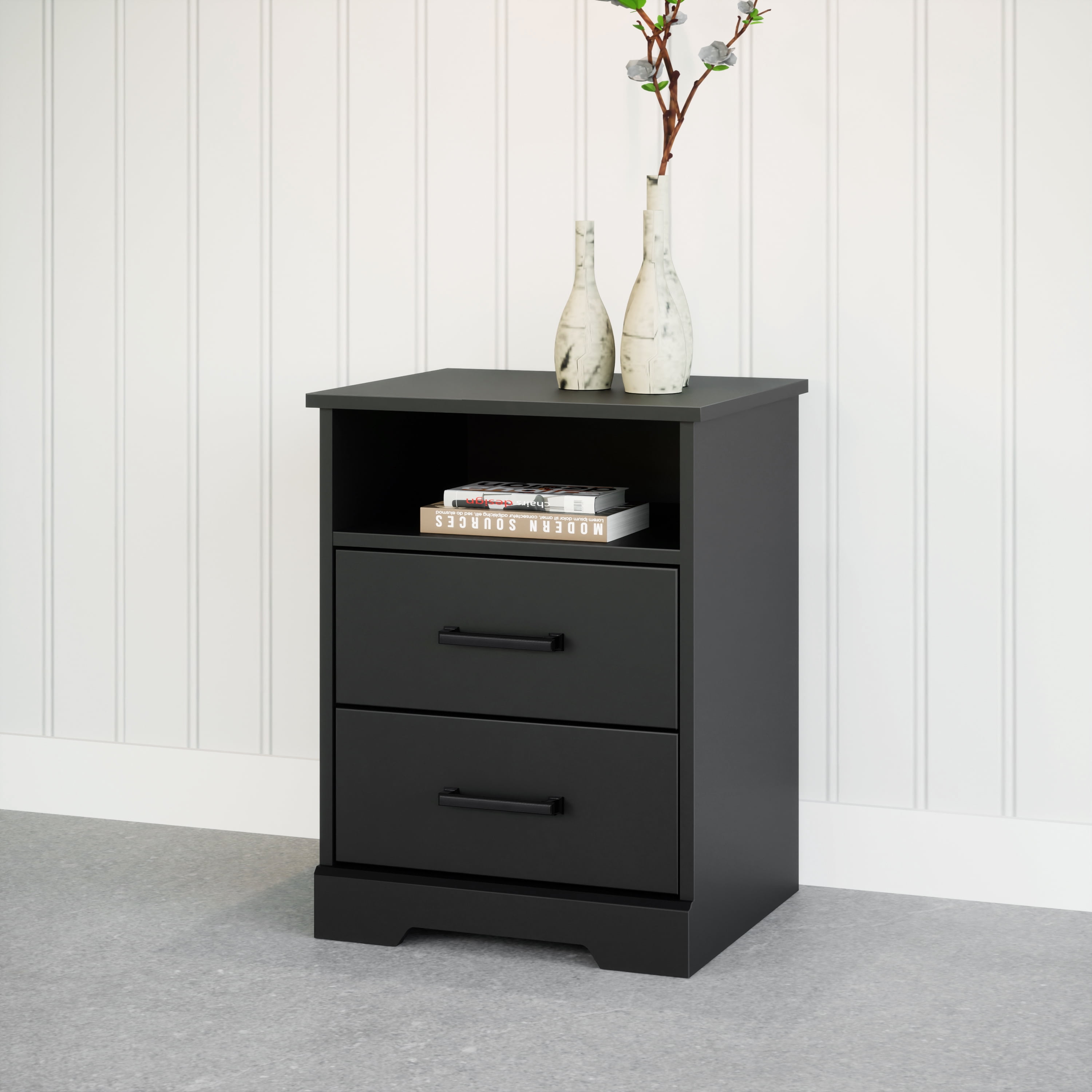 - CONTEMPORARY HEADBOARD WITH FARMHOUSE CHARM- Chic nightstand features an open shelf for those items you want easy access to, 2 drawers and a sturdy top that holds up to 25 pounds, all in a sleek black finish