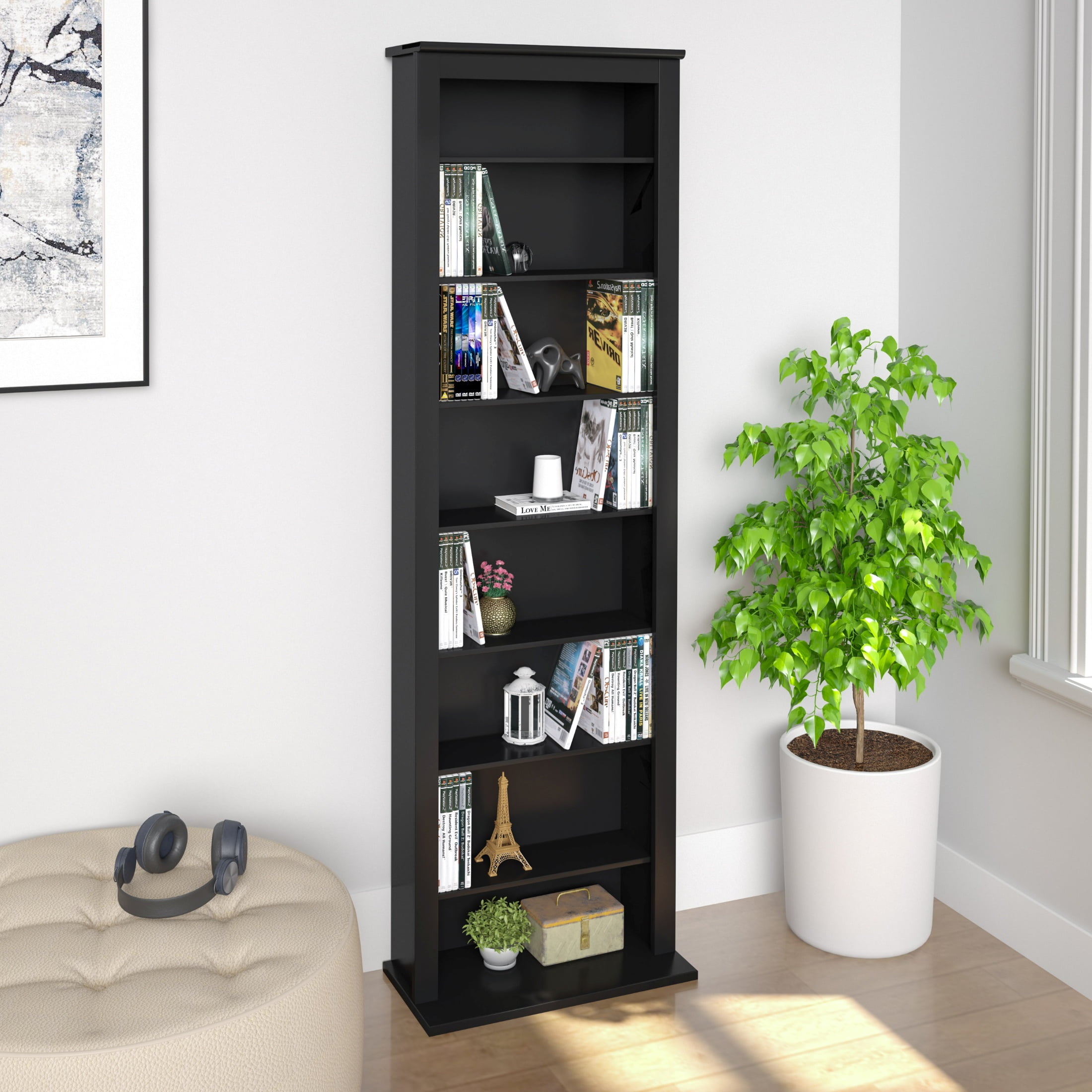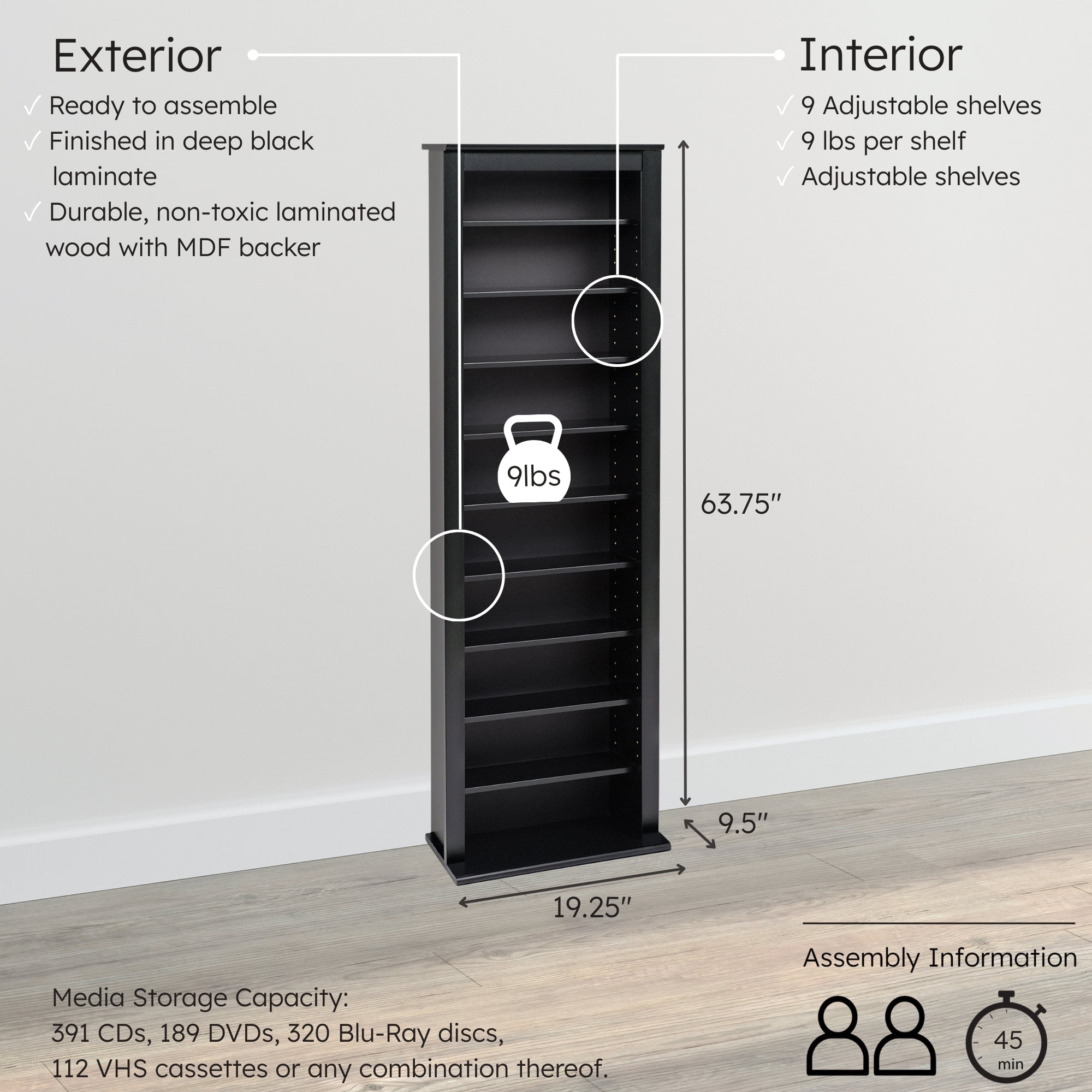 Finished in durable deep black laminate 9 adjustable shelves hold a variety of media sizes Capacity: 391 CDs, 189 DVDs, 320 Blu-Ray discs, 112 VHS cassettes or any combination thereof