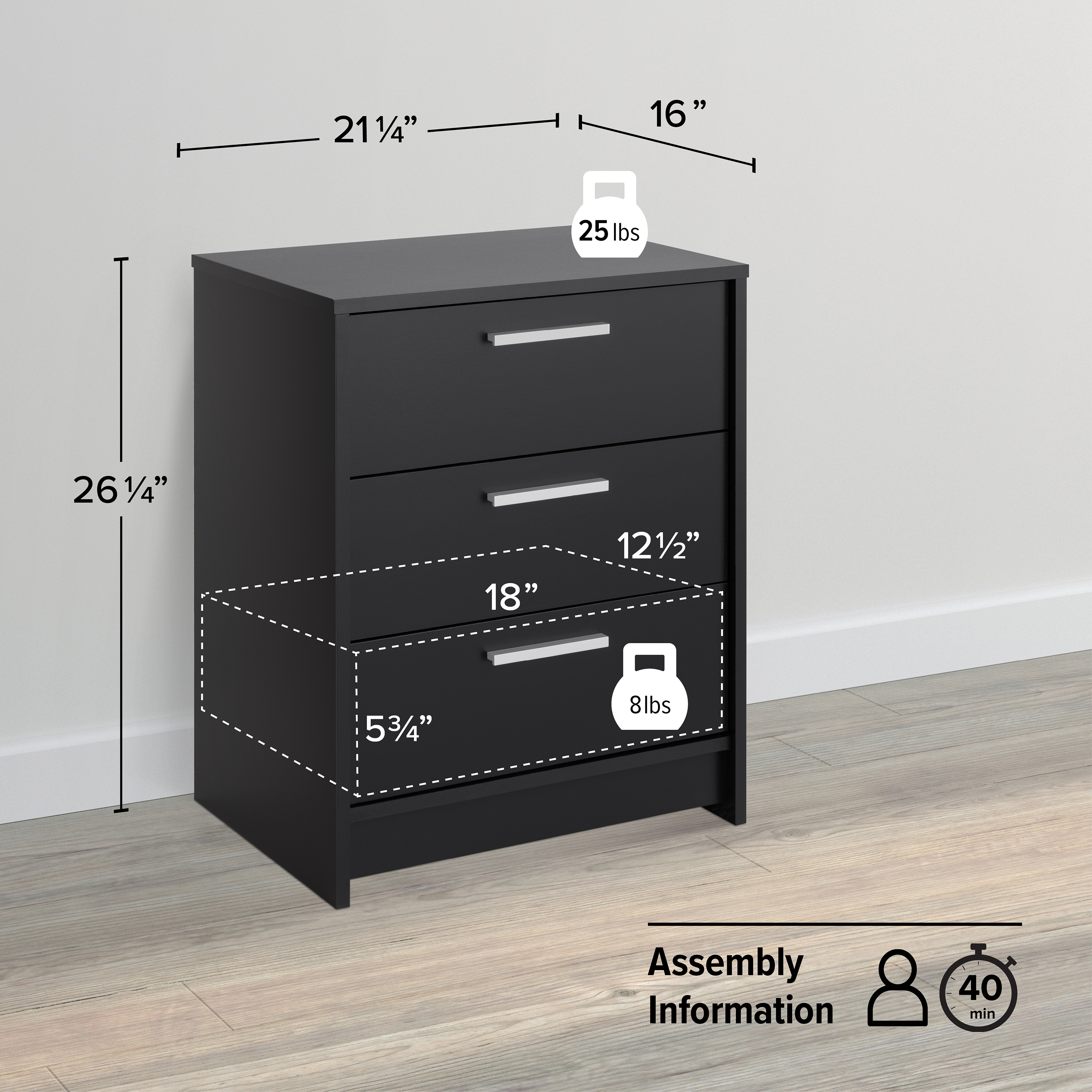 ASSEMBLED DIMENSIONS & WEIGHT- Nightstand- 16″ D X 21.25″ W x 26.25″ H, Total weight- 39 lbs., All pieces arrive ready to assemble in 1 Box SLEEK BEDSIDE TABLE WITH A FRESH, CONTEMPORARY DESIGN- Attractive nightstand that can easily double as a small dresser features 3 drawers and a sturdy top that holds up to 25 pounds, all in a lustrous black finish DURABLE MATERIAL FOR LONG TERM USE- Black nightstand is constructed from non-toxic (CARB 2 Compliant), laminated composite woods with a sturdy medium-density fiberboard backer for added strength- side table is easy to clean and environmentally friendly 3 DRAWER NIGHTSTAND WITH EASY GLIDING DRAWERS- Each carefully crafted night stand drawer features real wood pine drawer sides and runs smoothly on metal glides with a built-in safety stop MIX AND MATCH WITH EXISTING FURNITURE- The clean lines and brushed nickel pull handles of this bedside table make it a perfect accompaniment to any existing furniture in your home 5 YEAR WARRANTY- All Prepac products are backed by our 5 Year Limited Warranty- if your product arrives damaged or missing parts, contact us for replacement parts at no charge EASY TO ASSEMBLE: Nightstand includes detailed, step-by-step instructions & all necessary parts- the small dresser can typically be assembled in 40 minutes or less with basic hand tools by 1 person MADE IN NORTH AMERICA- Prepac furniture products are proudly made in North America for trusted quality & reliability and backed by our knowledgeable North America based customer support team PART OF THE STUDIO ESSENTIALS BEDROOM FURNITURE COLLECTION- Complete the look for your bedroom set with Studio Essentials Dressers available in multiple sizes and colors