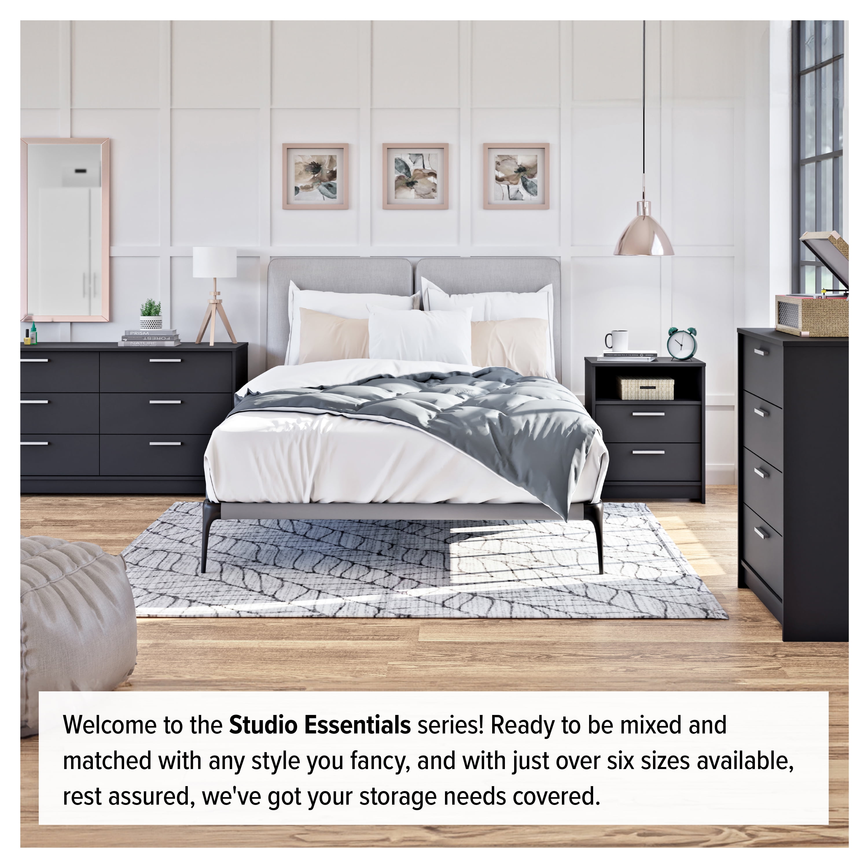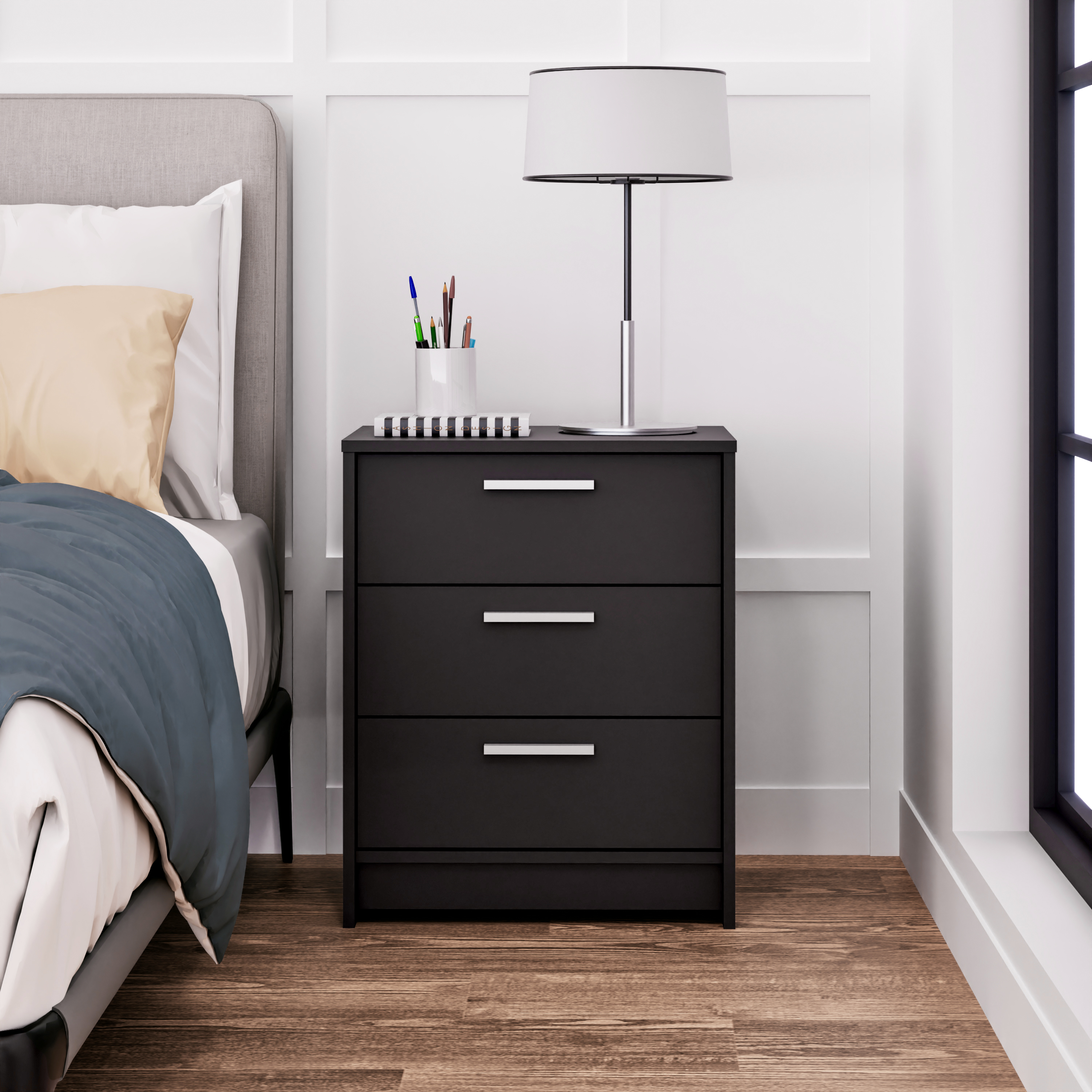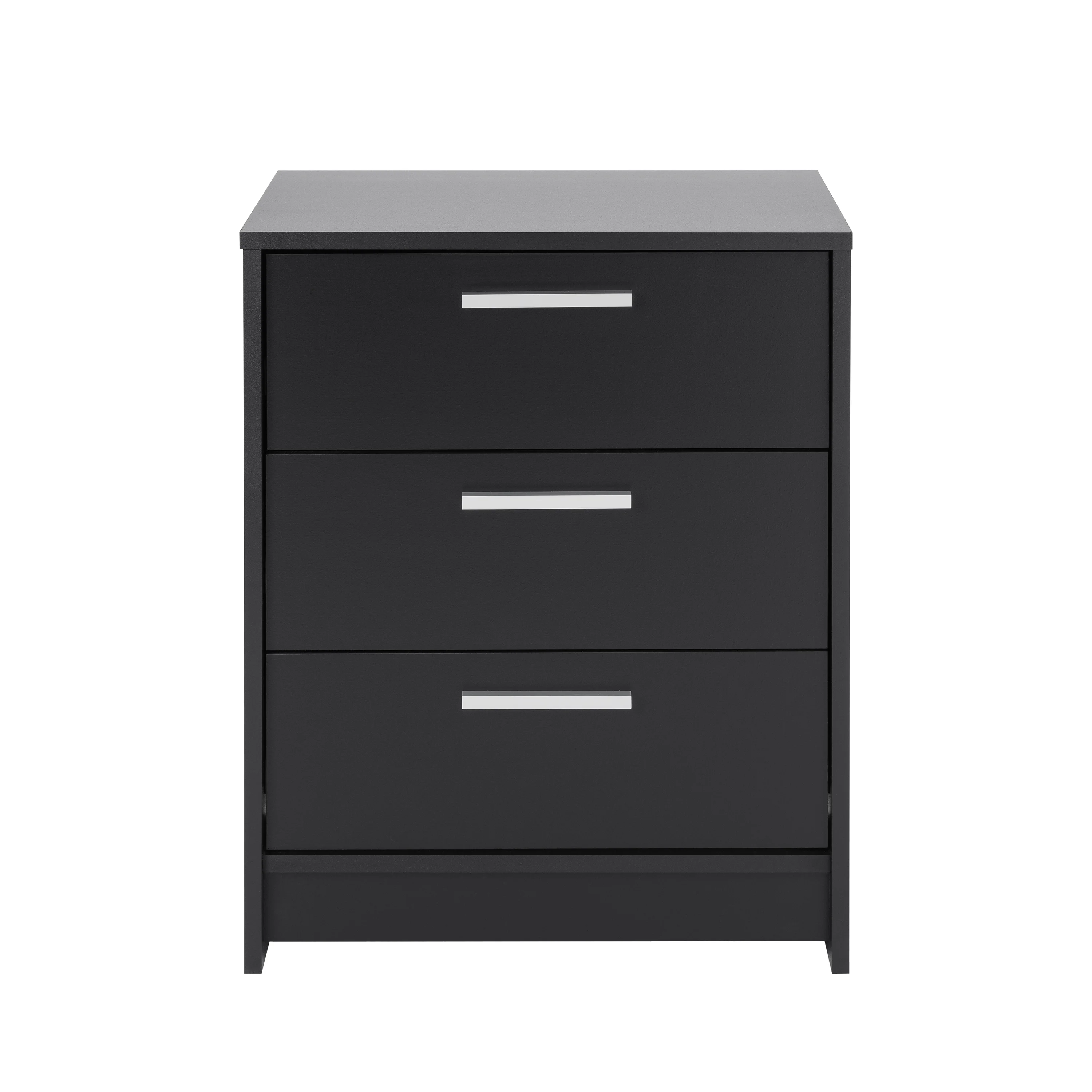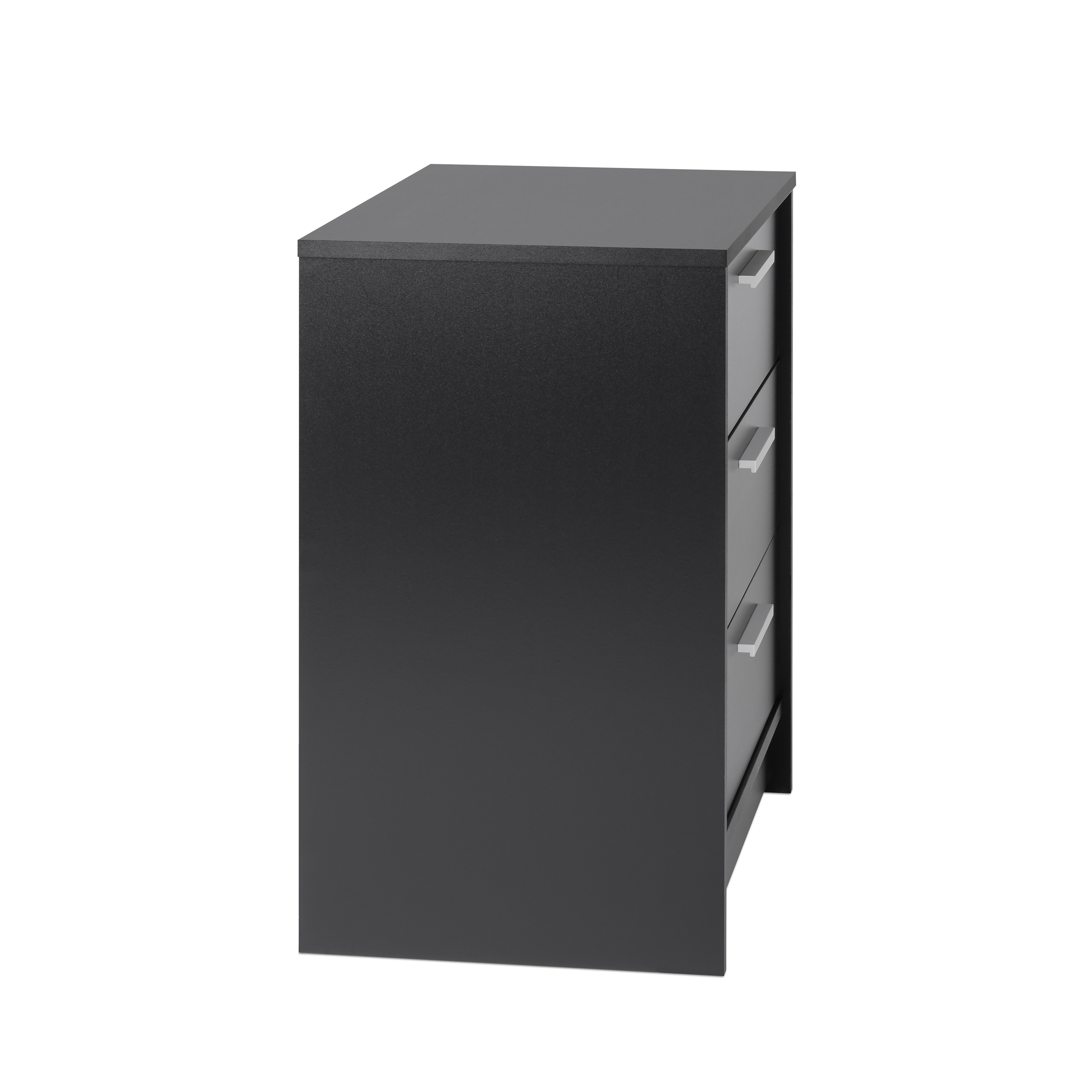 Reimagine your bedroom with this sleek, modern bedside table. The Studio Essentials 3 drawer night stand presents a combination of style and utility that can easily blend with your existing decor. With a dimension of 16″ D X 21.25″ W x 26.25″ H, this end table is the ideal choice not only for the bedroom but can be a decorative addition to your living room as well. The nightstand features three full-sized drawers, perfect as bedside tables with drawers or small night stands for storing your essentials. Constructed from CARB-compliant, laminated composite woods with a dependable MDF backer, every detail of this piece showcases quality, from its smooth-running metal glide drawers with built-in safety stops to its clear lacquered real wood drawer sides. This black table can be efficiently used as a storage cabinet in your walk-in closet or even the living room, adding to the decor while keeping clothes and other items organized. The Prepac Studio Essentials 3 drawer nightstand ships flat packed and can be assembled in roughly 40 minutes with 1 person. Pair it with other Studio Essentials collection items for a harmonious and stylized look in your home. With its blend of design, utility and efficiency, this black dresser can surely elevate the character of any room in your home.