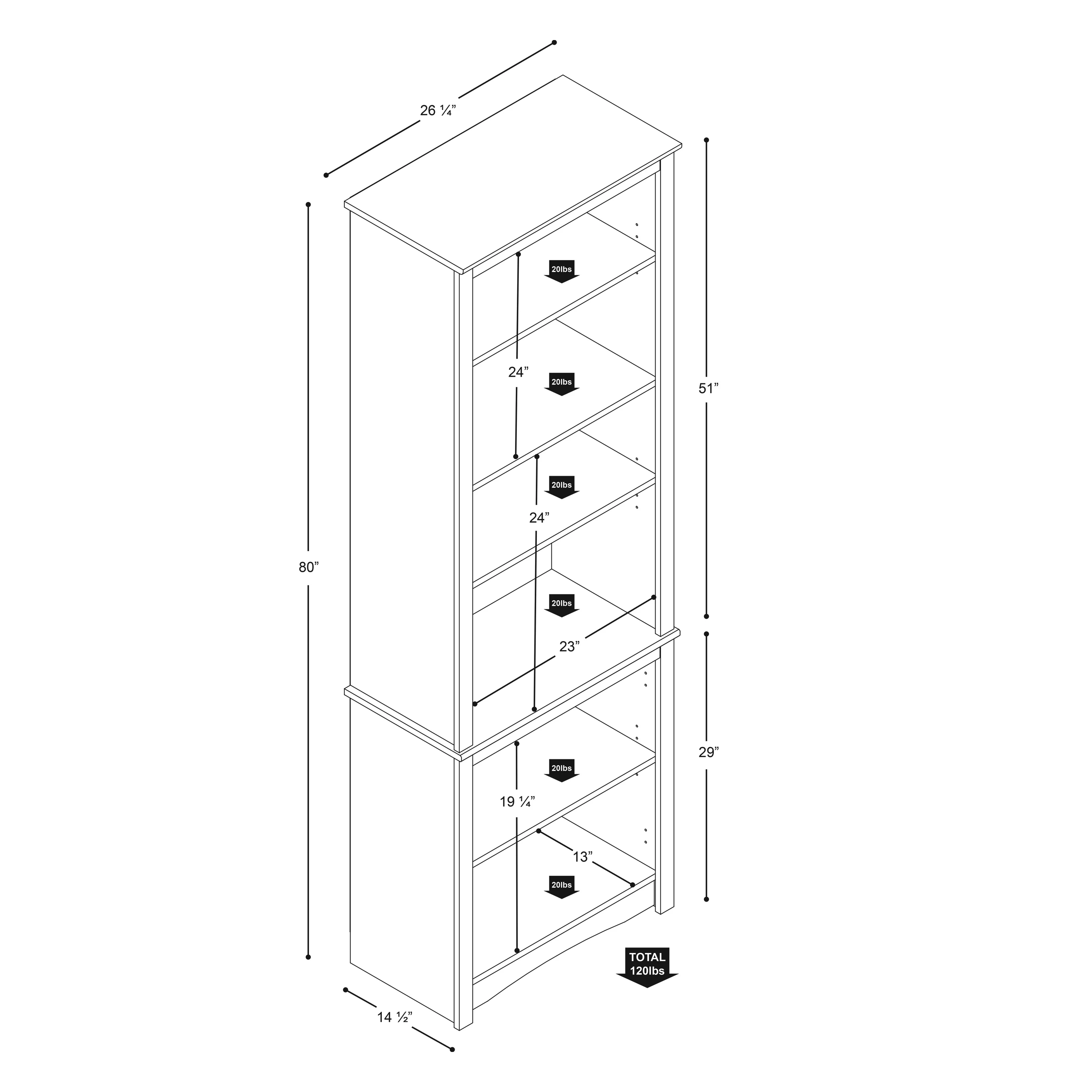 2 adjustable plus one fixed middle shelf in the top section One adjustable shelf in the lower compartment One adjustable shelf in the lower compartment Two or more units can be positioned side-by-side to create a library wall for increased storage Assembled Dimensions: 26.25 in. W x 80 in. H x 14.5 in. D Shelf Dimensions: 23 in. W x 13 in. D, 0.63 in. thick Weight Capacity: 20 lbs per shelf; Total 120 lbs Constructed from non-toxic, CARB-2 compliant, laminated composite woods with a sturdy MDF backer Ships Ready to Assemble, includes an instruction booklet for easy assembly Meets all safety standards