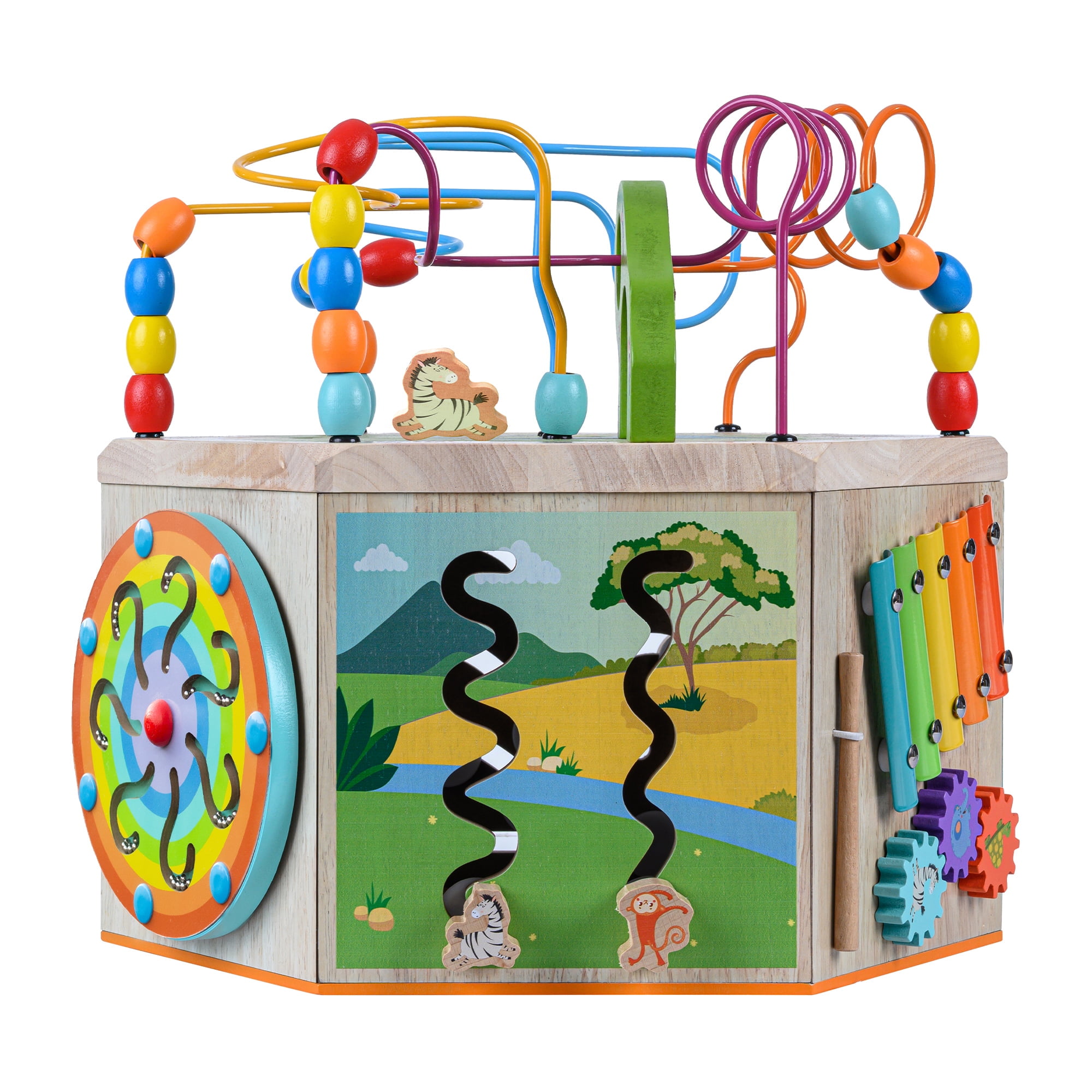 Multi activity-7 in 1 activity cube with a Xylophone, counting beads, spinning gears, animal & shape flip board, sliding tree, and a wire bead maze on top Brightly colored, ideal for little hands to explore Develop hand-eye coordination and fine motor skills Suggested for children 18 months and older, a quiet toy with no lights or little noise Dimensions: 15.71″ x 16.1″ x 16.1″