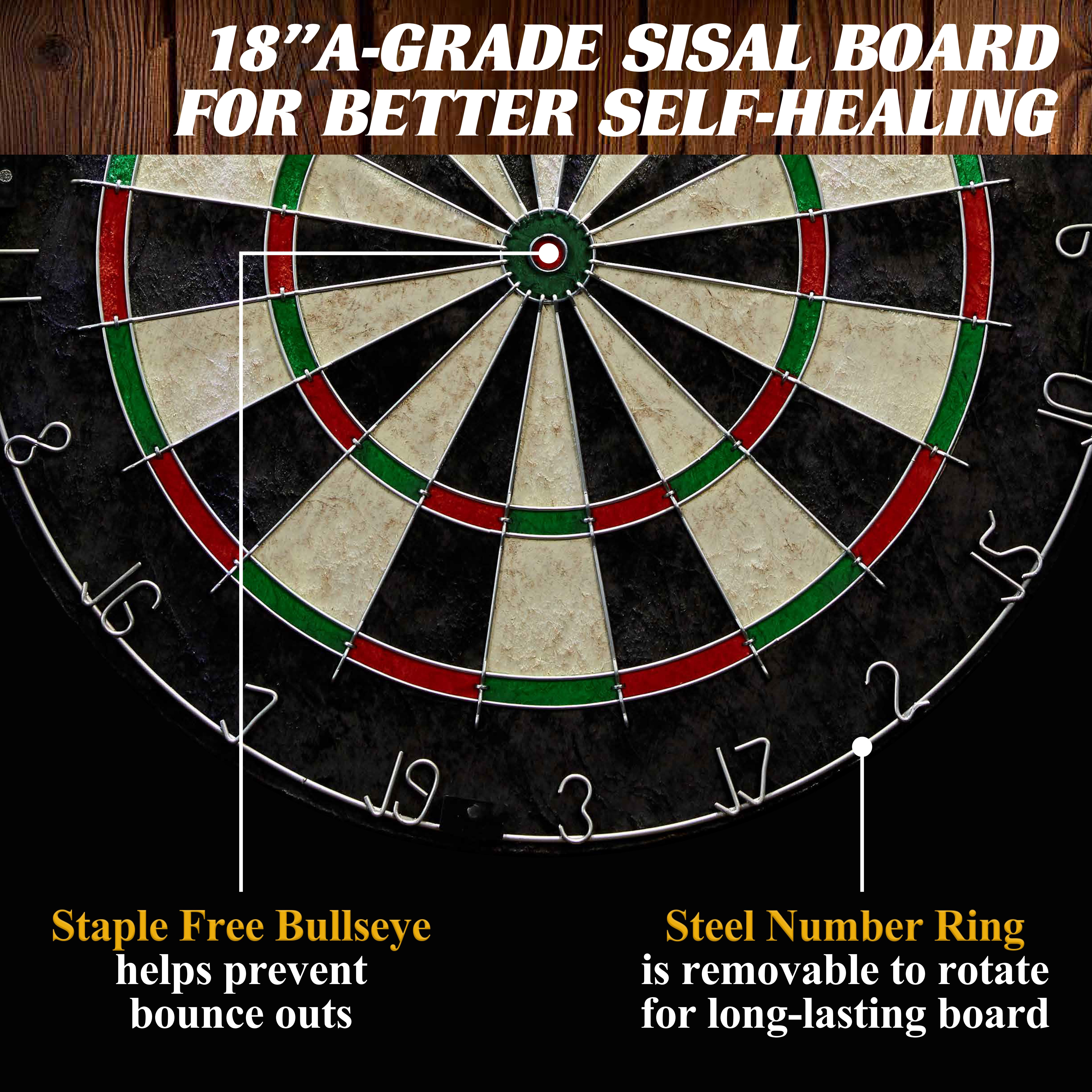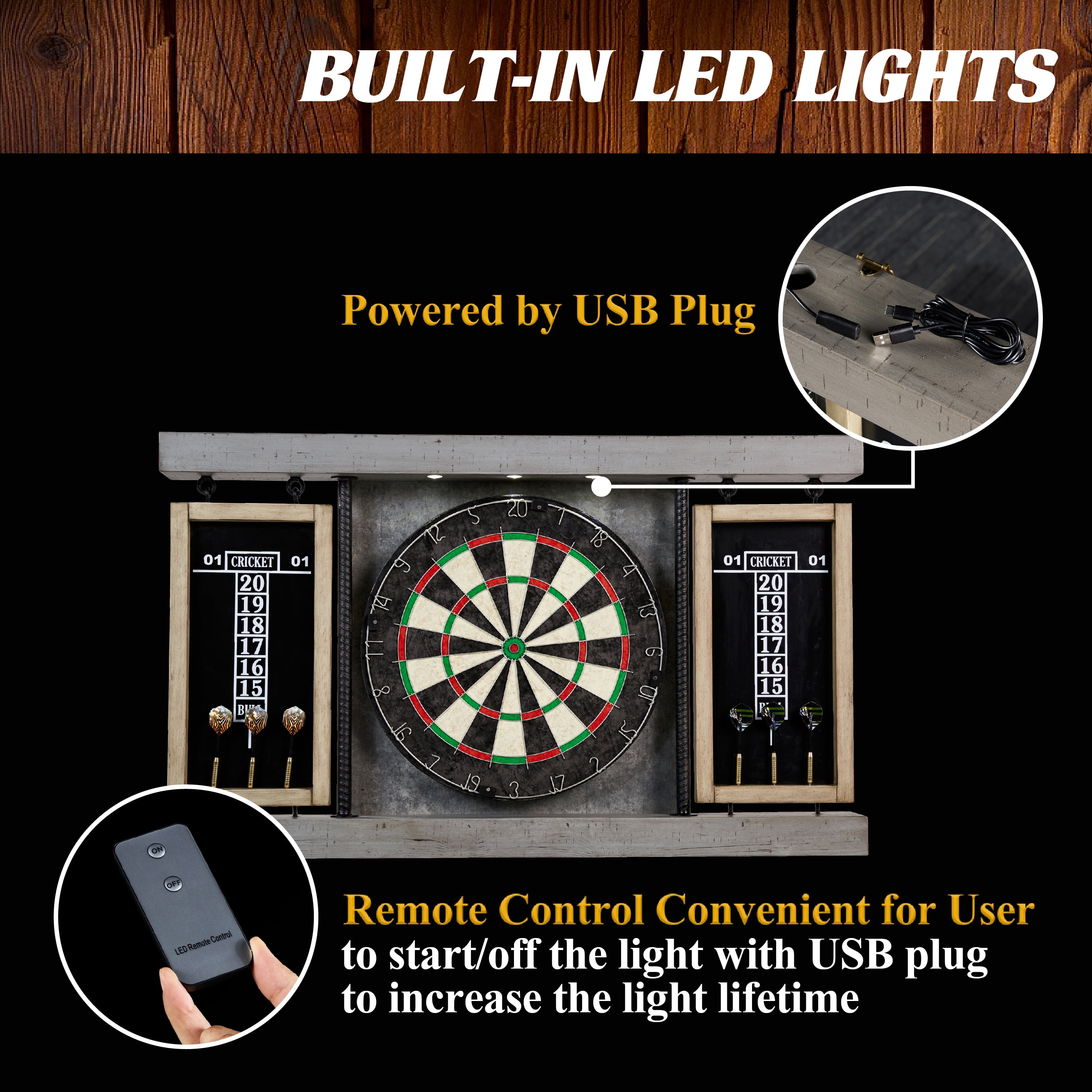 Barrington Prescott Collection 40″ Dartboard Cabinet Set with Steel Tip Darts Dimension: 40″ x 23.75″ x 3.375″ Official size bristle board 18″ dia. x 1-1/2″ thick Just hang the cabinet on the wall and secure the board and be done Comes with six steel tip darts, flights and one dry-erase marker for the built-in scoreboards Furniture quality pine wood veneer painted frame with distressed lumber finish Two strong, solid rebar, steel support poles are not only heavy duty but modern looking Black flannelette cloth attached to the back of the target to protect the board Includes 18 Inch A-grade SISAL board which provides high quality self-healing Features staple free bulls-eye which helps prevent bounce outs Built-in two easy wipe cricket scoreboards Built-in LED lights provide a professional atmosphere while playing Powered by a USB plug and comes with a remote control