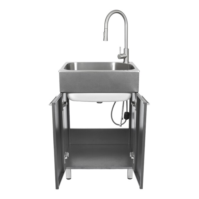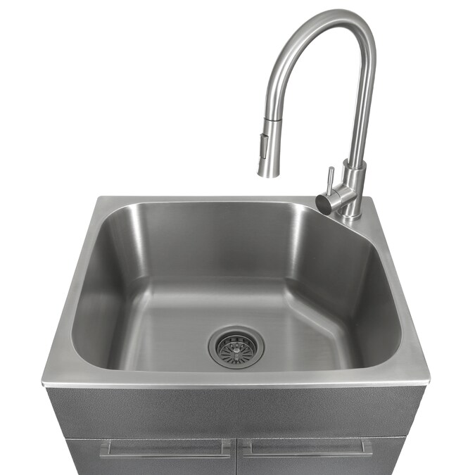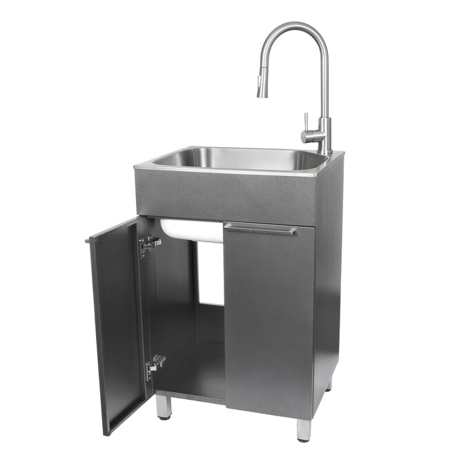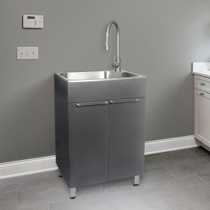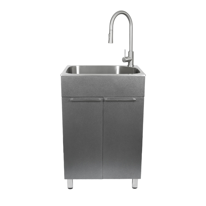 - Includes: storage cabinet, utility sink with 3.5 in. strainer and pull-down faucet with garden hose adapter