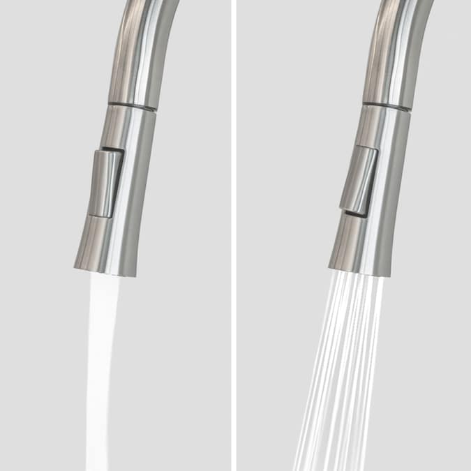 - Faucet: 304 premium stainless steel construction in brushed nickel finish, 1.8 GPM flow rate with ceramic cartridge, single-handle temperature and flow control, convenient pull-down spray head with two stream modes