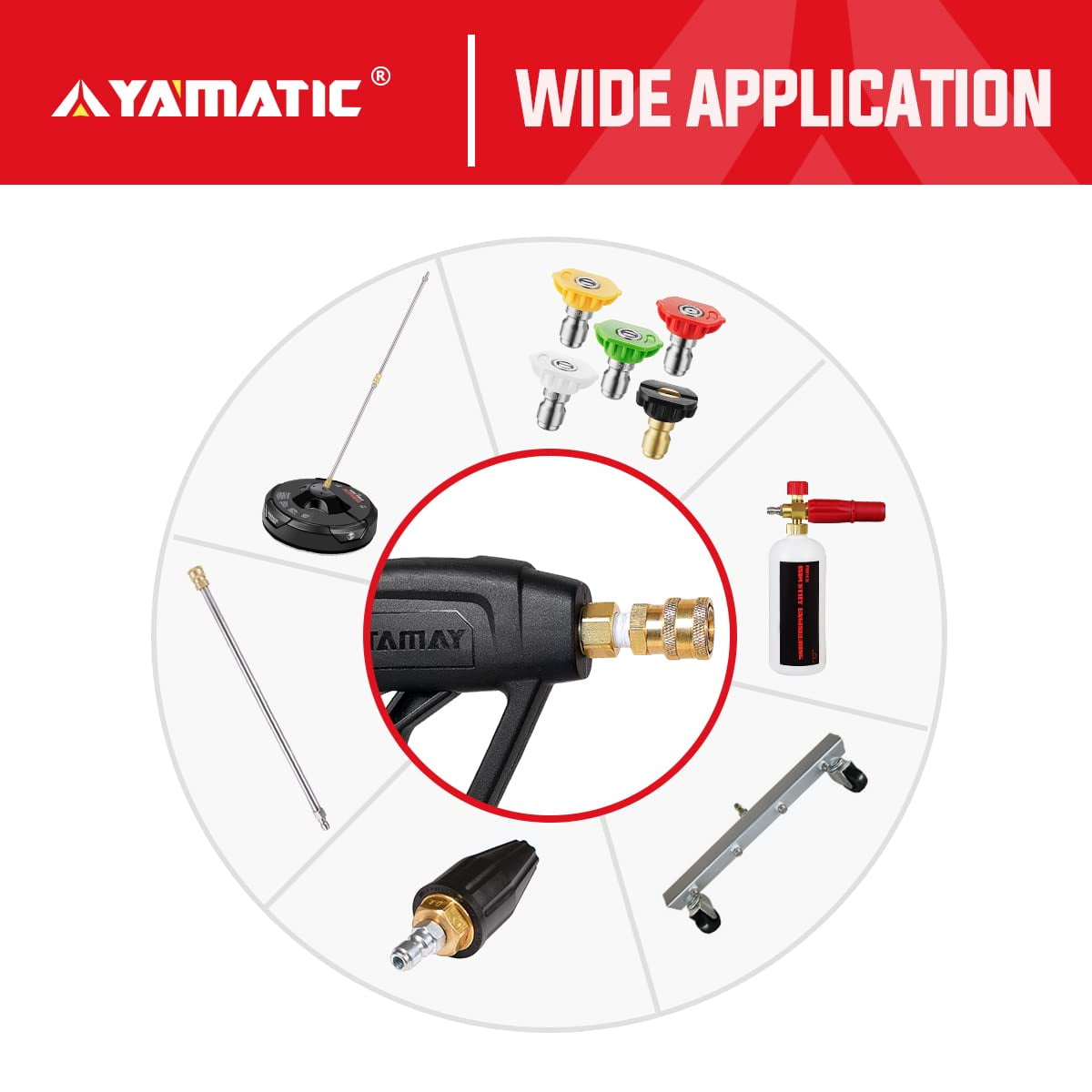 YAMATIC High Pressure Washer gun with Swivel designed for homeowners and professionals use, especially high gas pressure washers. Compatible with SIMPSON Cleaning, Briggs & Stratton, Pressure Pro, CRAFTSMAN, Champion, Honda, Excell, and more high-power washers. At the same time, swivel Feature helps you to say goodbye to kinks mess and enjoy cleaning work. YAMATIC pay attention to detail and the investment made to ensure the reliability and durability of the product. This pressure washer gun manufactured with shockproof reinforced material, designed with an easy-pull trigger and comfortable grip preventing hand fatigue on those extended cleaning jobs. High-quality solid brass components for maximum strength to ensure built to last. This not only extends the pressure washer wand lifespan but also saves you time and money by eliminating the need for frequent pressure washer gun replacements. We offer a 12-month product warranty and 24/7 customer service to ensure your satisfaction. If you have any questions or concerns during your usage, please do not hesitate to contact us. We are here for you. SPEC: Rated Working Pressure: 4000 PSI Max Working Pressure: 4500 PSI Working Temperature: Up to 140 °F / 60°C Max Flow: 8 GPM Outlet: 1/4″ Female NPT . Inlet: Swivel 3/8″ Male NPT Plug PLEASE NOTE: Not fit for garden regular water hose, and faucet Package Include: 1* Pressure Washer Lance Kit 1* M22-14mm Male to 3/8″ Socket 1* 1/4″ Quick Connector 5* High Pressure Spray Nozzle Tips 1* Teflon Tape.
