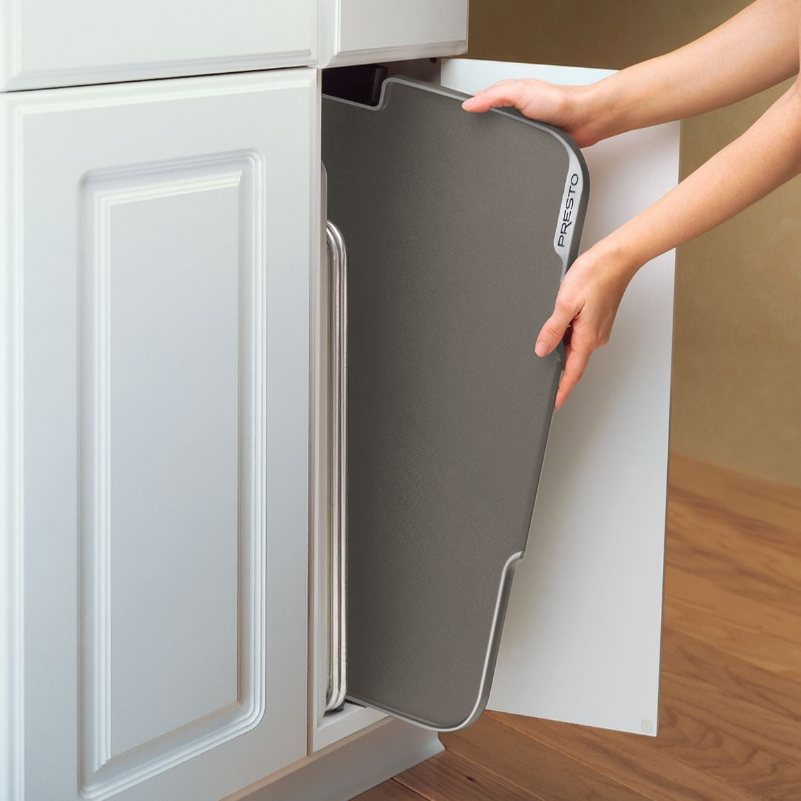Presto 22-inch Electric Griddle with Removable Handles 07062 makes enough food for the entire family and still stores neatly in the kitchen cabinet. A special textured ceramic cooking surface provides enhanced nonstick performance and easier cleaning for breakfast, lunch, dinner, and entertaining. Removable handles make it simple to clean and compact to store. Simply open the latch clips to detach handles from base. With the handles removed, the griddle stores efficiently in most standard 18-inch kitchen cabinets. Control Master heat control automatically maintains the desired cooking temperature. The heavy cast aluminum griddle is virtually warp-proof. Slide-out drip tray removes for quick cleanups, and griddle is fully immersible with the heat control detached. Presto 22” Electric Griddle with removable handles condition is new.