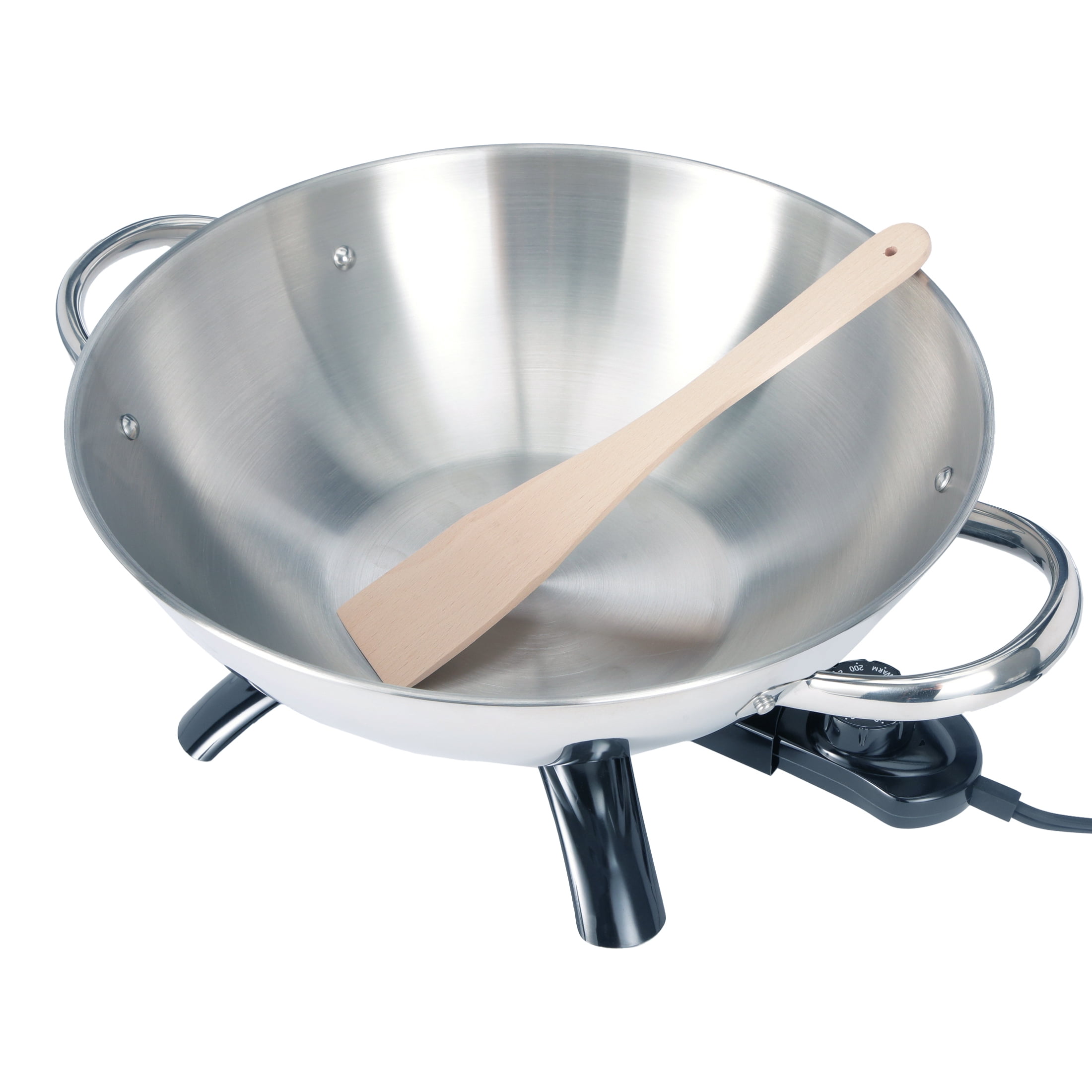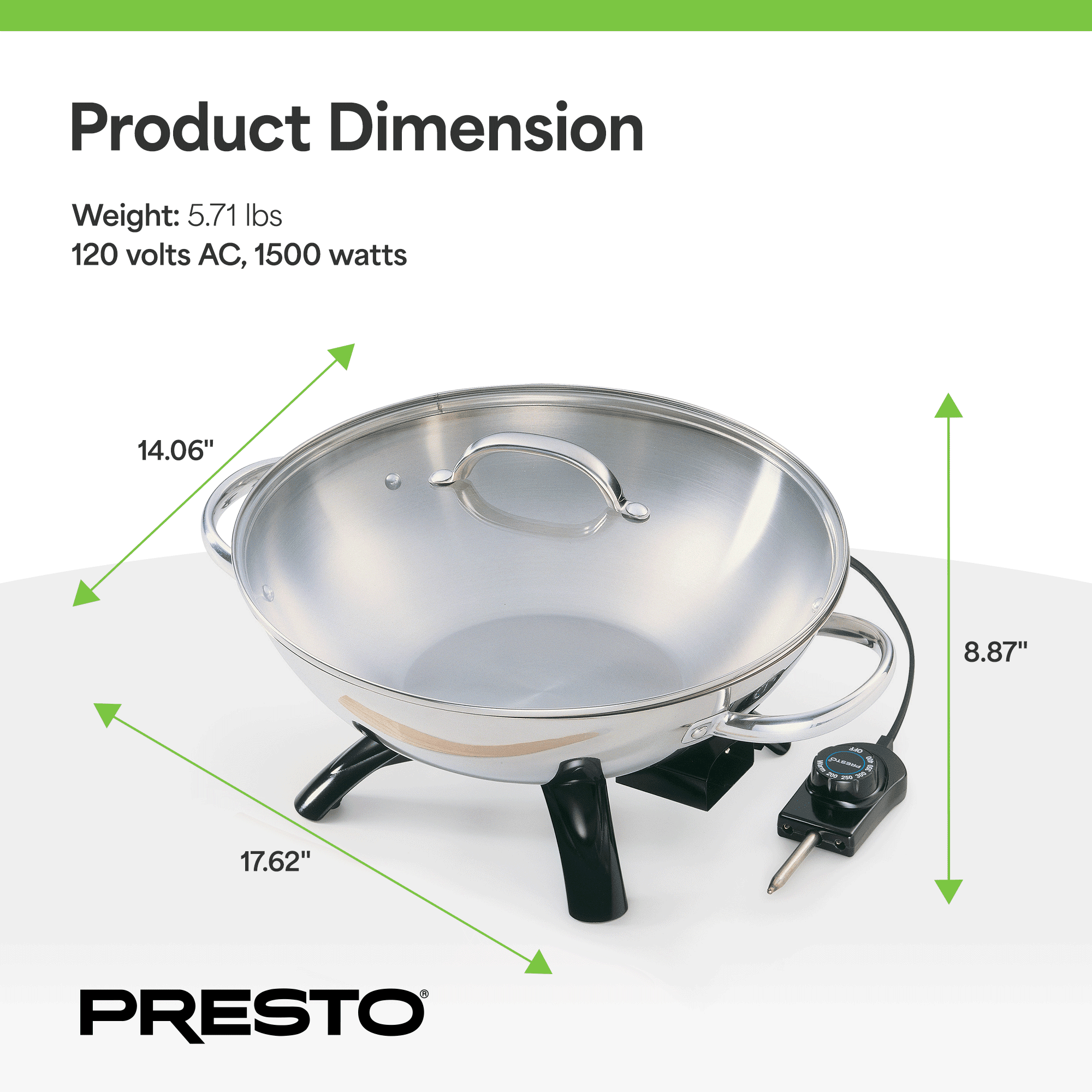 Presto Stainless Steel Electric Wok 05900 Make healthy stir-fry meals, fast and easy Stainless steel wok with an aluminum-clad base for quick, uniform heating 1500-watt heating element provides the high searing temperature needed for stir-fry cooking Control Master® heat control maintains accurate cooking temperatures Tempered glass cover with stainless steel rim and handle Fully immersible and dishwasher safe Includes a long-handled wooden spatula 17.62″ W x 14.06″ D x 8.87″ H, weight 5.71 lb Presto Stainless Steel Electric Wok condition – New
