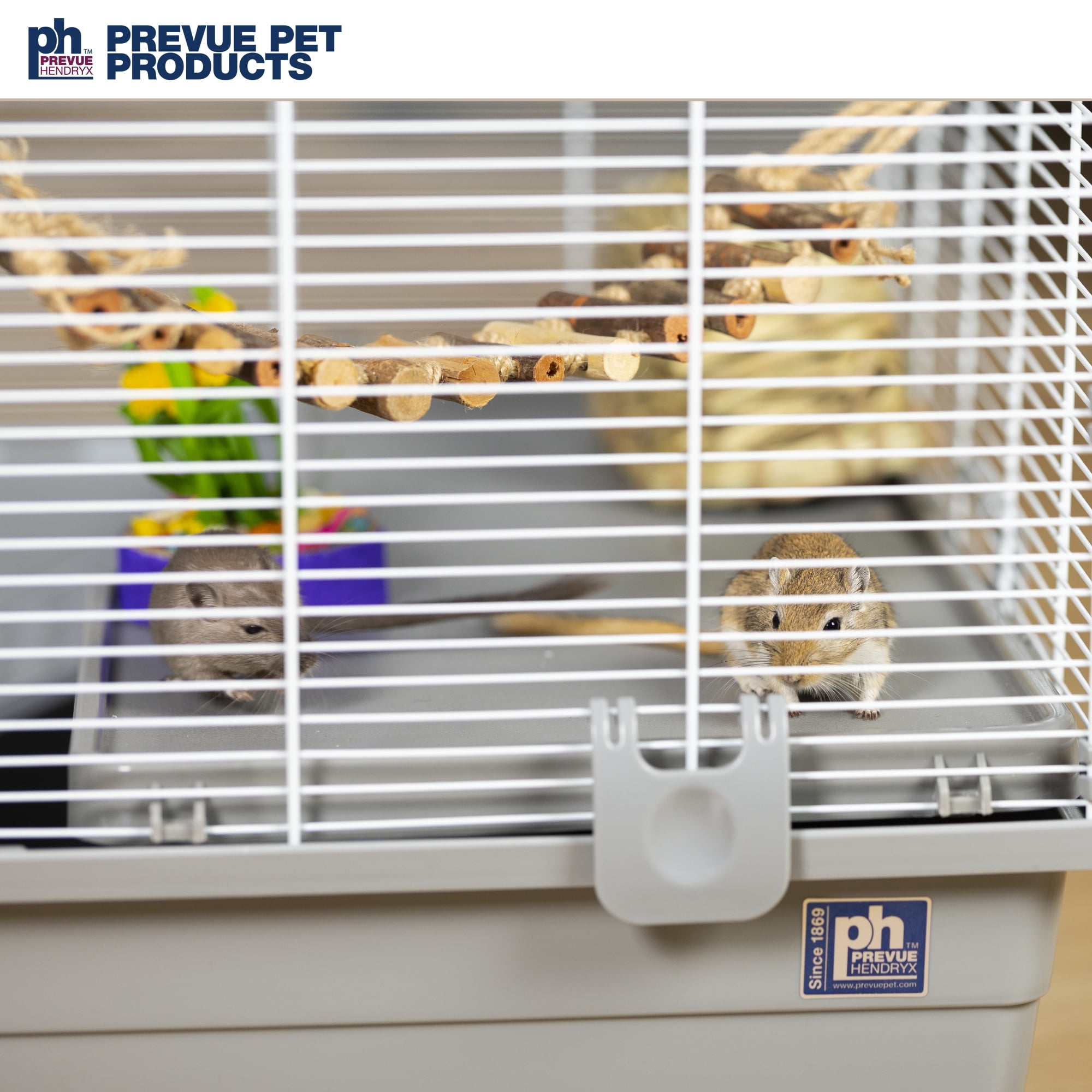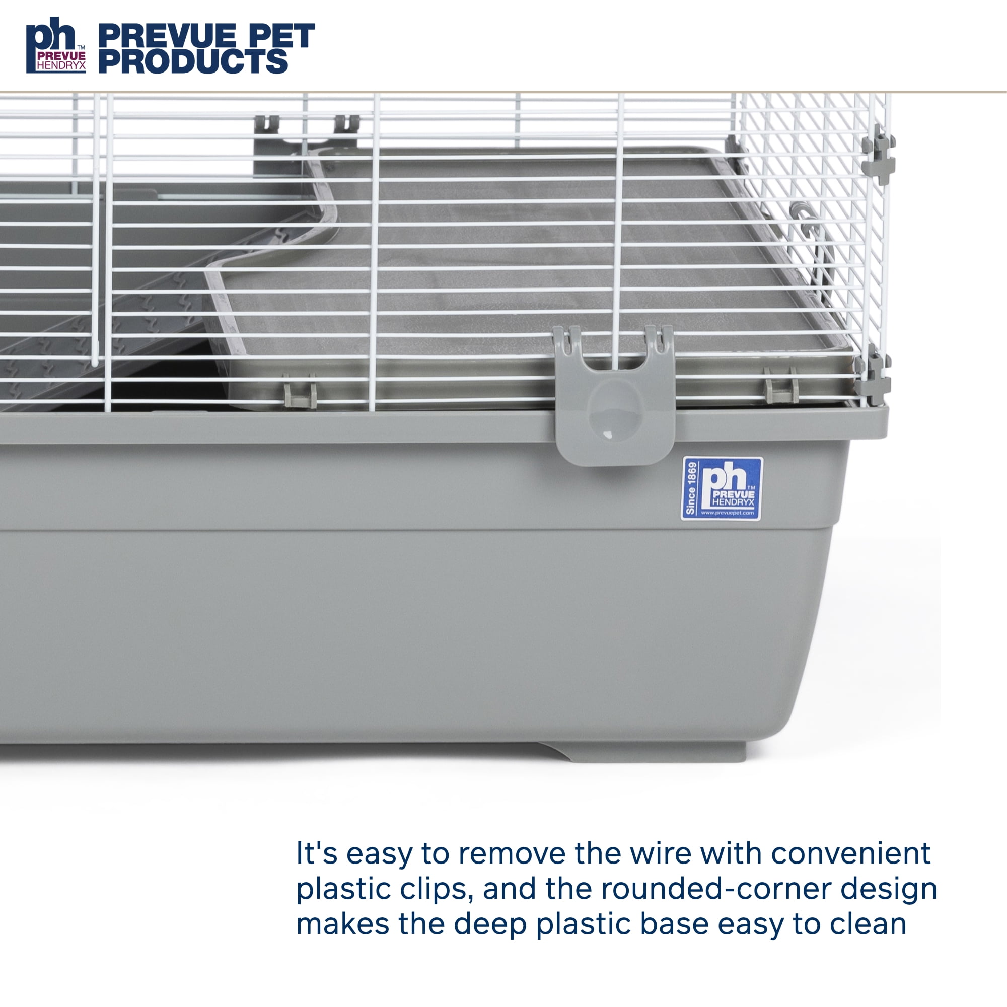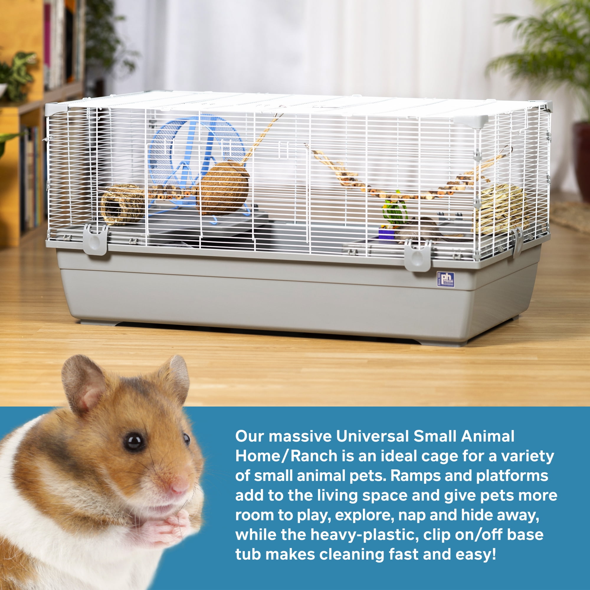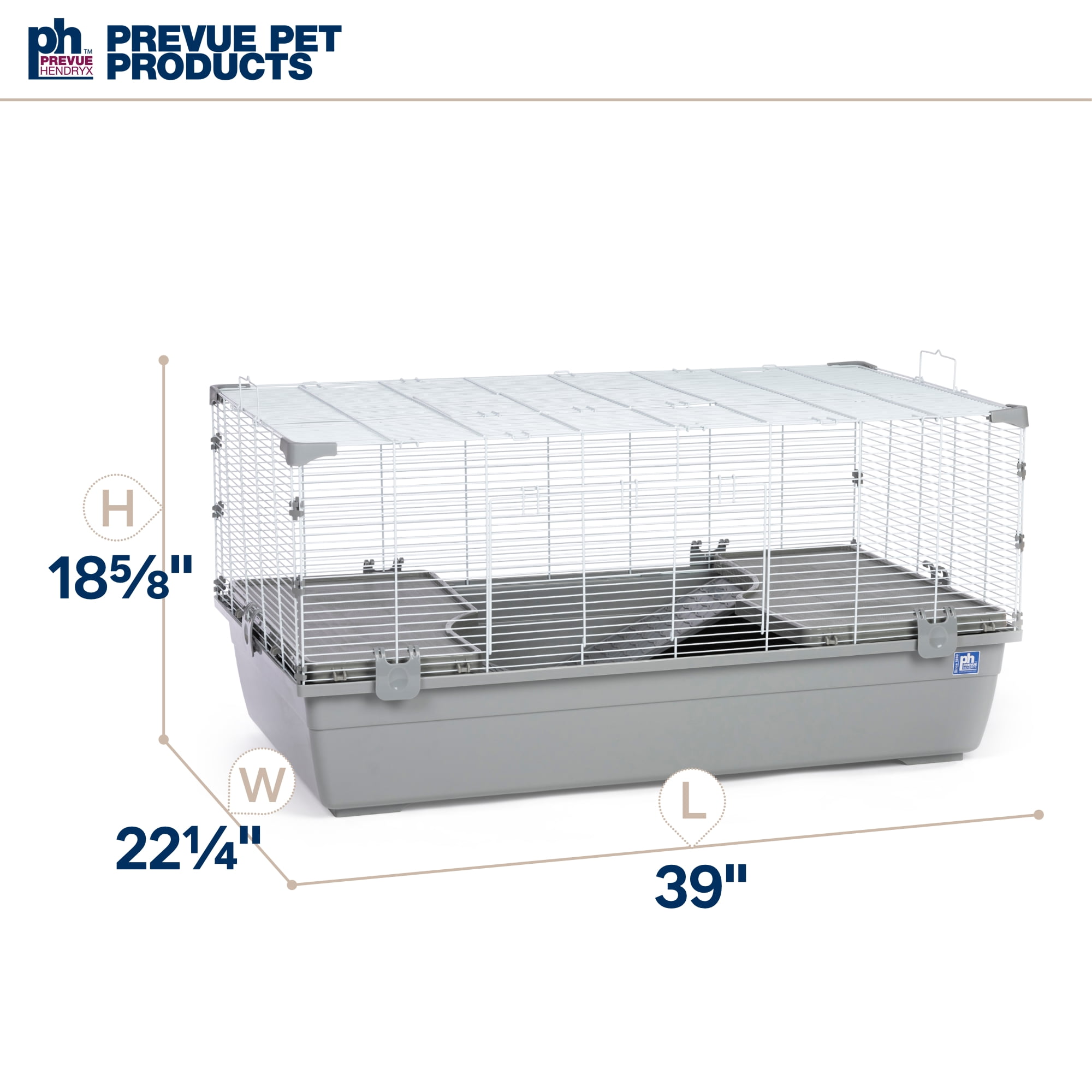 Prevue Pet Products Universal Small Animal Home / Ranch #5524 is a very large cage with tight 3/8″ wire spacing, making it ideal for a wide variety of small animals including hedgehog, hamster, gerbil, rat and mouse. This large home has a 6″ deep tubby base with rounded edges, which contains mess and is easy to clean. Your pet will get plenty of exercise exploring the tubby and climbing up and down the two sturdy plastic ramps and two large plastic platforms. Each platform measures 21″ long by 11 5/8″ wide and each ramp measures 15 1/4″ long by 5″ wide. Pet parents can comfortably carry the cage using the integrated carrying handles. Interact with your pet through one of two large doors located on the front and top of the cage. Each door measures 14 3/4″ long and 8″ wide and closes securely with a wire latch locking mechanism. The mesh clips-together, is easy to assemble and is held securely in place with six base clips. Expertly designed in the USA, all Prevue cages undergo independent lab testing to conform to the highest levels of pet safety. Lightweight for easy handling and convenient traveling, our Universal Small animal Ranch measures 39 1/4″ long, 22″ wide and 18 5/8″ high with 3/8″ wire spacing. Features Tight 3/8″ wire spacing! Great for a wide variety of small animals including hamster, gerbil, mouse Spacious tubby base with room for accessories Includes two ramps (15 1/4″ L x 5″ W) and two platforms (21″L x 11 5/8″W) Large front access door (14 3/4″L x 8″W) and large rooftop access door (14 3/4″L x 8″W) No gaps or pinch points Convenient carrying handles Easy clip-together assemblySpecifications Color: Gray base & white mesh Wire Spacing: 3/8″ Overall Size: 39 1/4″ L x 22″ W x 18 5/8″ H Animal Sizes: X-Small, Small, Medium Weight: 21 lbs – SKU: PVPP1314