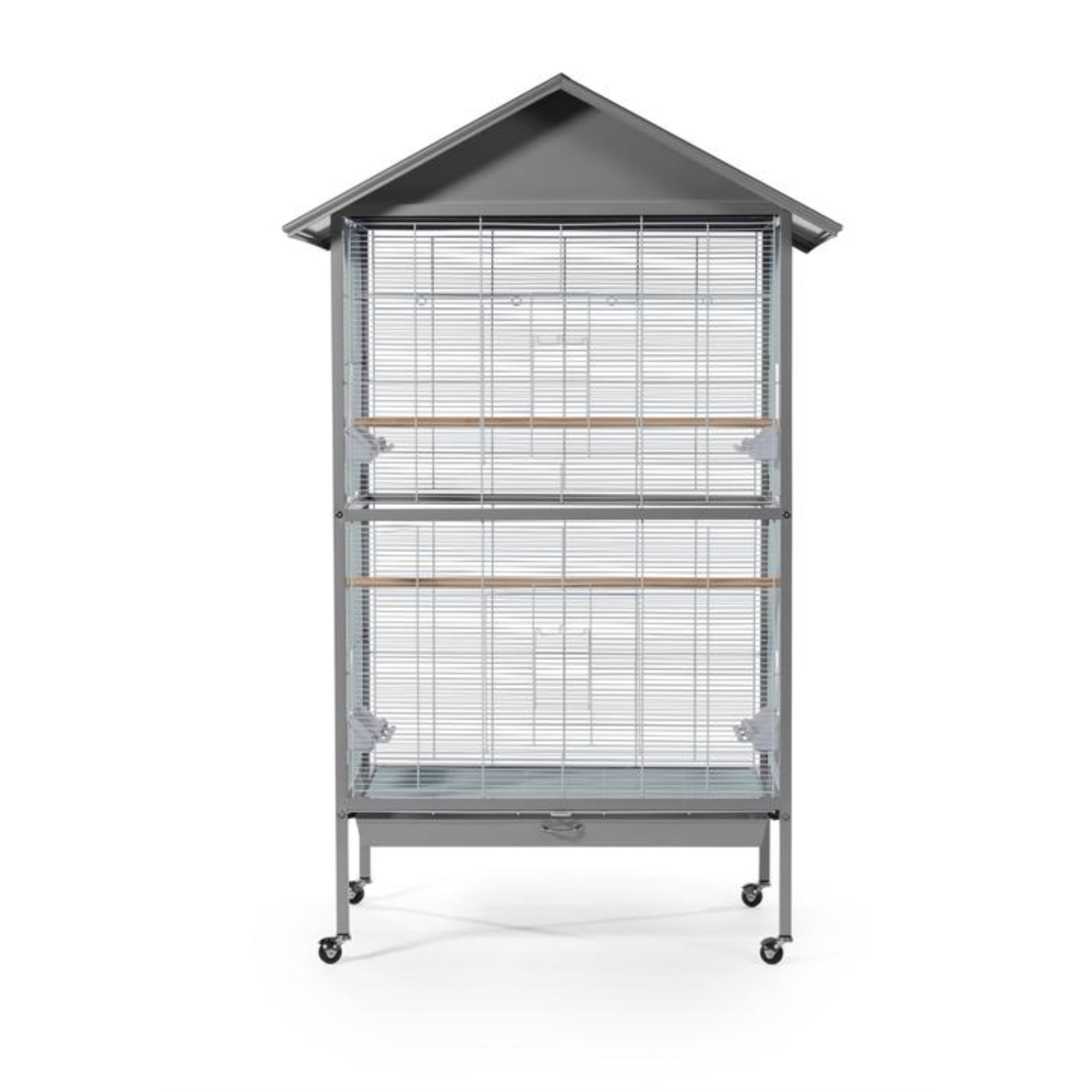 Prevue Pet Products Charming Aviary in Metal Gray F036 Comes with a toy bar for easy toy hanging and two wooden perches Easy to clean Ideal for small to Medium size birds Attractive house-style roof provides shade and a secure spot for hiding 35 3/8″L x 23 5/8″W x 68 5/8″H. Roof overhang 42 3/8″L x 29 3/4″W