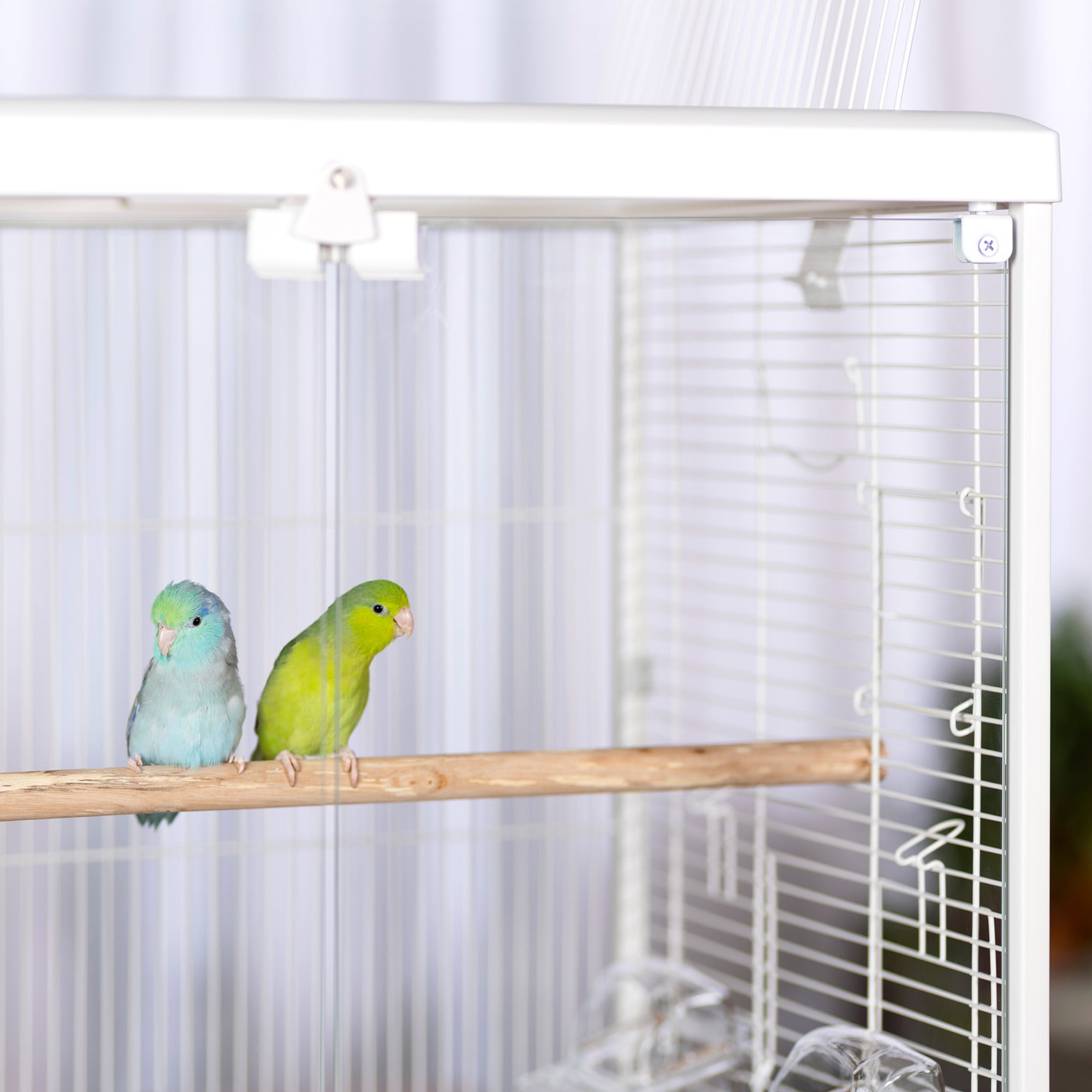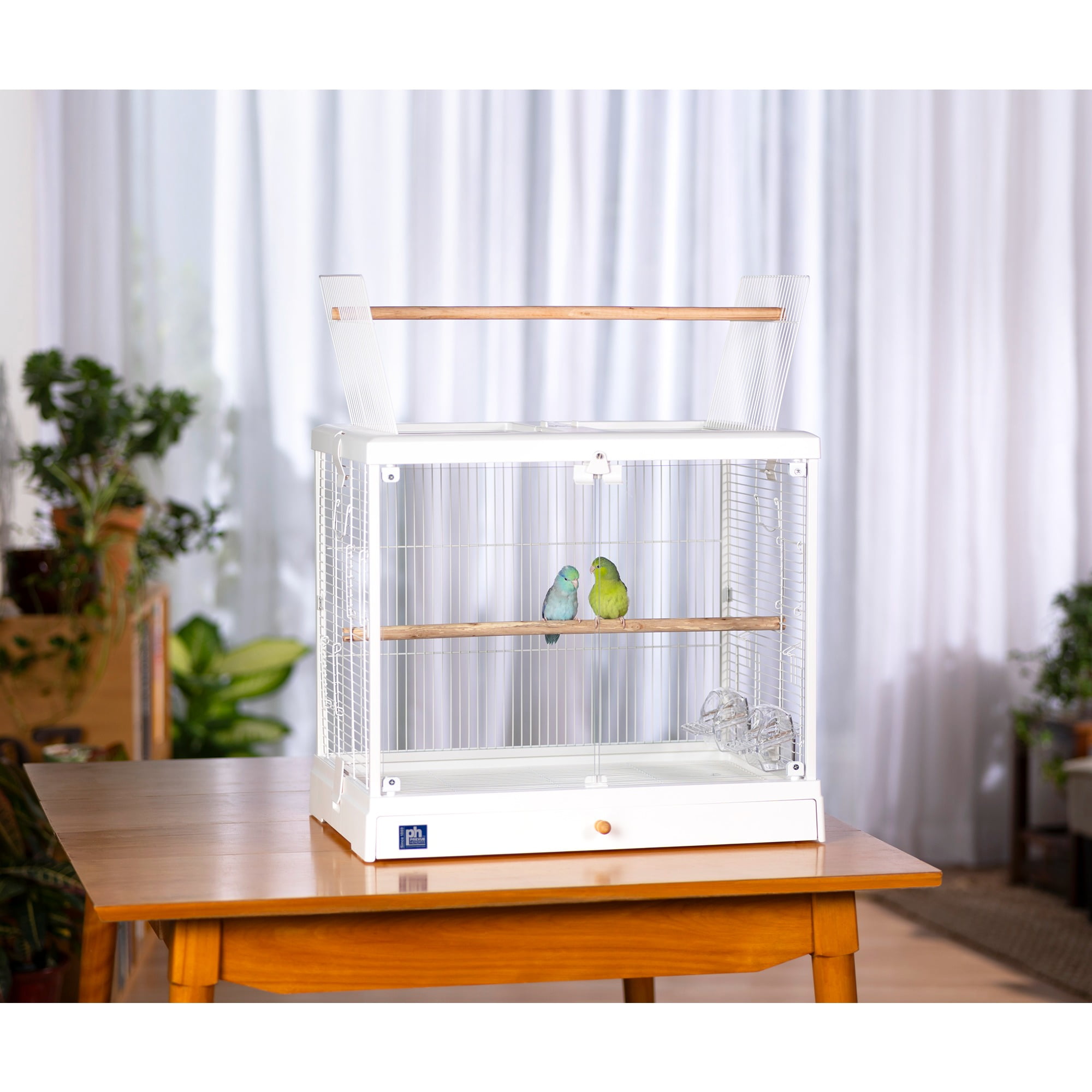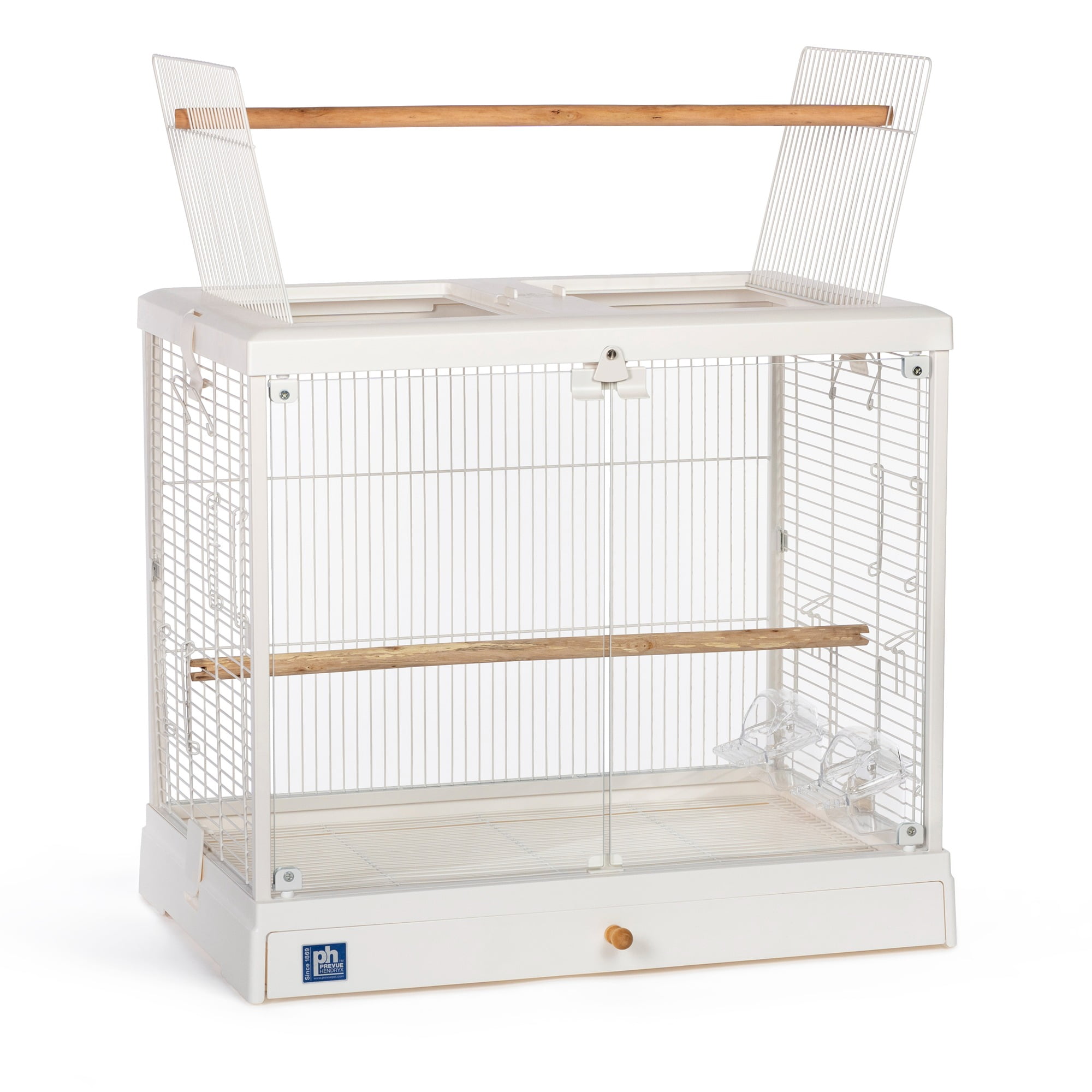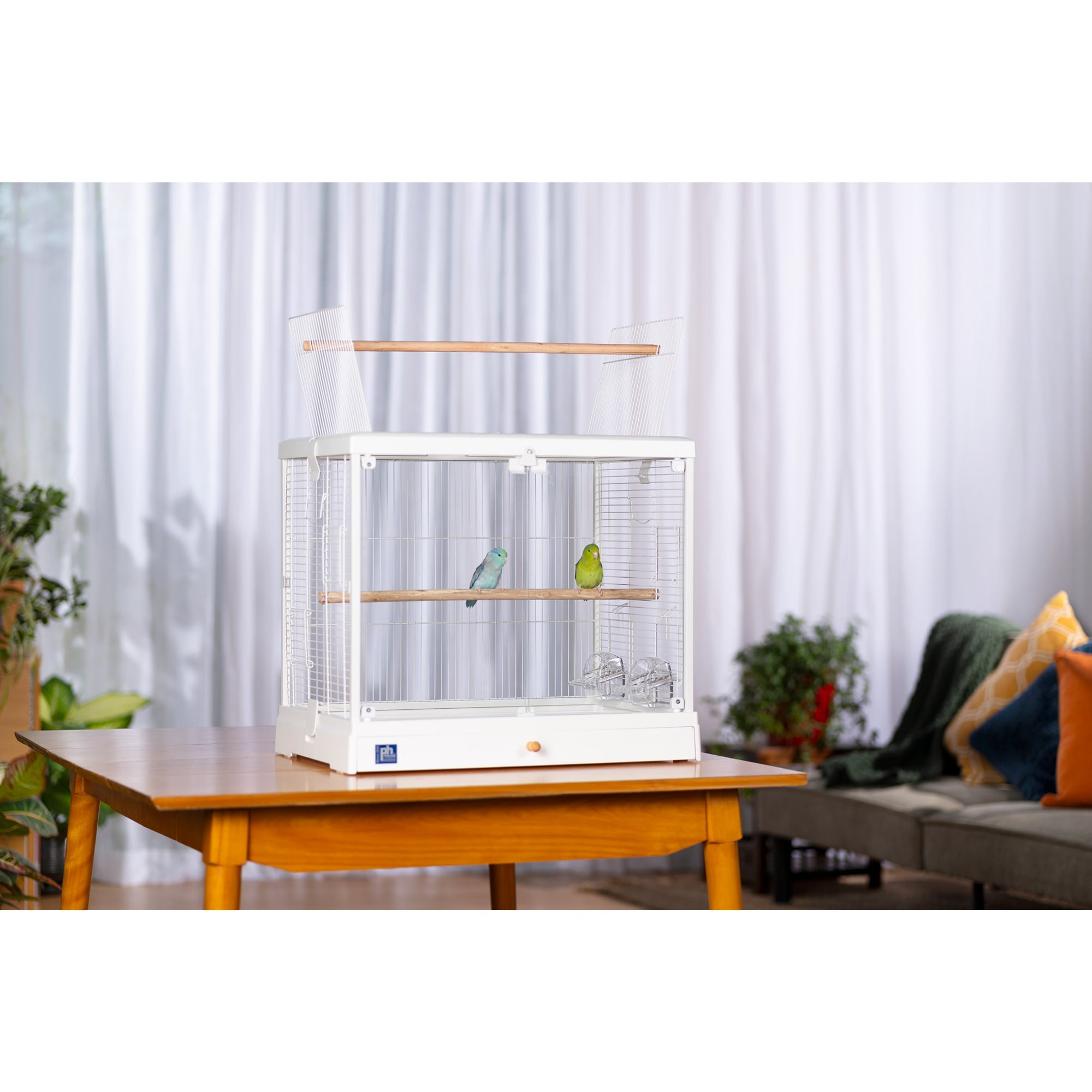 Glass front doors close securely with a magnetic closure and win bell lock Roof opens and can convert to a playtop by using the second perch provided with cage Includes two perches – use both inside the cage, or use one when the playtop is in use Features vertical and horizontal cage wires for optimal climbing Two inset cup doors and three additional side doors for nest boxes or other uses Pull-out grille and debris tray for easy cleaning Clip on/off roof and base for easy, routine cleaning Ideal for tabletop use For small to medium sized birds 24.25 L” x 16.5 W” x 21.75″ H