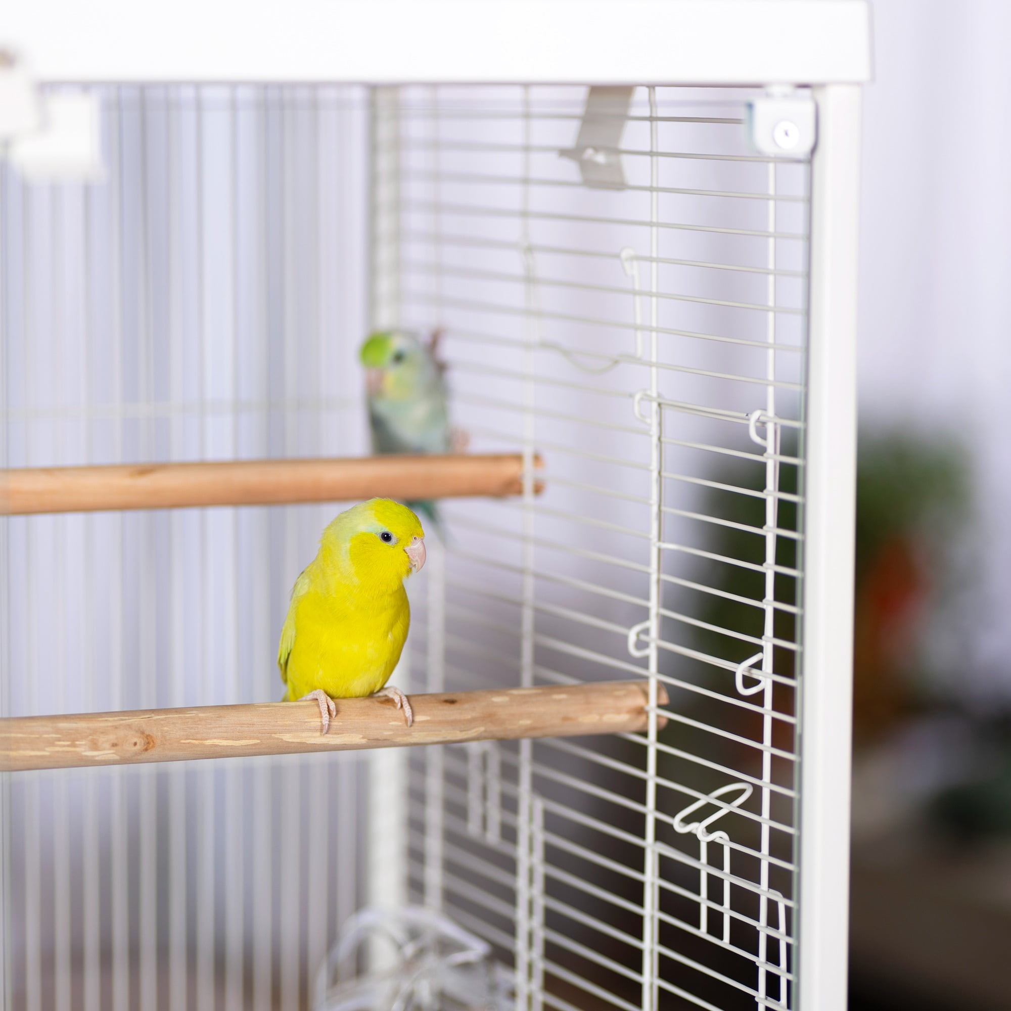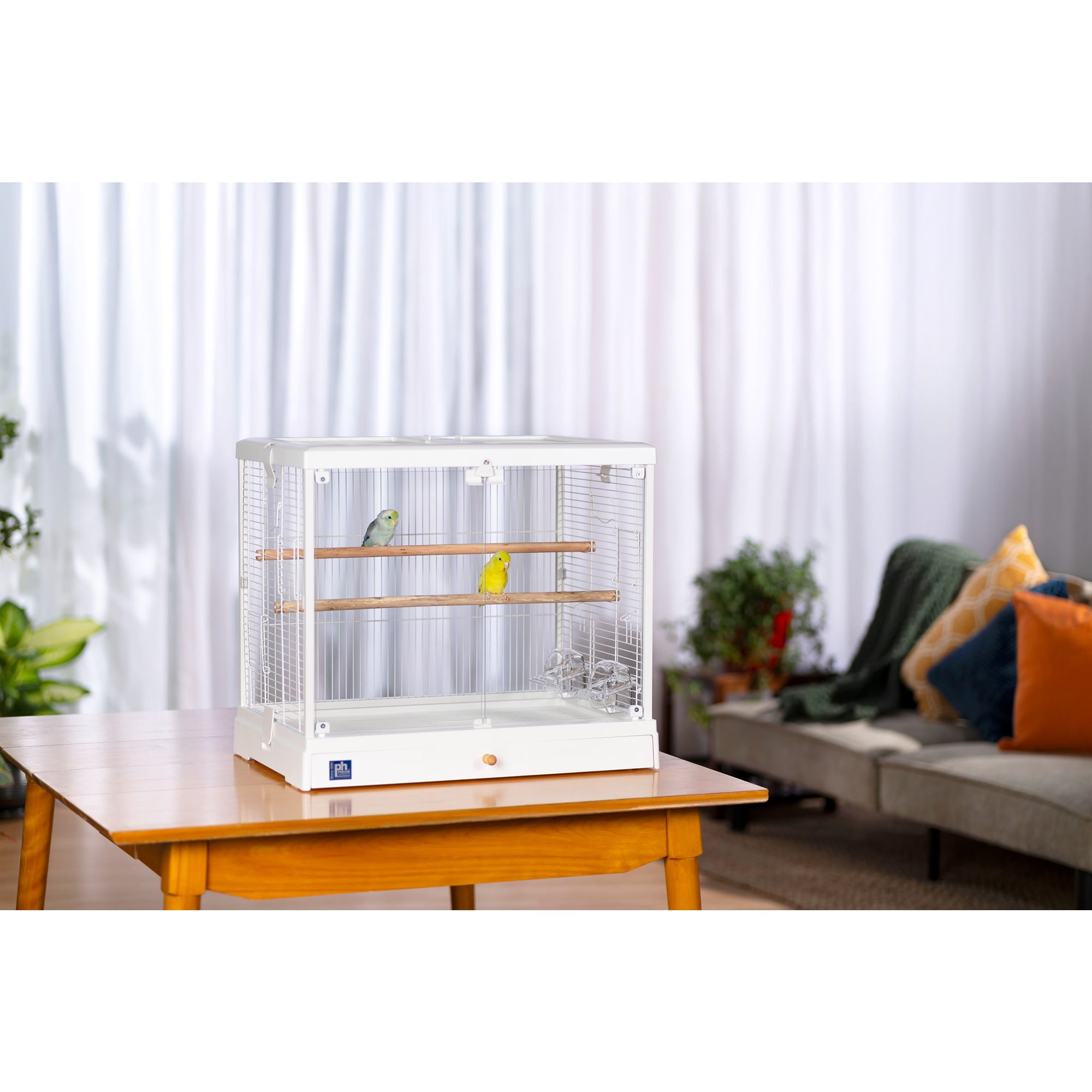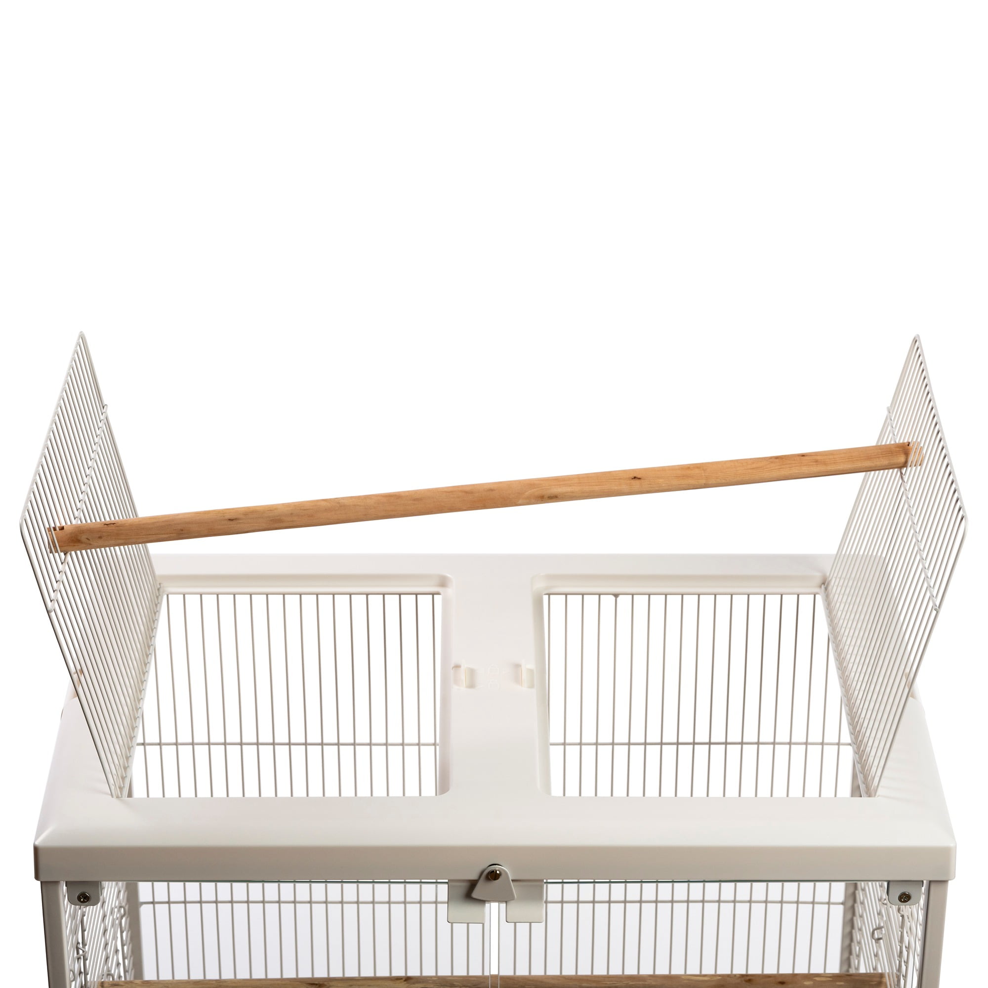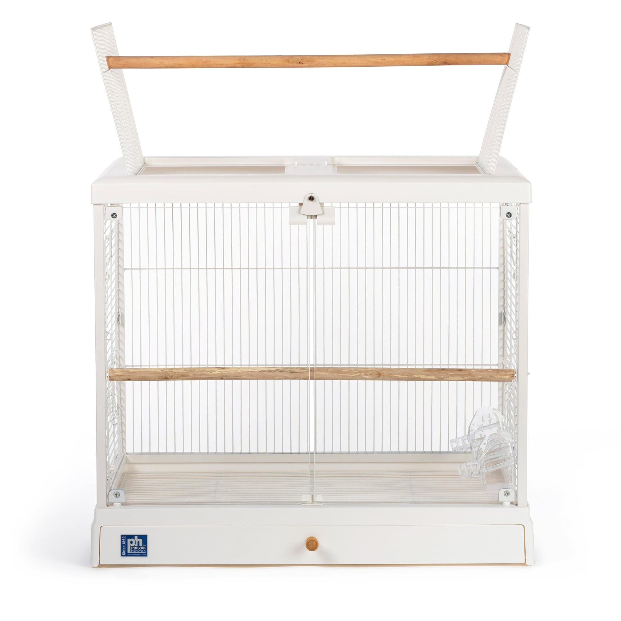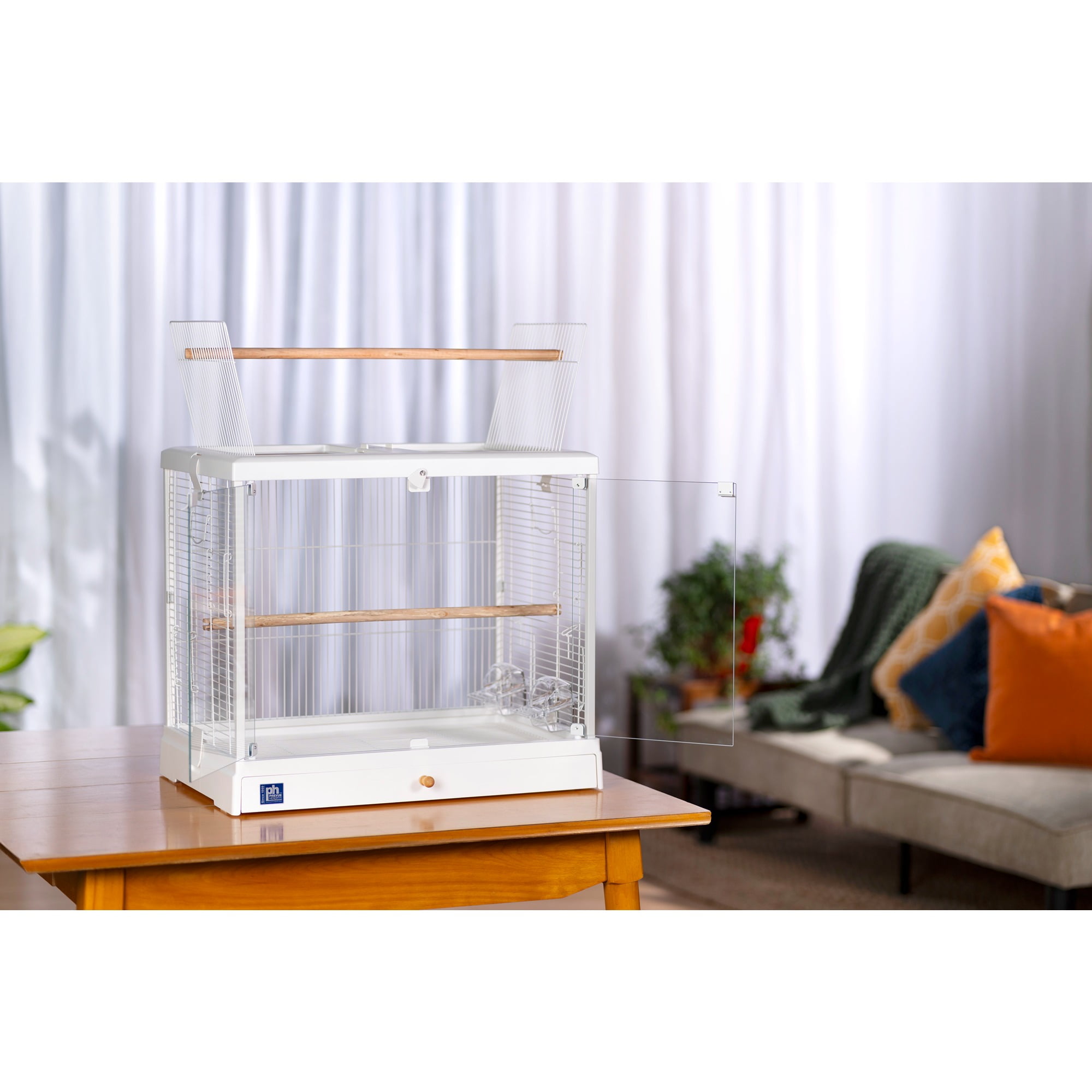 Glass front doors close securely with a magnetic closure and win bell lock Roof opens and can convert to a playtop by using the second perch provided with cage Includes two perches – use both inside the cage, or use one when the playtop is in use Features vertical and horizontal cage wires for optimal climbing Two inset cup doors and three additional side doors for nest boxes or other uses Pull-out grille and debris tray for easy cleaning Clip on/off roof and base for easy, routine cleaning Ideal for tabletop use For small to medium sized birds 24.25 L” x 16.5 W” x 21.75″ H