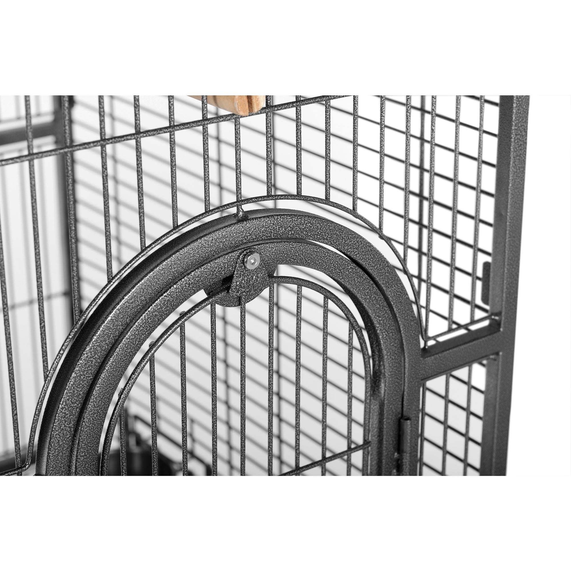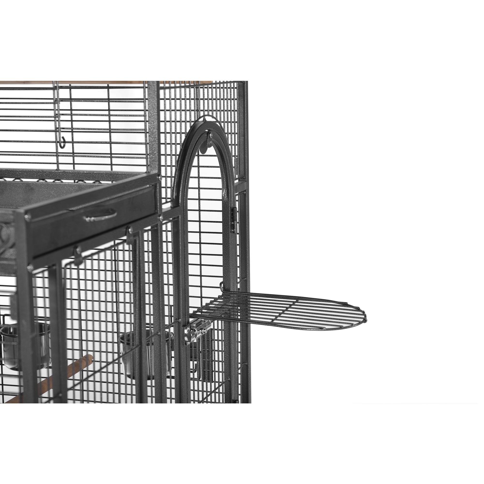 Double Roof Bird Cage with Playtop utilizes a unique design to provide ample space for your parrot or other large bird. Open the sliding door to the exterior playtop area, which contains toy/treat hooks, cupholders, perch and a ladder, for even more room to explore! The pull out bottom grille and tray, combined with a rounded corner seed guard, help contain mess and make cleaning quick and easy. The unique 2-in-1 front door opens down as a landing-style door or swings out for full access to the entire cage. The entire front door is 10’w x 26 3/4’h, with the drop-down door measuring 12’h. The triple toy hook design provides lots of space for hanging multiple toys or treats. The pull-out bottom grille and tray, along with the rounded corner seed guard, help contain mess and make cleaning quick and easy. Double cups both inside and outside the cage provide plenty of room for storing food, water and treats. Also, there is a slide-out door between the cage and playtop area that lets birds move easily from one area to the other. Unique 2 in 1 front door opens down as a landing or swings out for easy access to the cage interior. Hard, baked enamel finish (powder coated). Black Hammertone finish. Rounded corner seed guards. 4 Large stainless steel non-tip feeding bowls. 1-1/8″ Diam. hardwood perches. Slip-in Mesh panel construction for ease of assembly and replacement. Constructed from 8 gauge and 9 gauge diam. wire and utilizes a flathead hex bolt assembly that birds cannot unscrew. Easy-roll casters Black hammertone, powder -coated finish. Roomy dometop, and playtop design. Cage stand base features easy-rolling caster. Includes 3 wood perches, 4 stainless steel cups. Exterior playtop area with toy / treat hooks, cupholders, perch and ladder. Wrought iron construction, unique 2-in-1 front door opens down(landing style) or swings out(traditional). Material: Powder Coated Metal. Exterior dim: 63.5″ H x 36.5″ W x 27.38″ D. Interior dim: 55″ H x 27″W x 36″ L. – SKU: PVPP005