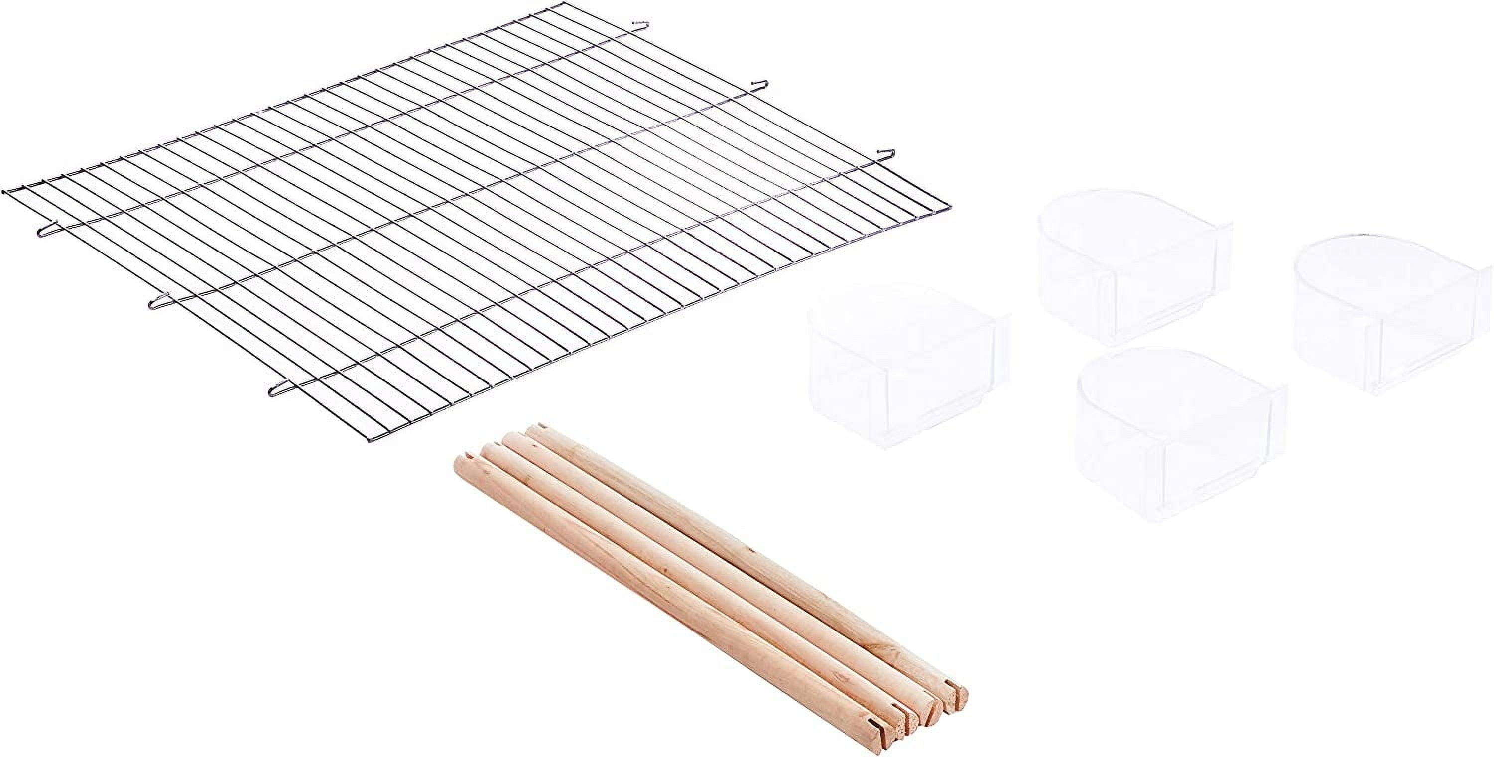 Made of .38 in. spacing metal wire and a molded plastic base Comes with 2 front opening doors and removable plastic tray Includes 4 plastic cups, 4 wood perches, and wire divider Compact footprint stacked with additional flight cages Dimensions: 24L x 16W x 16H in.