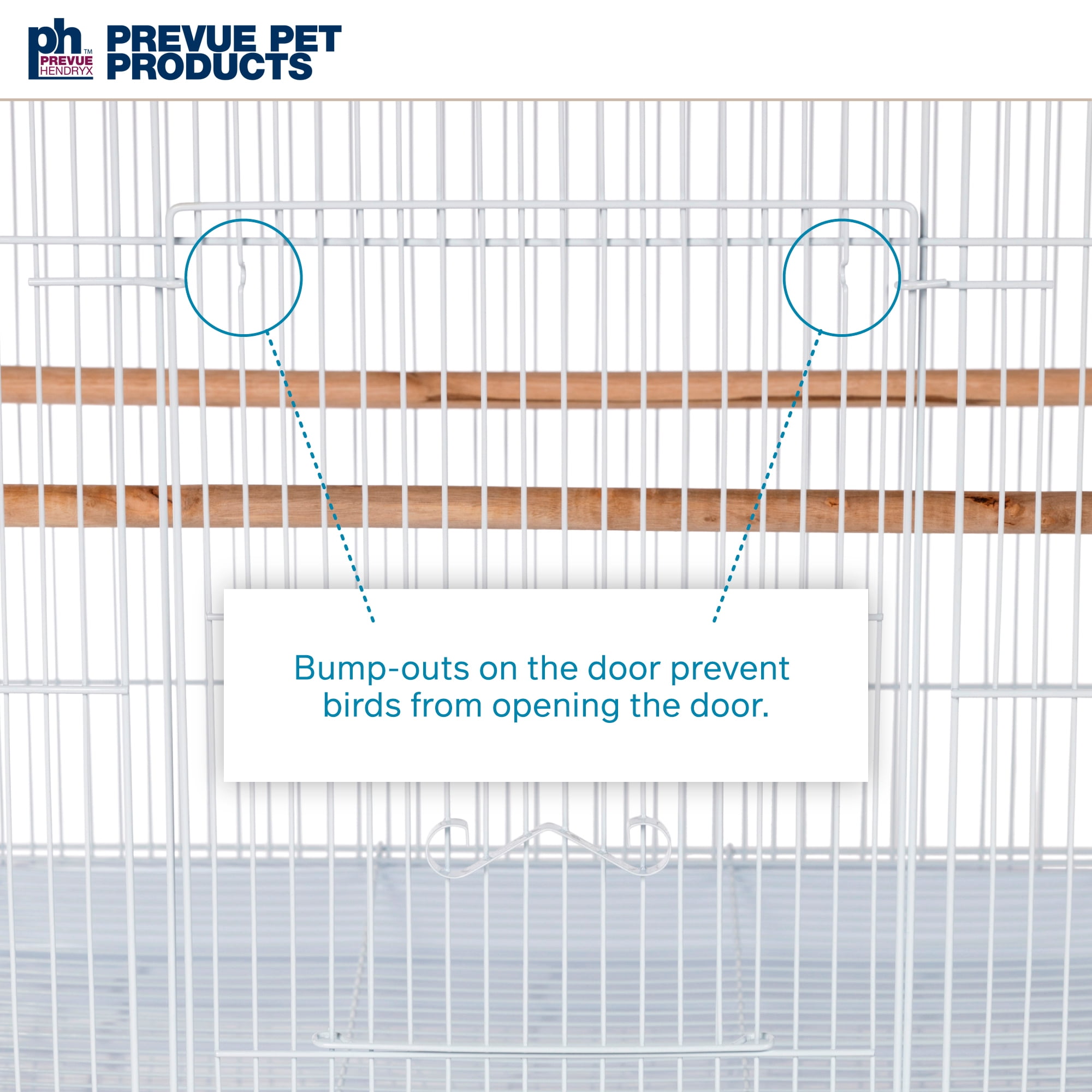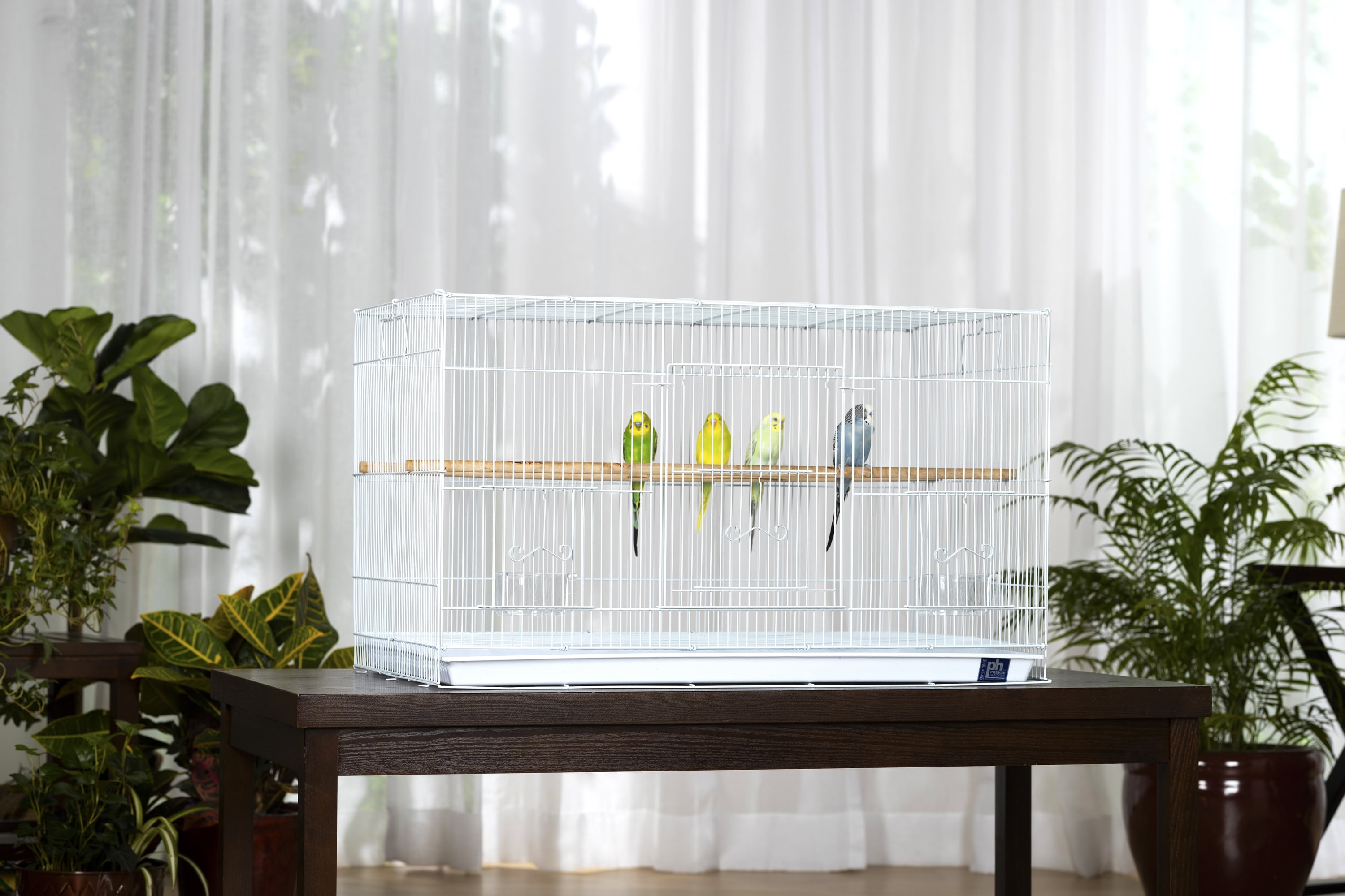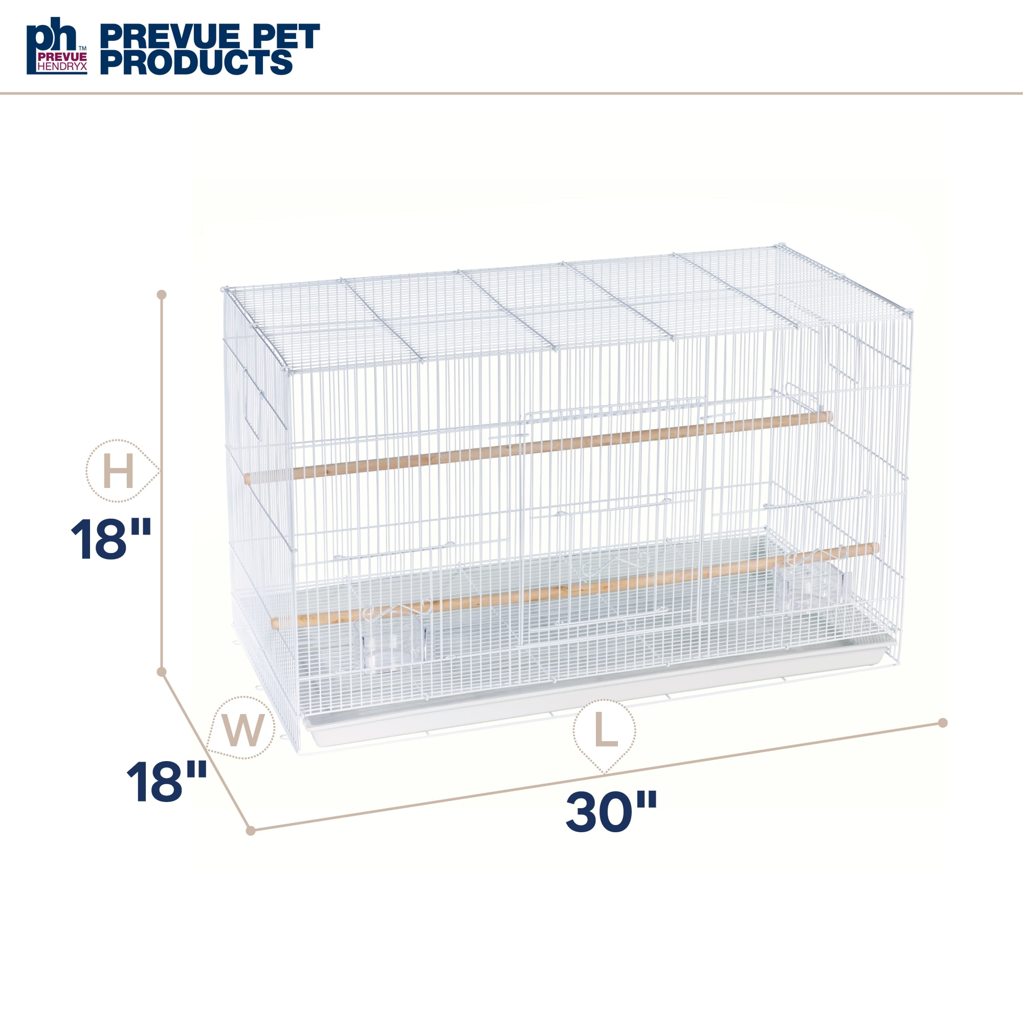 38″ Spacing metal wire with durable white plastic base Large, front opening door and removable plastic tray Includes 2 plastic cups and 2 wood perches Compact footprint stacked with additional flight cages Dimensions: 30L x 18W x 18H in.