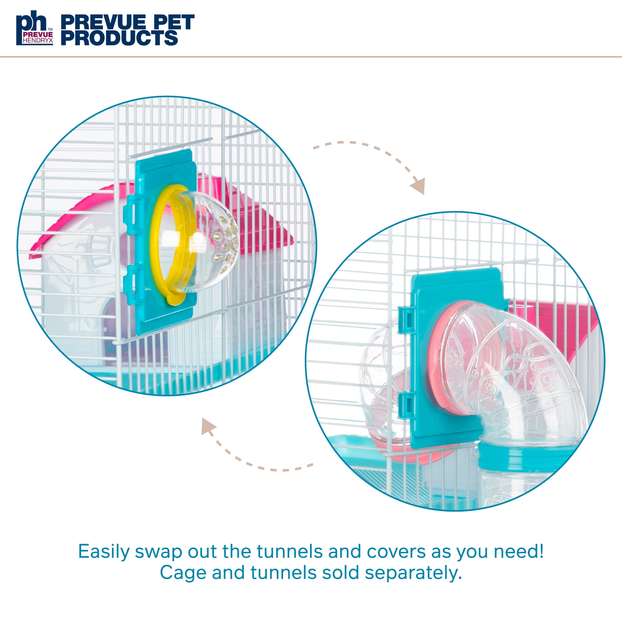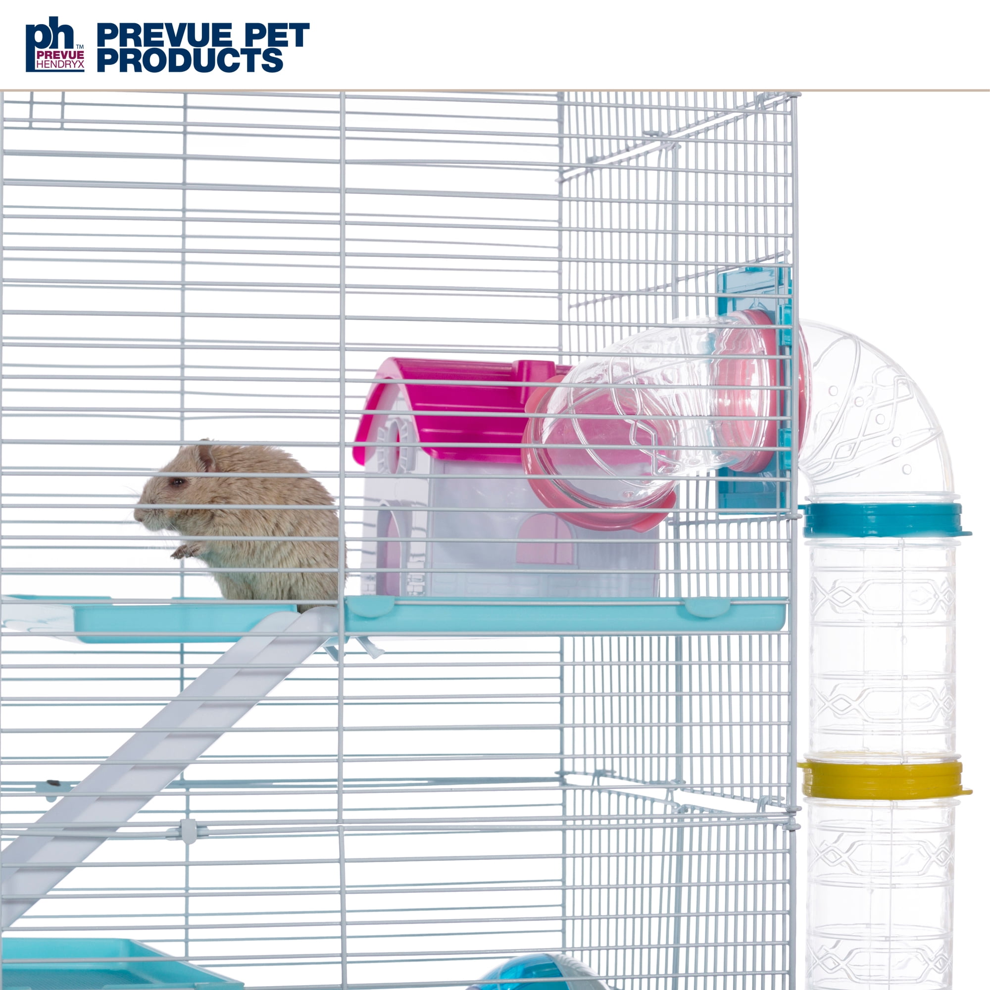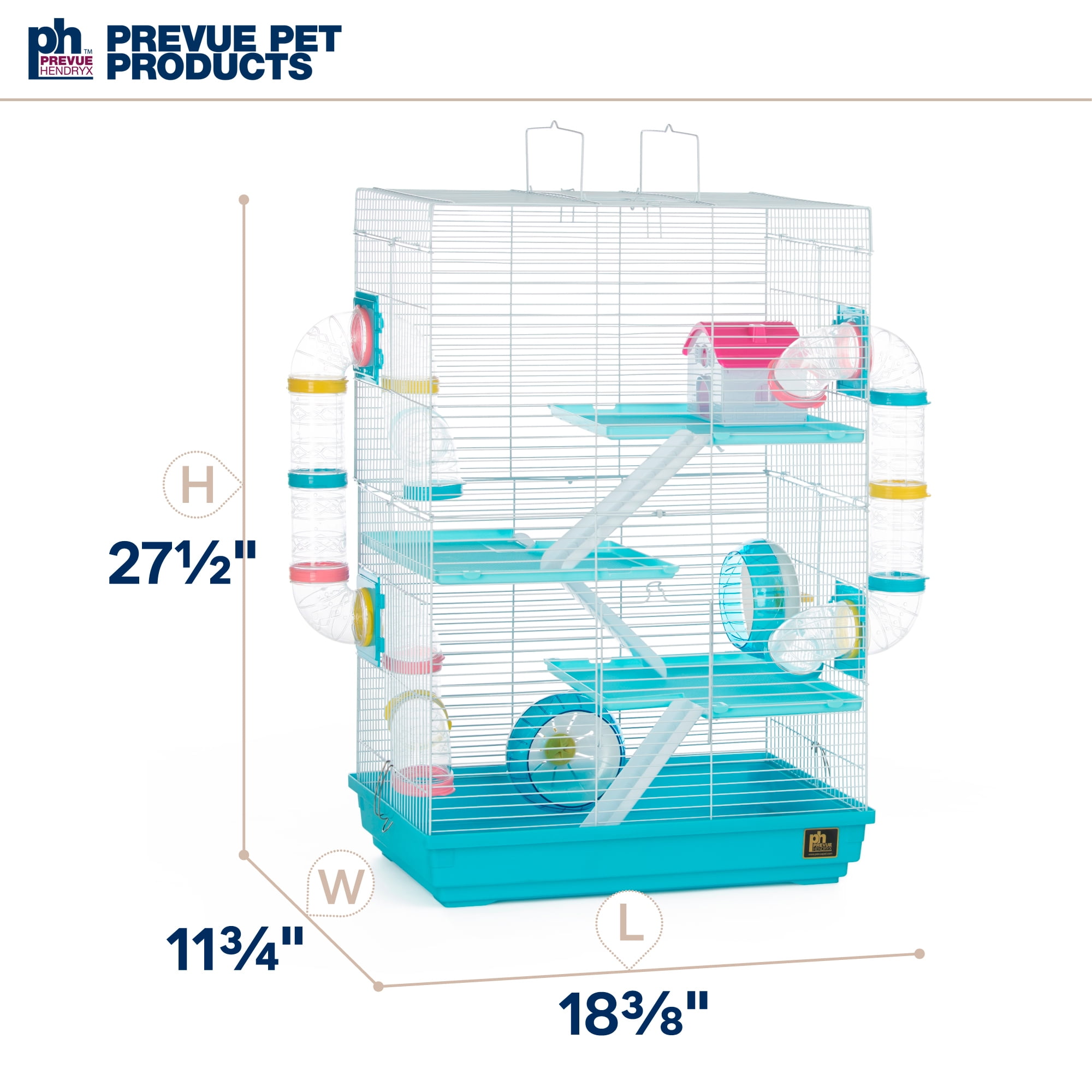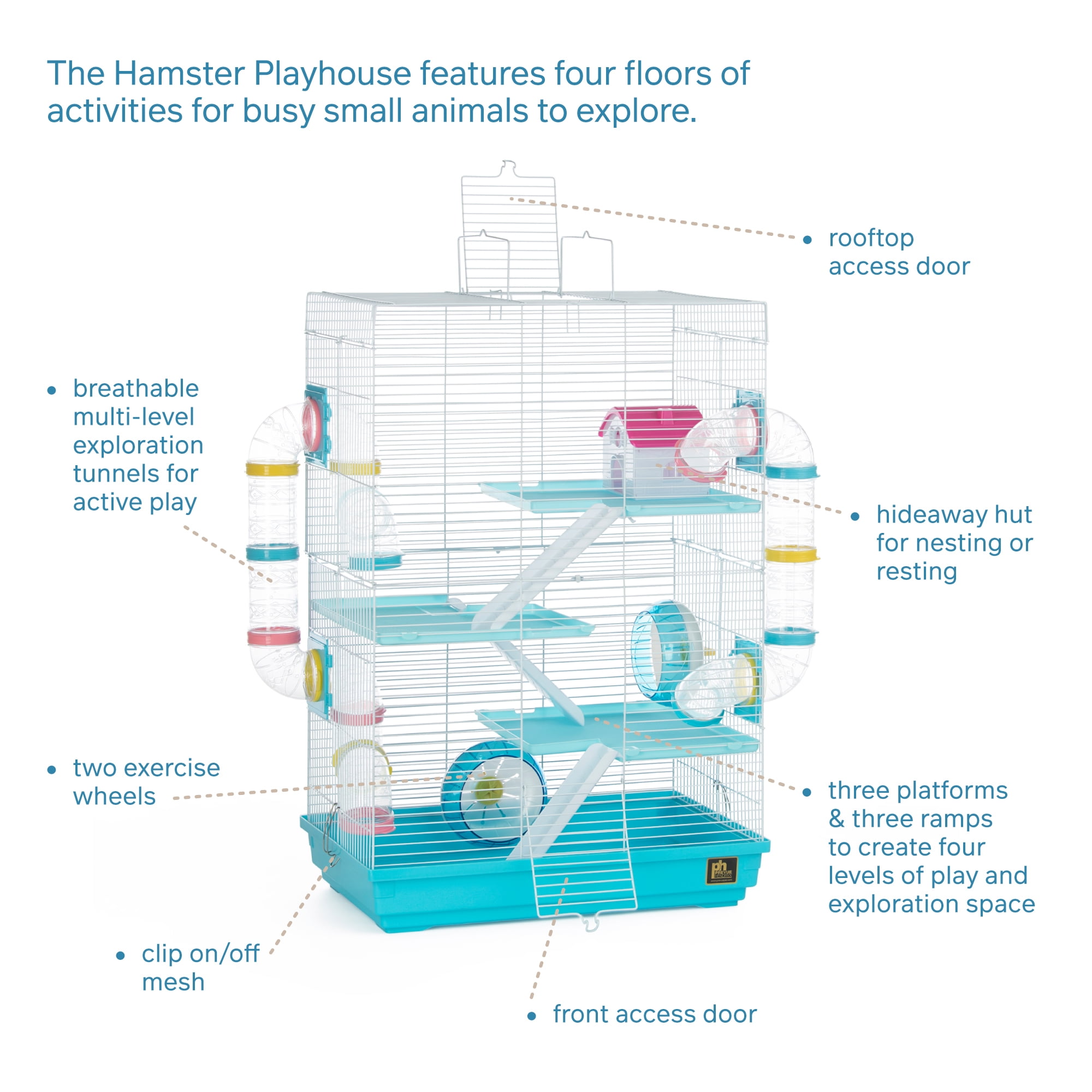 Prevue Pet Products Hamster Playhouse 2006 is a palatial four-level home for your hamsters or gerbils. Quad-level cage provides plenty of options for healthy activity while also satisfying your pet”s natural instincts to explore hide and play above ground level. Multi-color components include two tunnel passageways one on each side of the cage two exercise wheels a cozy hideaway three non-slip ramps and three textured non-slip movable platforms. Featuring two access points this vibrantly colored hamster and gerbil cage has one front door plus one top-opening door. Visually engaging in shades of blue with pink and yellow accents and color coordinated accessories our Hamster Playhouse 2006 measures 18 3/8″ long (24 3/4″ long including the exterior tunnels) 11 3/4″‘ wide and 27 1/2″ high with 3/8″ wire spacing.