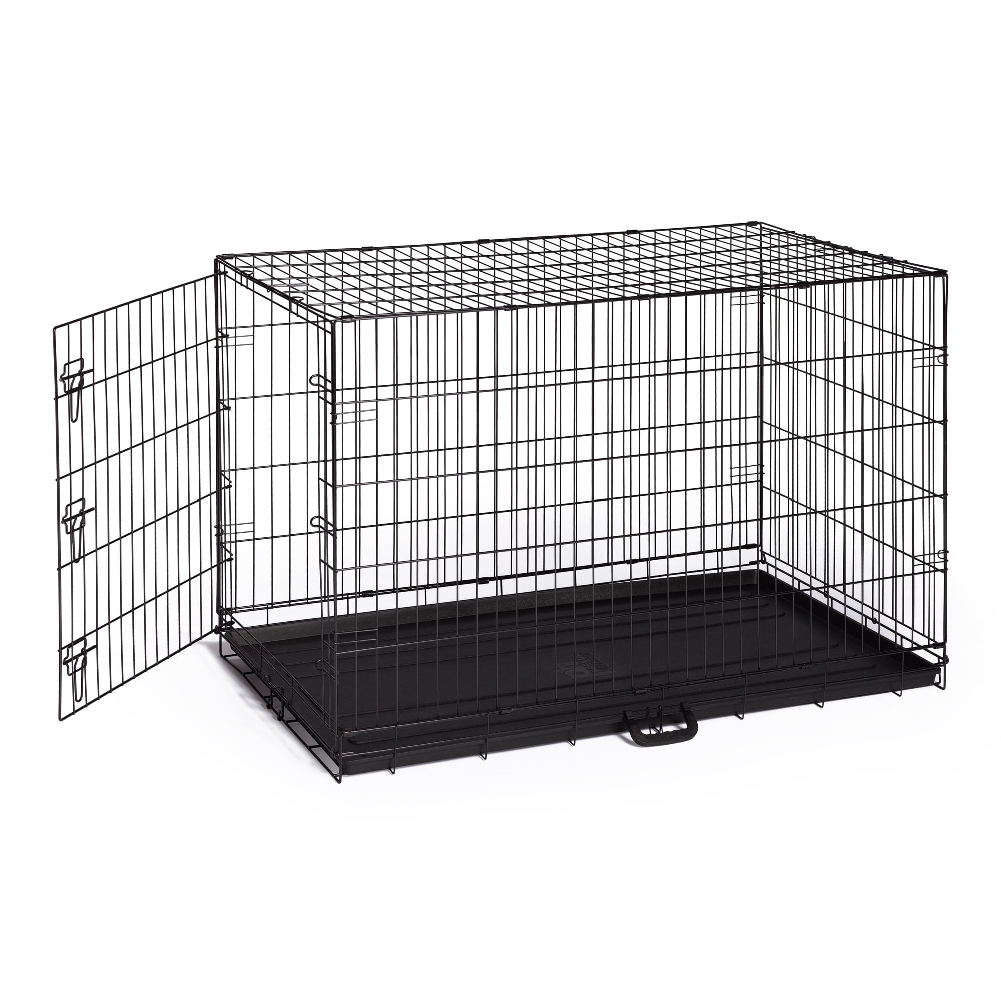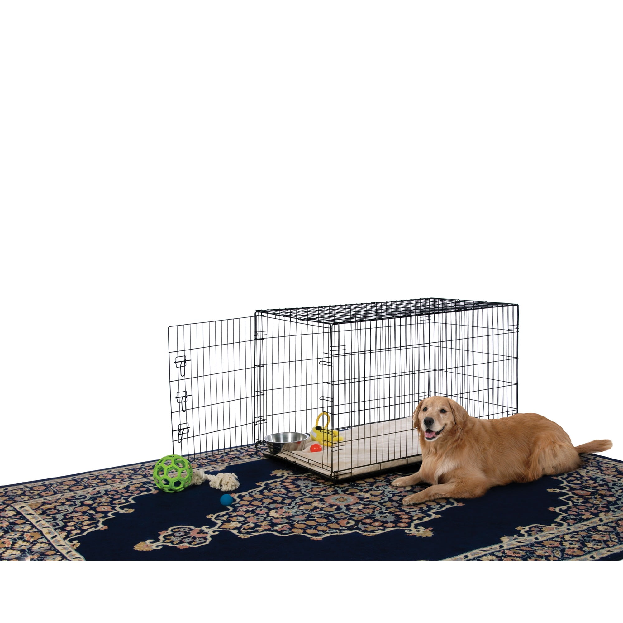 Prevue Pet Products Home On-The-Go Single Door Dog Crate X-Large E435 has been created to provide your pet with the highest level of safety and comfort. Designed to withstand years of use, our Economy Dog Crate features an innovative injection-molded plastic pan which is stronger than other plastics and will not warp. Extra deep 1 ½ inch plastic pan with rounded corners prevent leaks while elevated grooved portions of the pan keep your pup above any mess. Minimal space between the pan and bird cage, plus an independent pan lock, mean the pan won’t be pushed out, but can be easily removed for quick cleaning. Constructed from heavy gauge mesh for security and stability, the large front door features a heavier framework plus 3 security locks, strategically placed near the perimeter to provide maximum security. Lightweight, single door crate features a non-toxic, durable, powder-coated black finish, assembles easily without tools, has plastic handles for portability and folds flat when not in use. Whether used for training or traveling our wire crate provides your pet with unobstructed views and better air ventilation than plastic kennels and won’t leak or stain like galvanized steel. Our Large Economy Dog Crate is ideal for pets up to 85 lbs. and 30″ in height, such as Boxers, Golden Retrievers, Old English Sheepdogs and Dobermans. Crate measures 49 1/2 inches Long, 29 3/8 inches Wide and 32 1/4 inches High while open and folds flat to 49 1/2 inches Long, 29 3/8 inches Wide and 4 1/8 inches High. Constructed from 6, 7, 8 & 11 gauge mesh with 1 1/2 inch wire spacing.