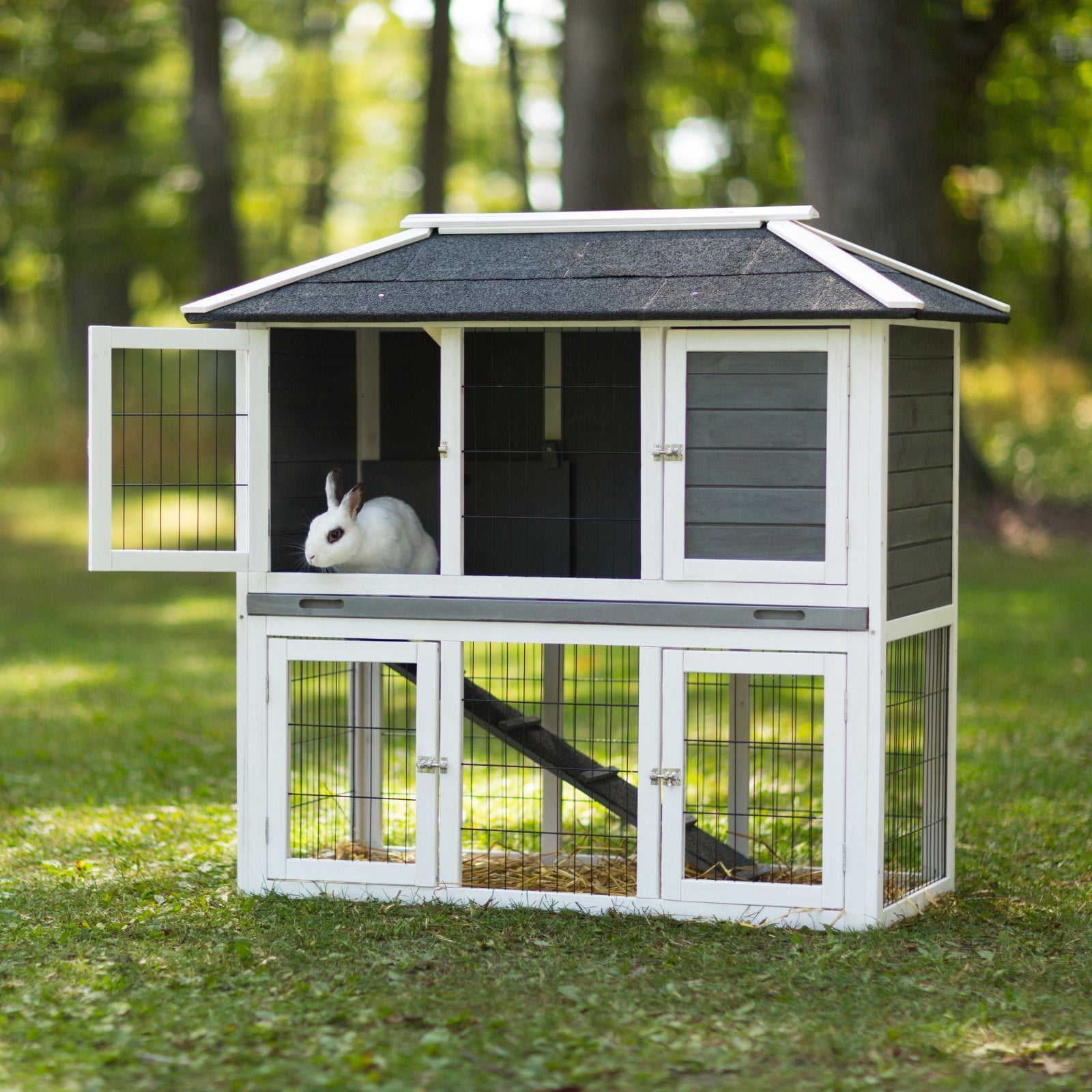 “*Cozy interior house above a protected play area;*Four hinged doors allow access to all areas of the house and play area;*Removable galvanized tray floor for cleaning” “*Ramp entry can be closed off to isolate upper/lower spaces;*Asphalt-coated roof panels;*Indoor/outdoor use for one or more rabbits” “*44 1/8″ long 21 3/4″ wide and 45 1/2″ high with 1″ wire spacing”