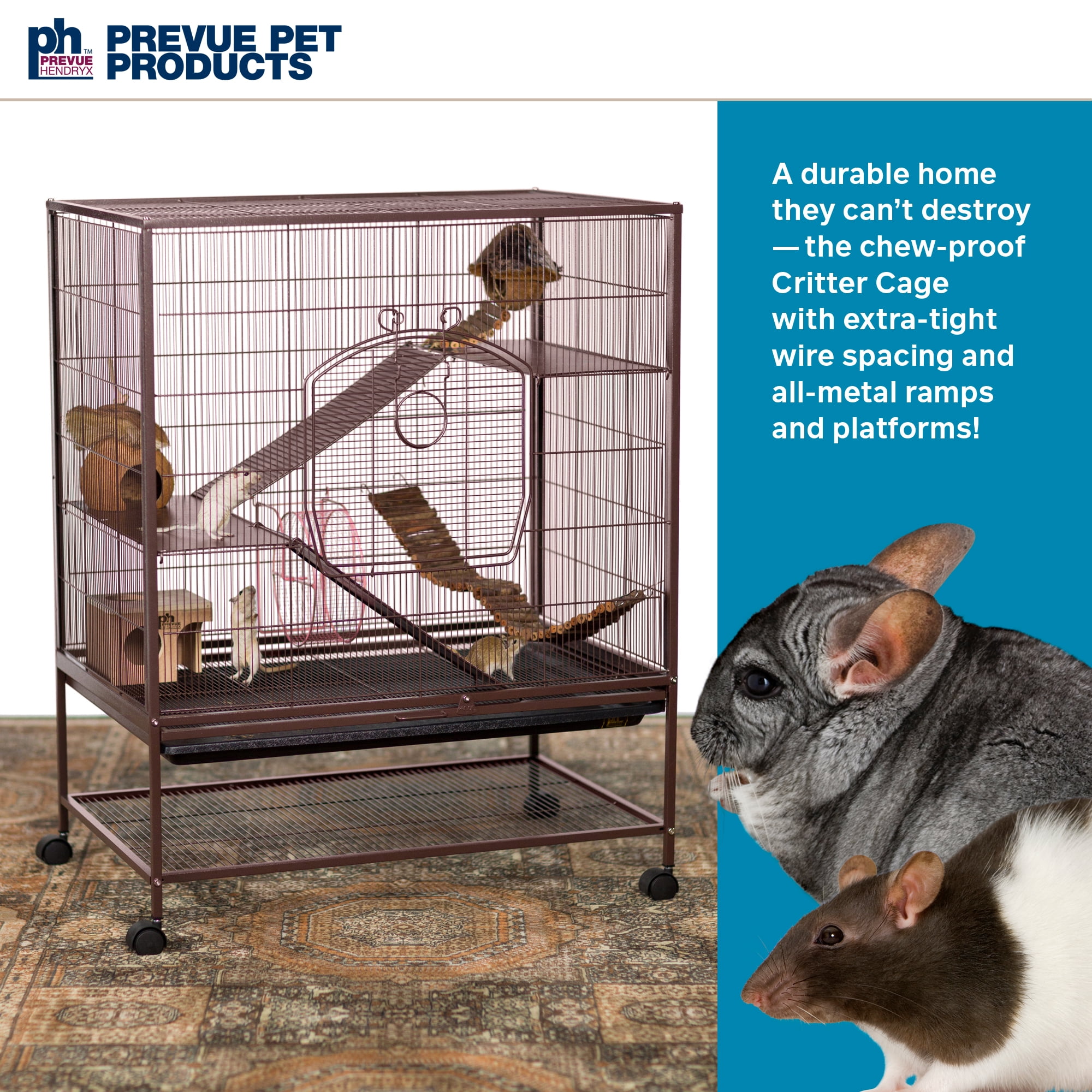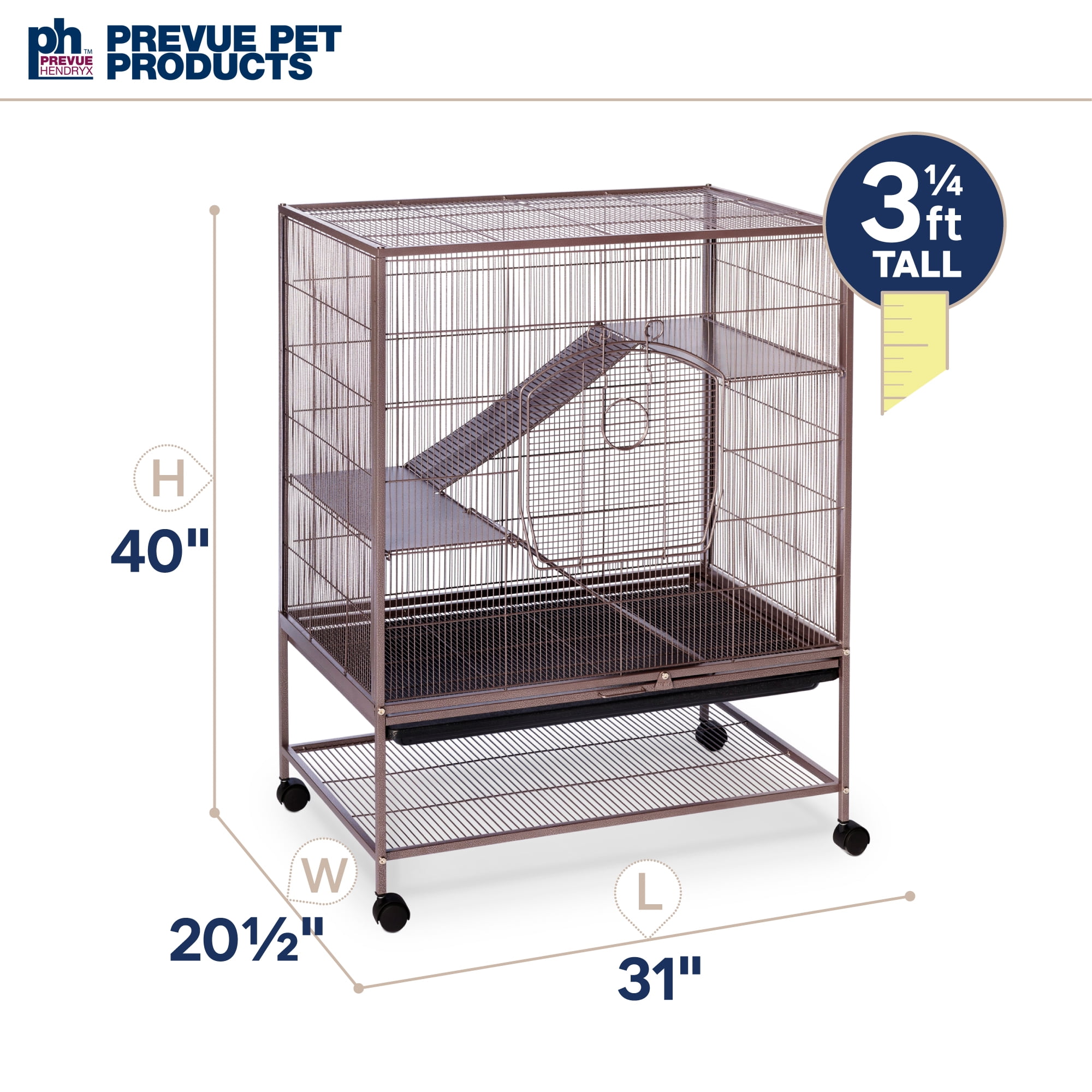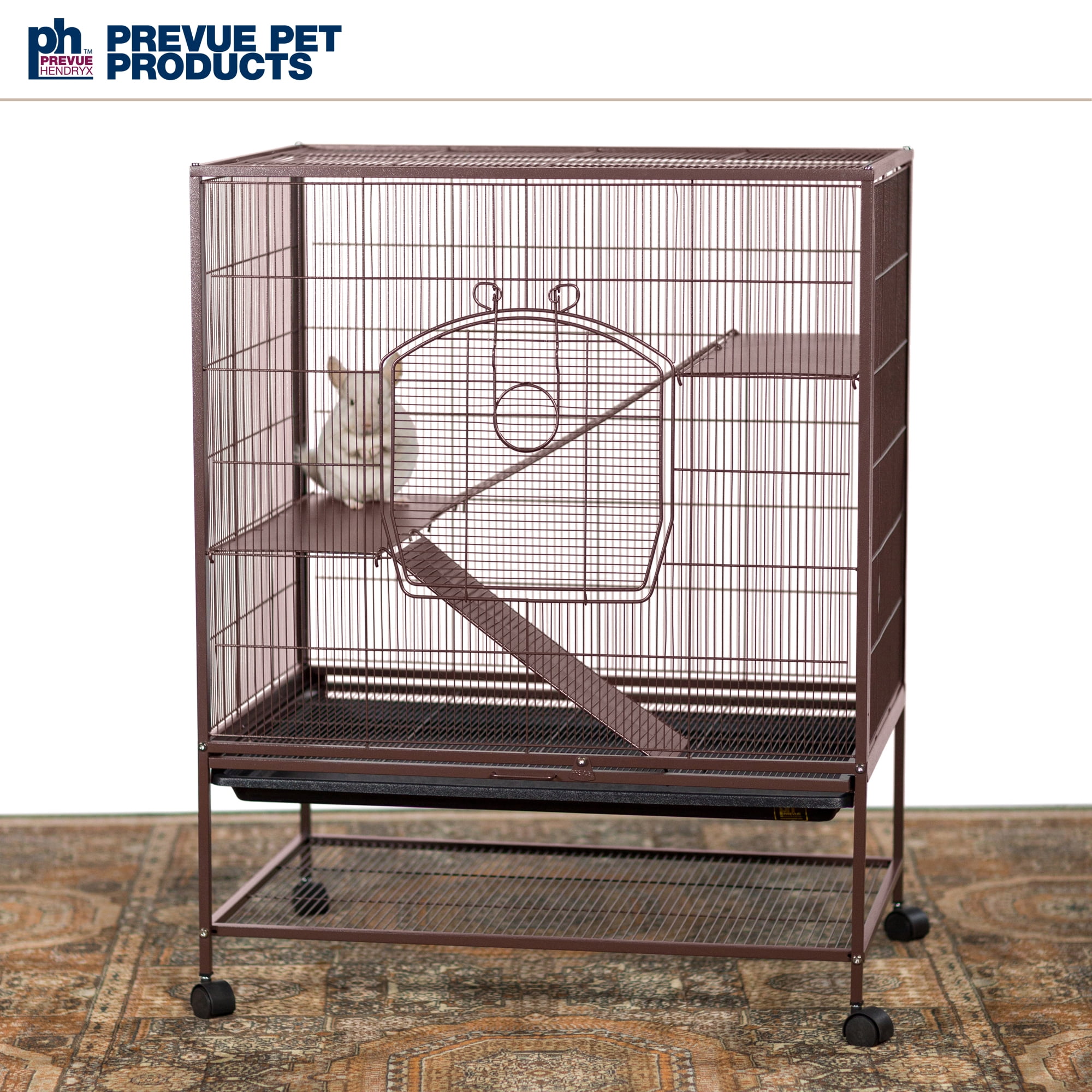 Prevue Pet Products Rat & Chinchilla Cage: 31″L x 20.5″W x 40″H .1875″ wire spacing Solid metal ramps and platforms Ideal cage for rats, chinchillas and/or baby ferrets Wind-bell lock provides extra protection against escaping pets Large front door and smaller rooftop door for easy access Features a handy bottom pull-out drawer and a tray Space-saving shelf can be used to store extra food, toys, treats and more Item 495 Available Color: Earth tone Dusted Rose with a hammer tone finish