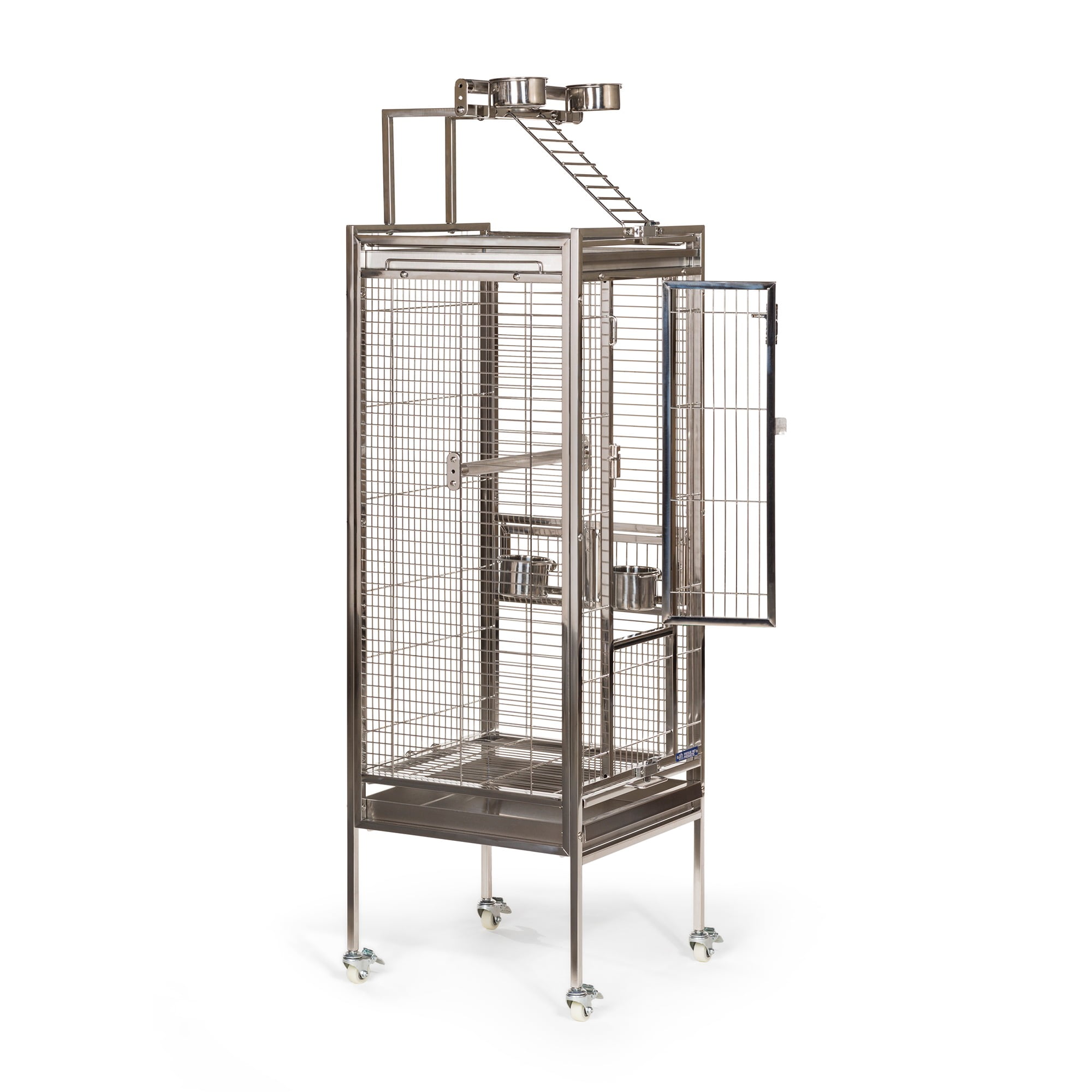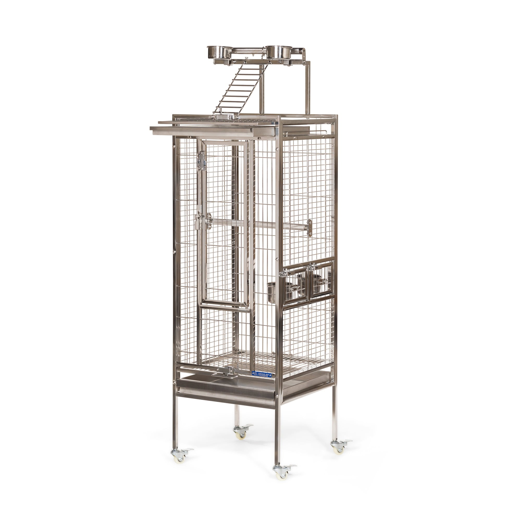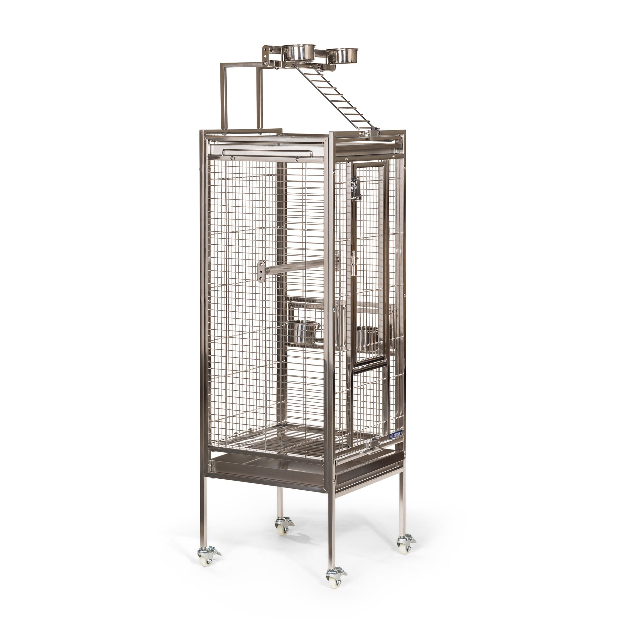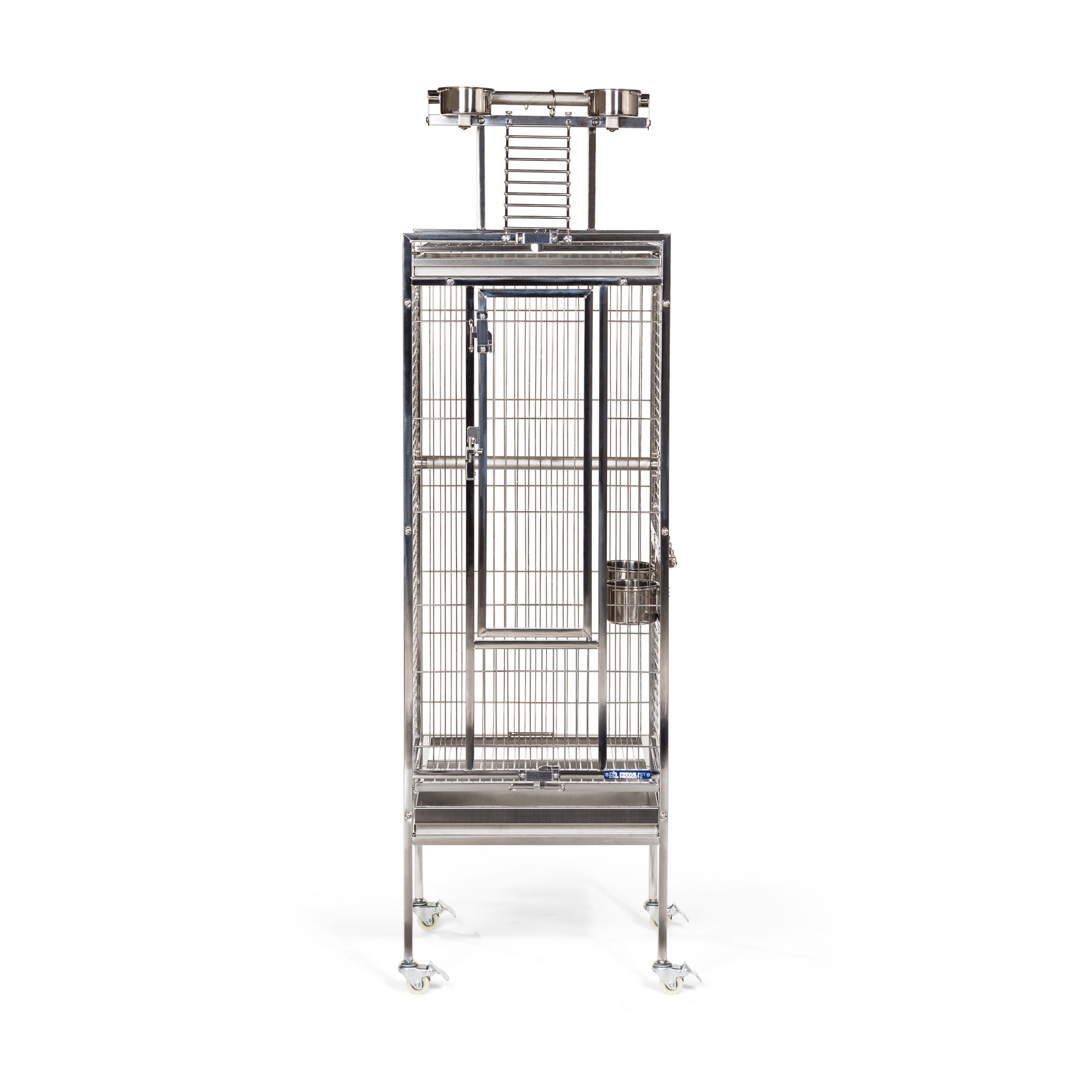 Prevue Pet Products All Stainless Steel Bird home – even the perches! Large front door features two different styles of bird-proof locks Lock-in-place Stainless Steel Food and water cups Pull out grilles & trays with grille locks 17 3/4’’ long, 17 3/4’’ wide and 61 1/4’’ high (to top of play top) with 3/4” wire spacing
