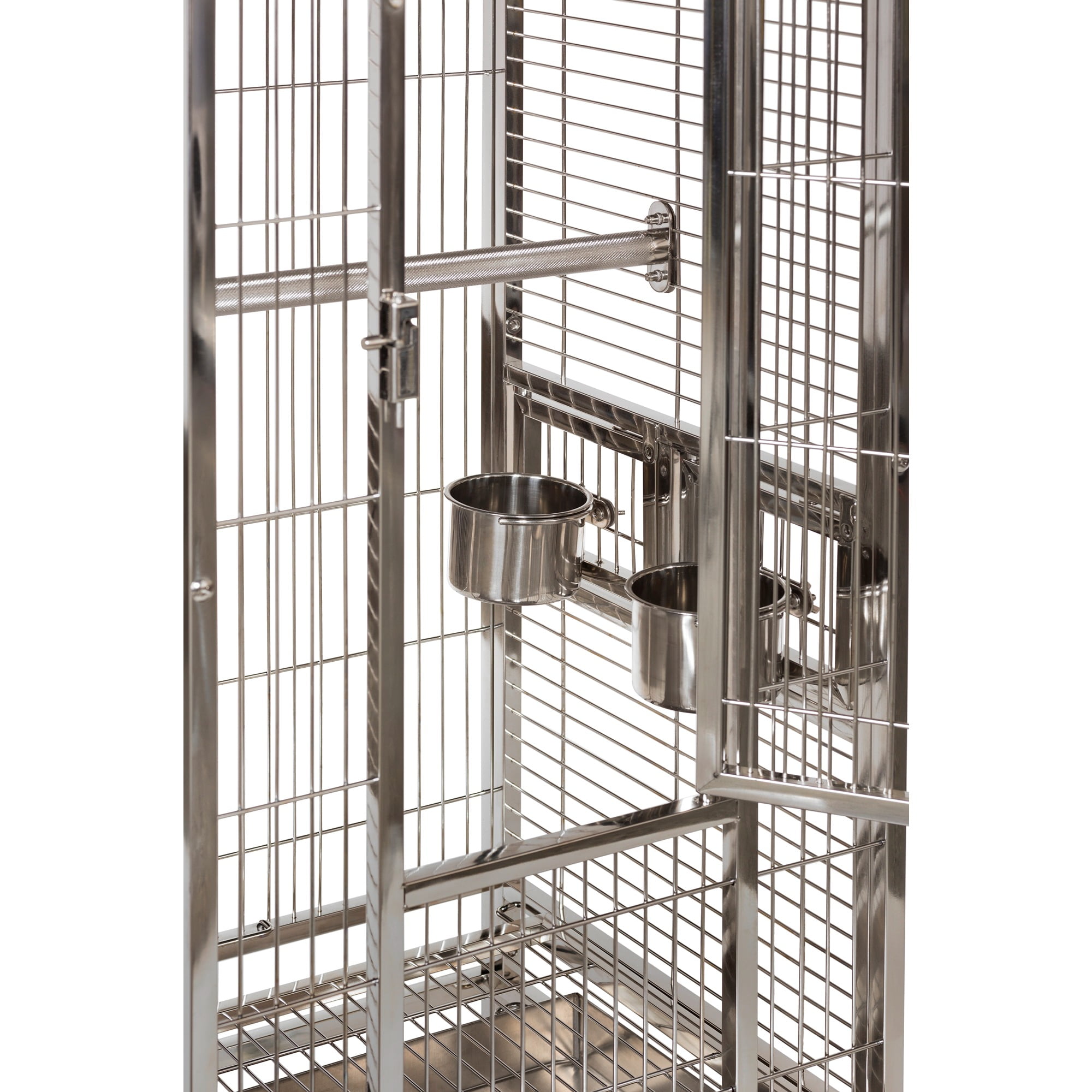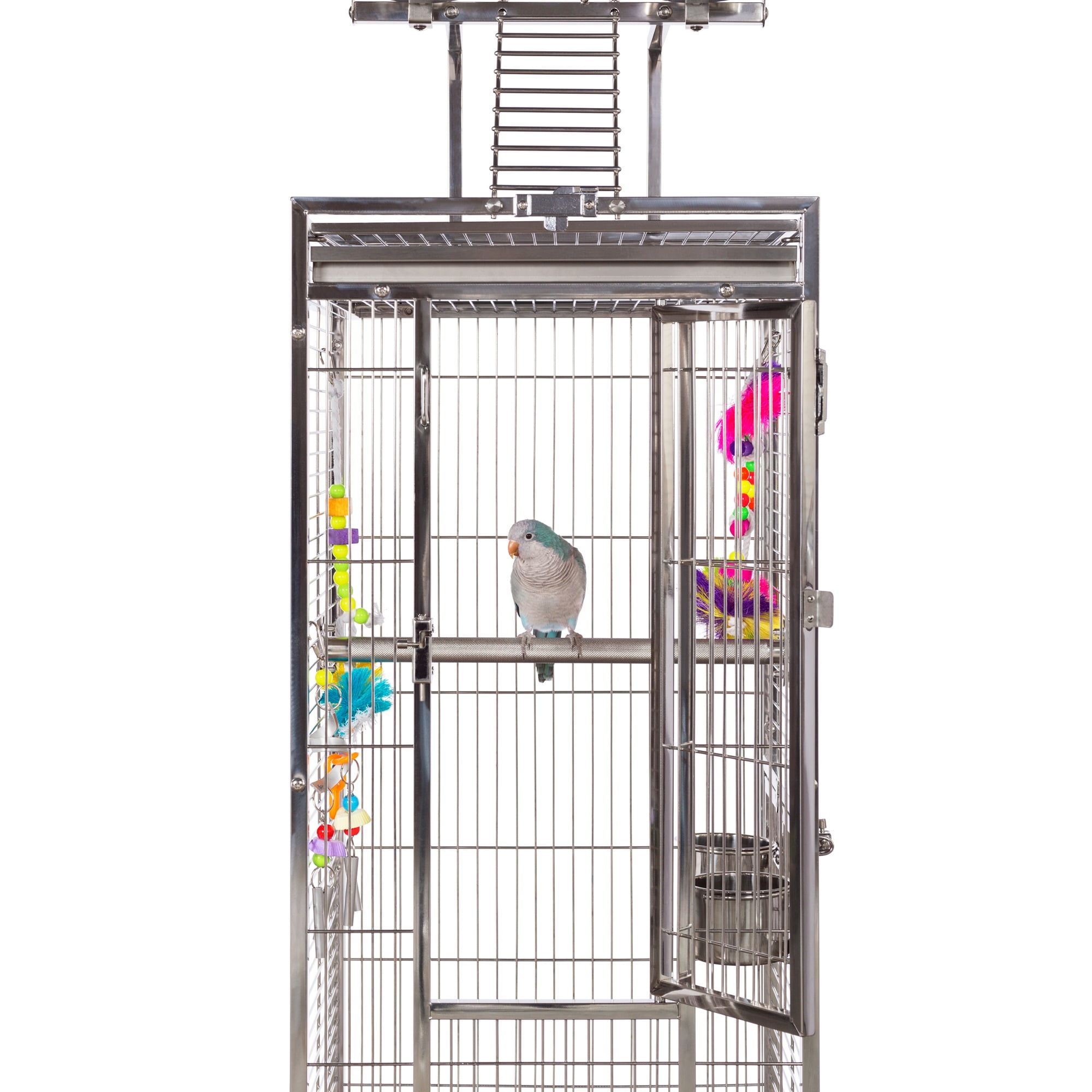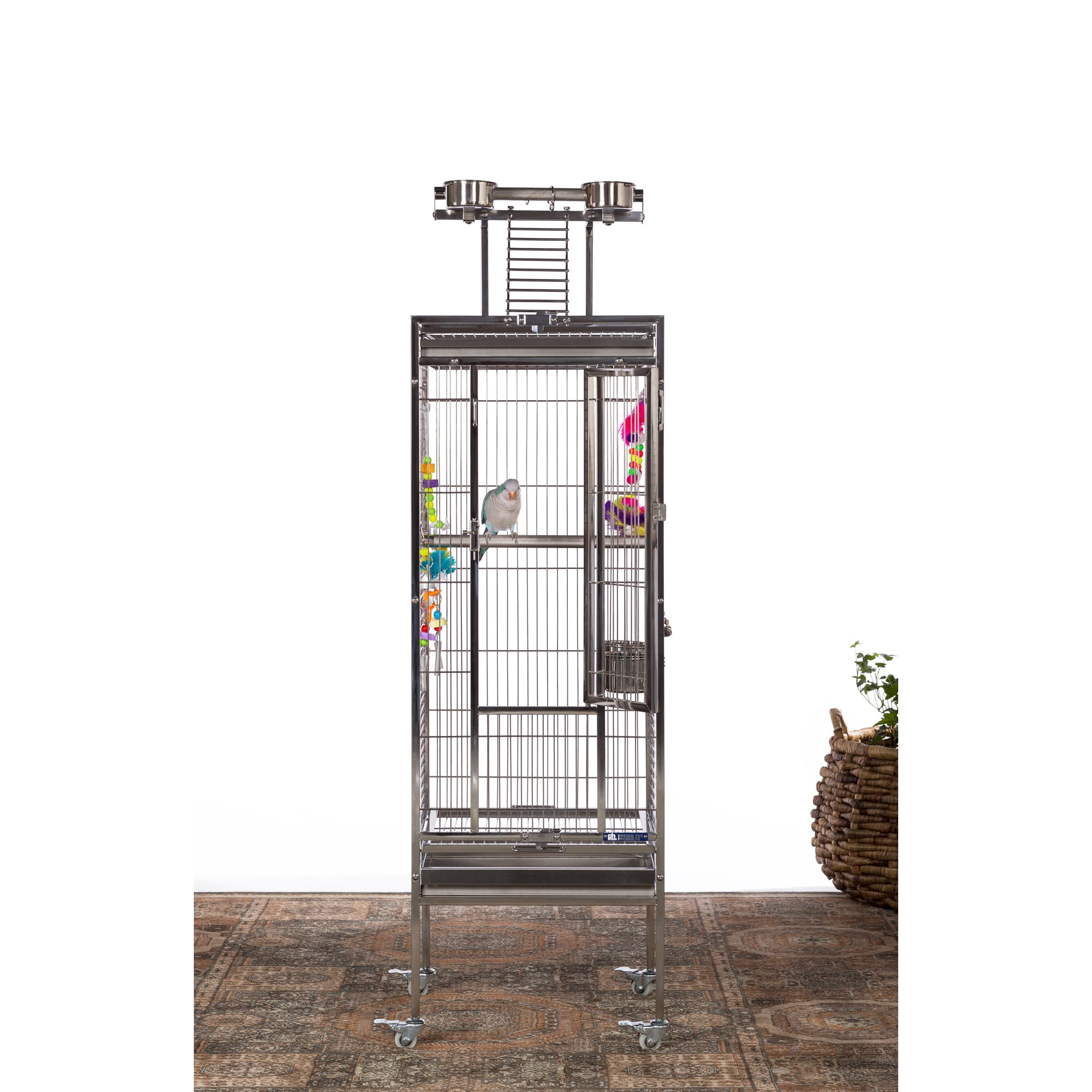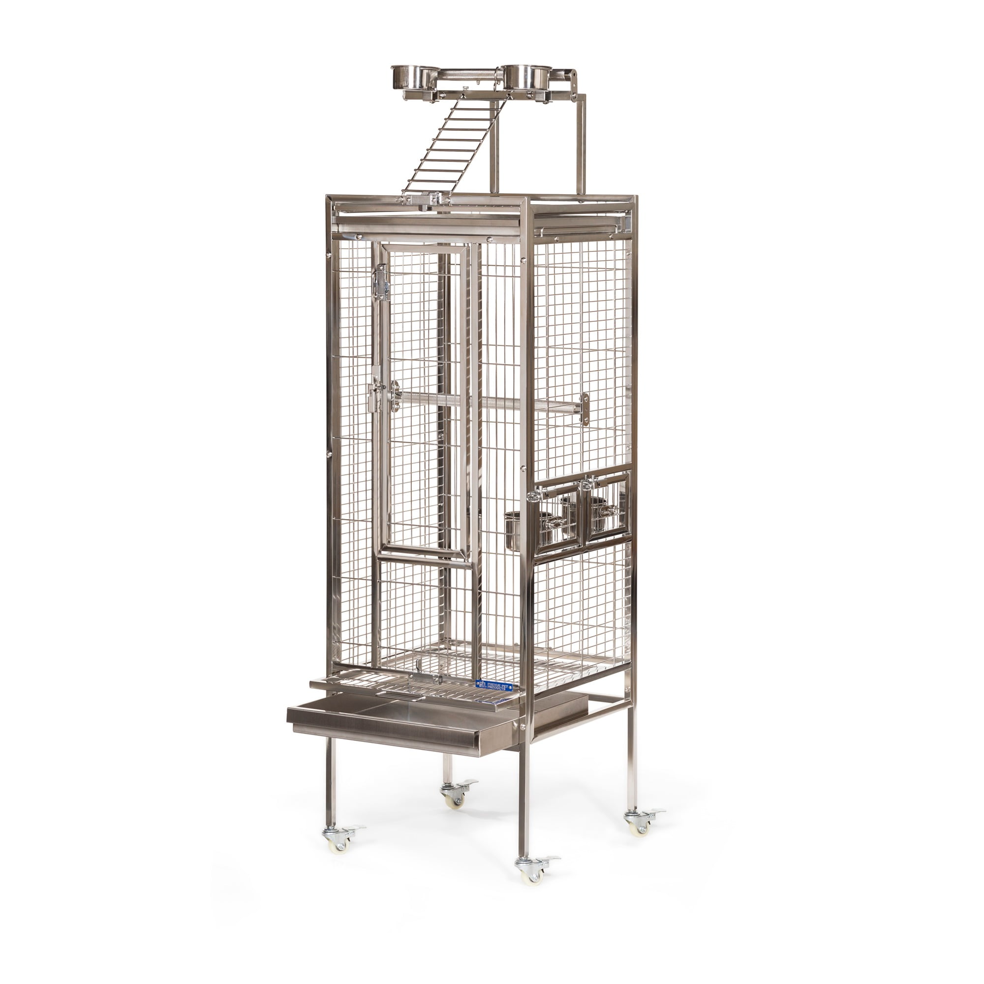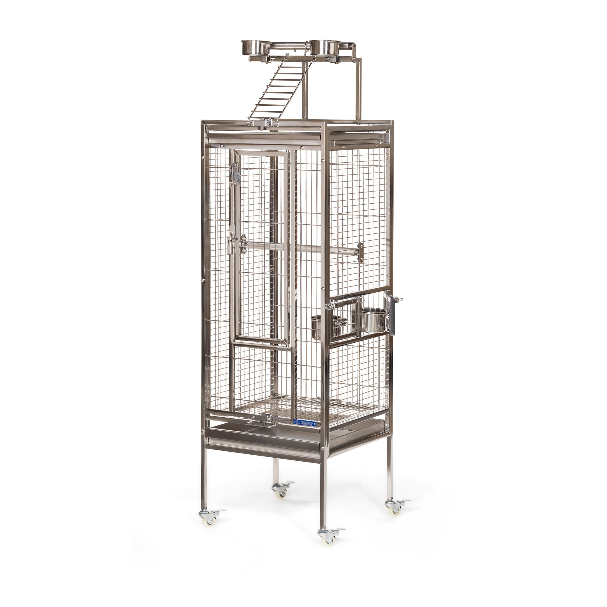 Prevue Pet Products All Stainless Steel Bird home – even the perches! Large front door features two different styles of bird-proof locks Lock-in-place Stainless Steel Food and water cups Pull out grilles & trays with grille locks 17 3/4’’ long, 17 3/4’’ wide and 61 1/4’’ high (to top of play top) with 3/4” wire spacing