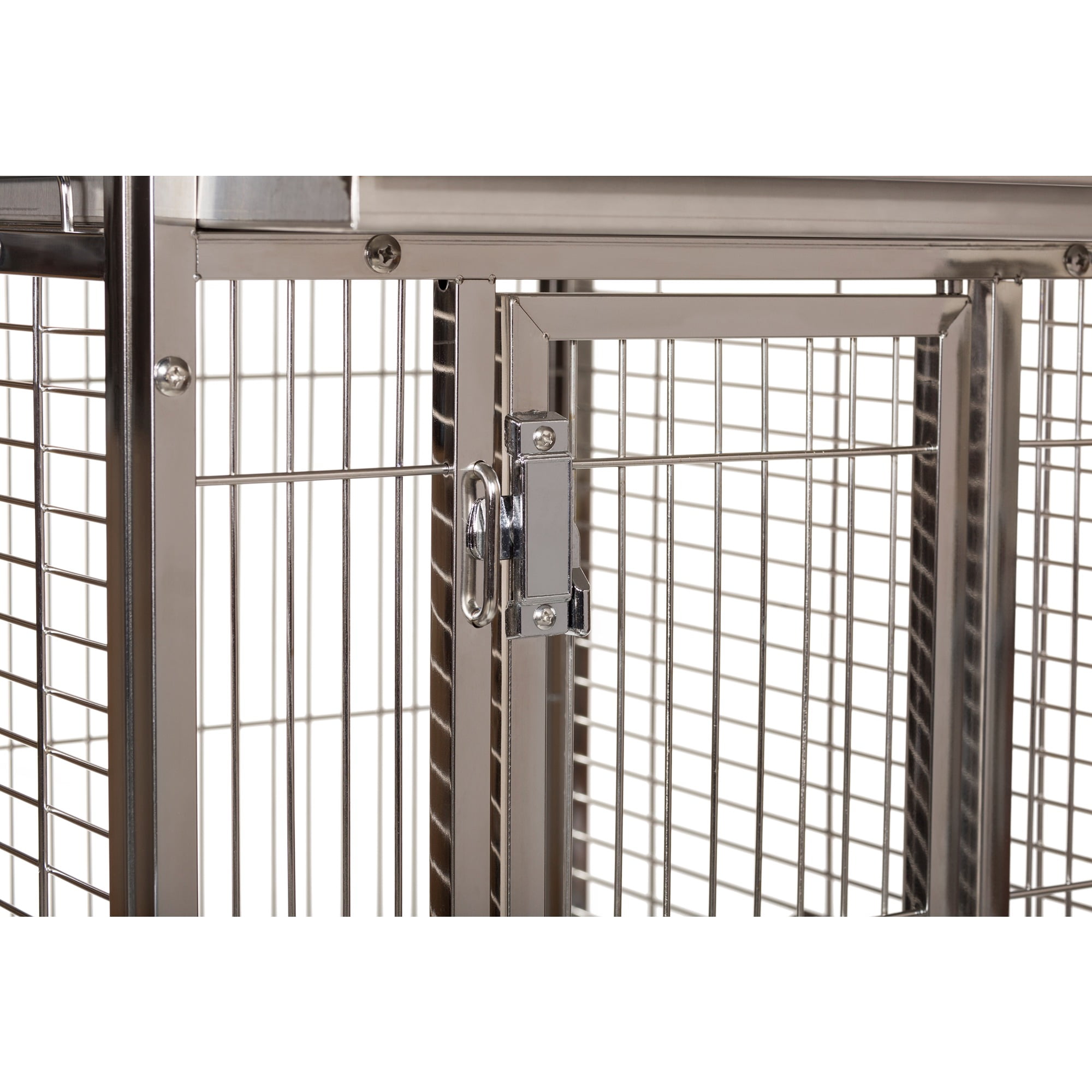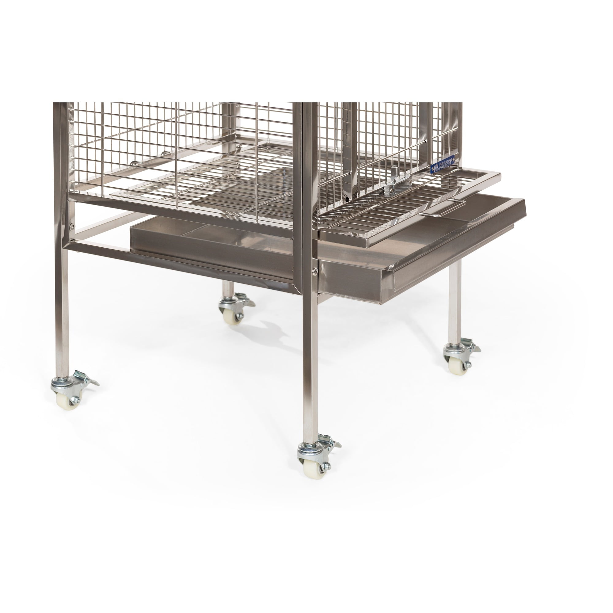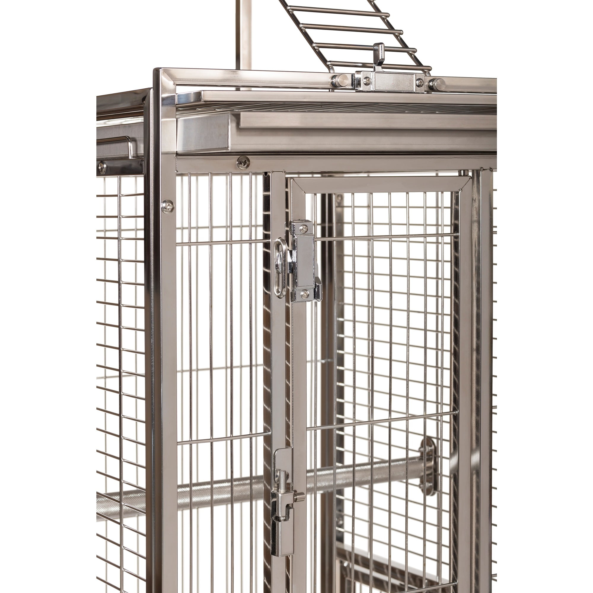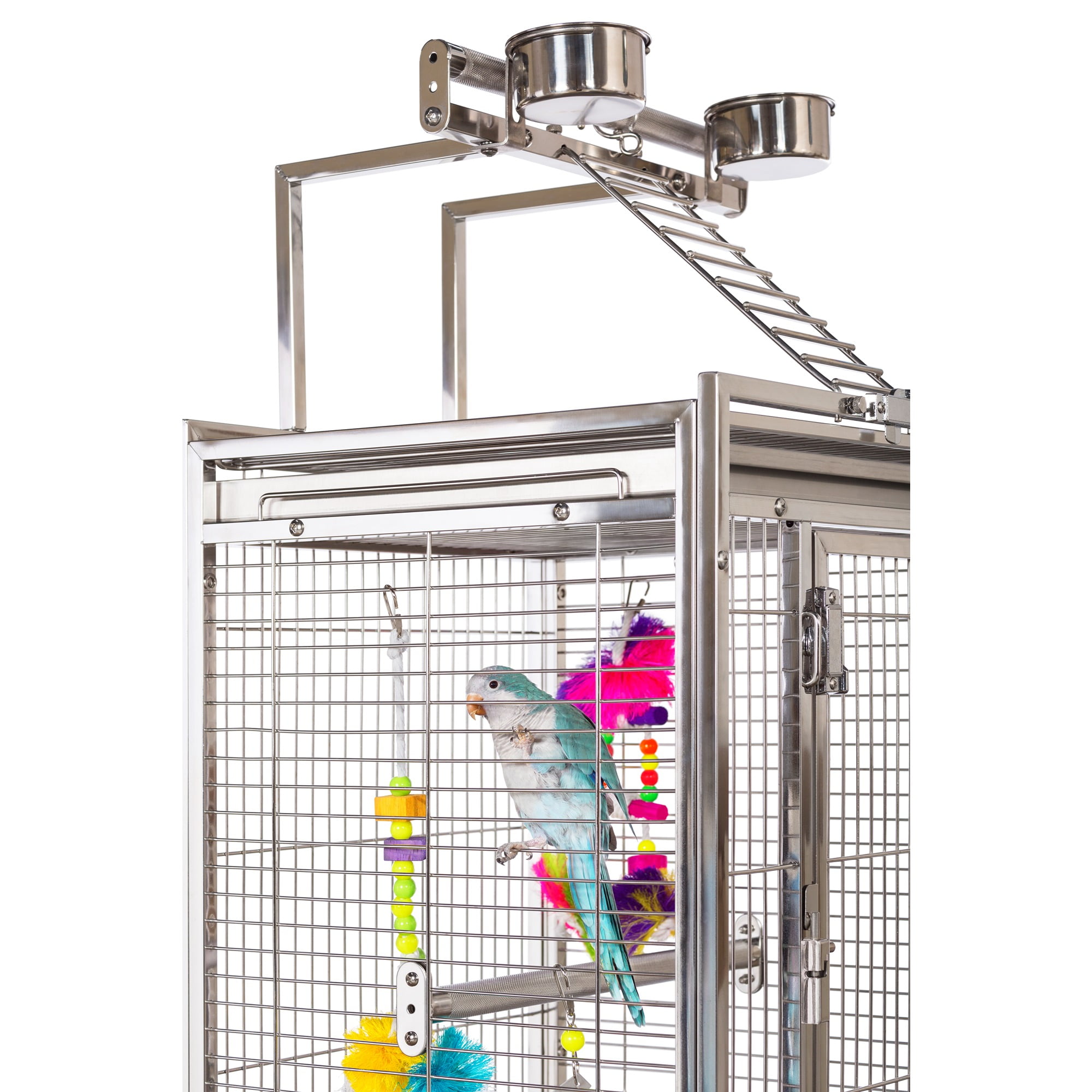 Prevue Pet Products All Stainless Steel Bird home – even the perches! Large front door features two different styles of bird-proof locks Lock-in-place Stainless Steel Food and water cups Pull out grilles & trays with grille locks 17 3/4’’ long, 17 3/4’’ wide and 61 1/4’’ high (to top of play top) with 3/4” wire spacing