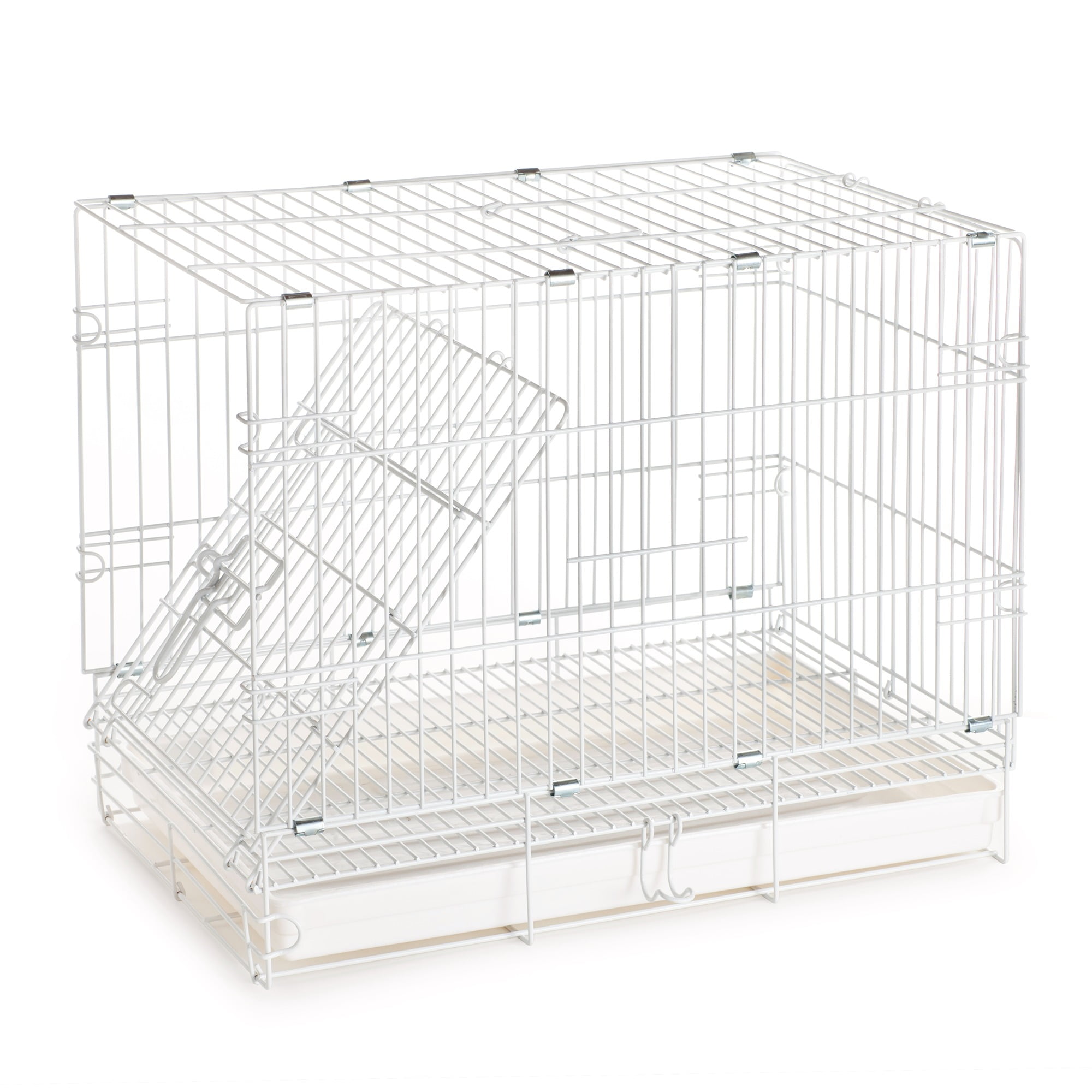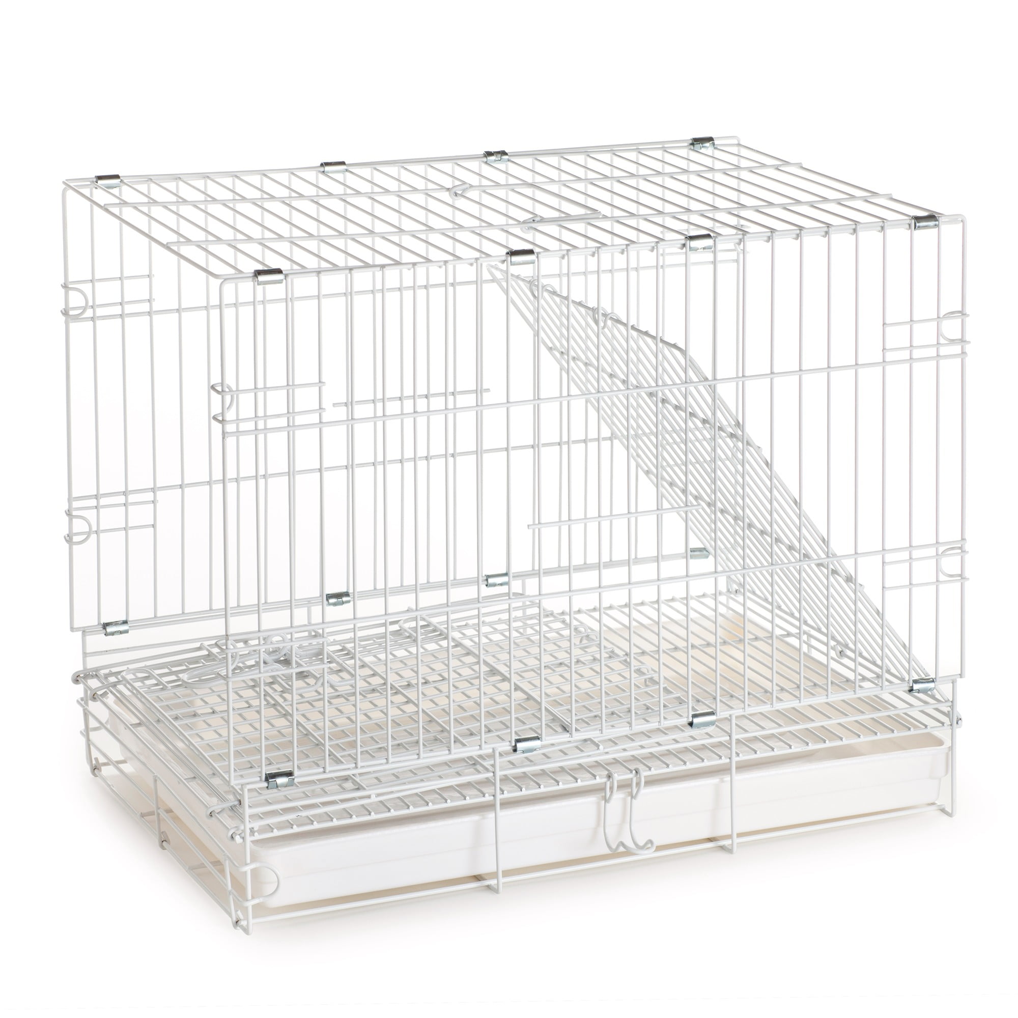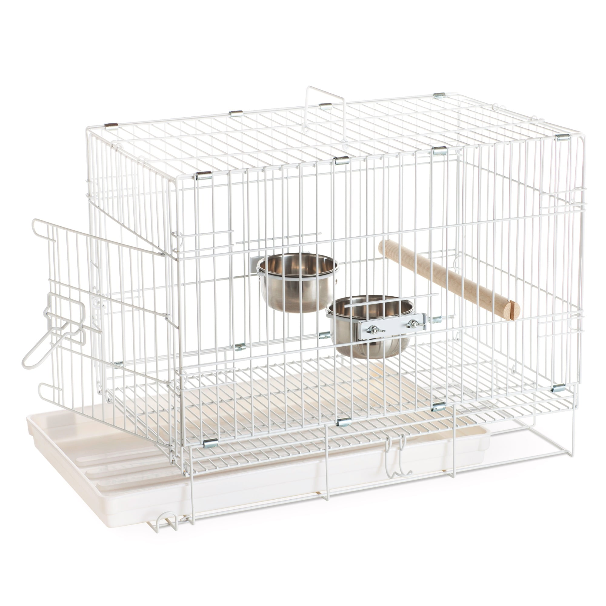 Designed for short-term travel use for medium to large birds Cup holders lock in place to keep cups secure during travel Pull-out debris tray with wire rail stopper to hold tray in place Large 9 inch x 9 inch access door Integrated bottom grille is not removable 7/8″ diameter wood perch Cage folds & packs flat for storage Model NO : 1305 Travel Cage