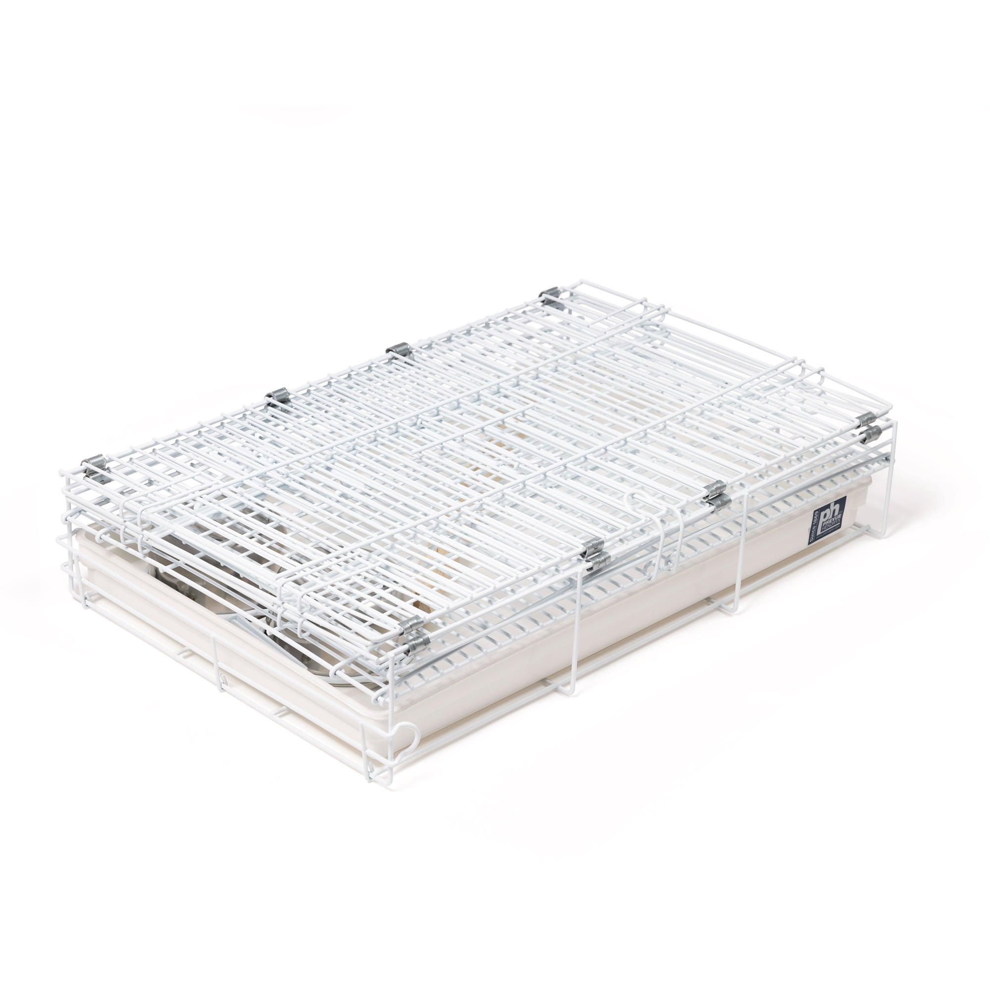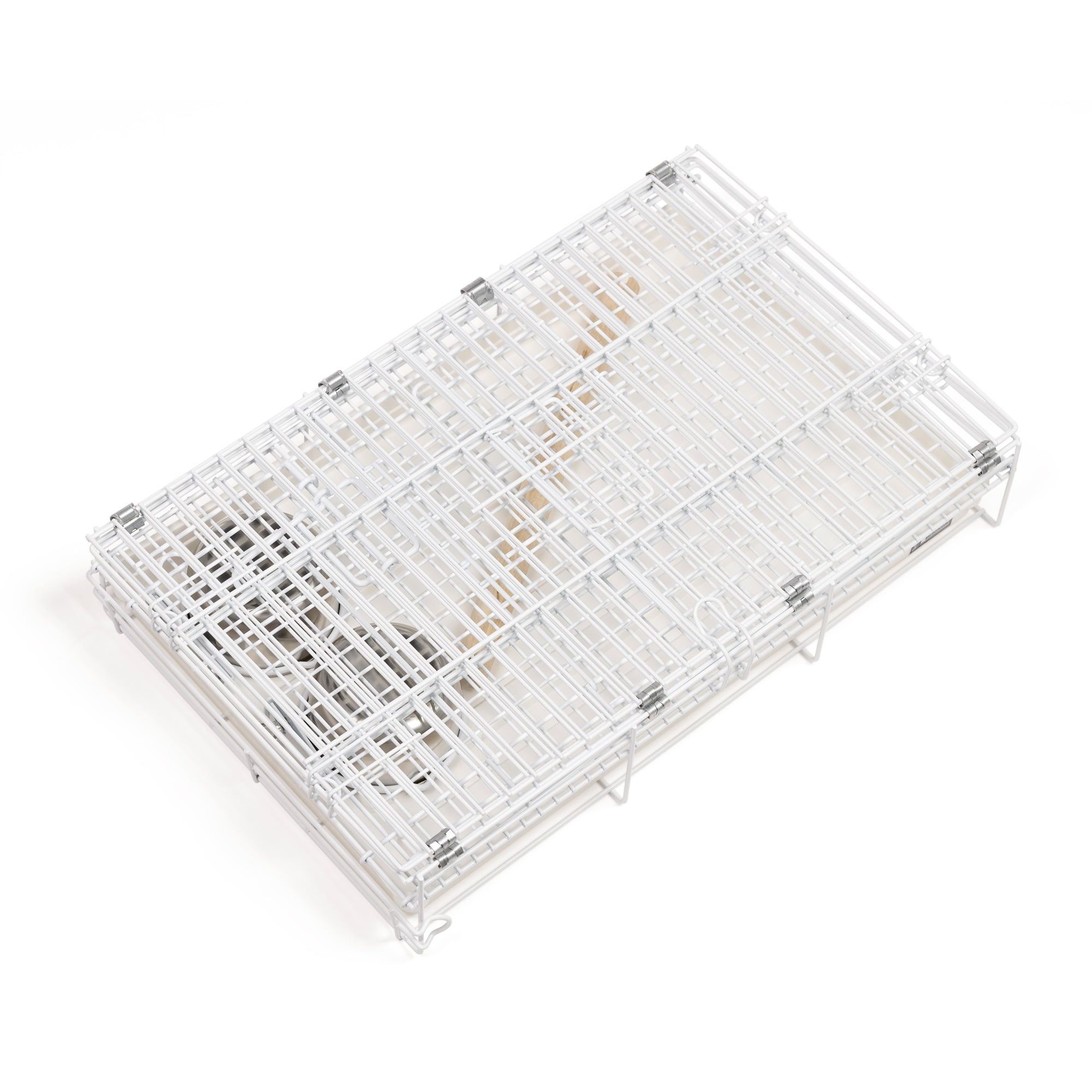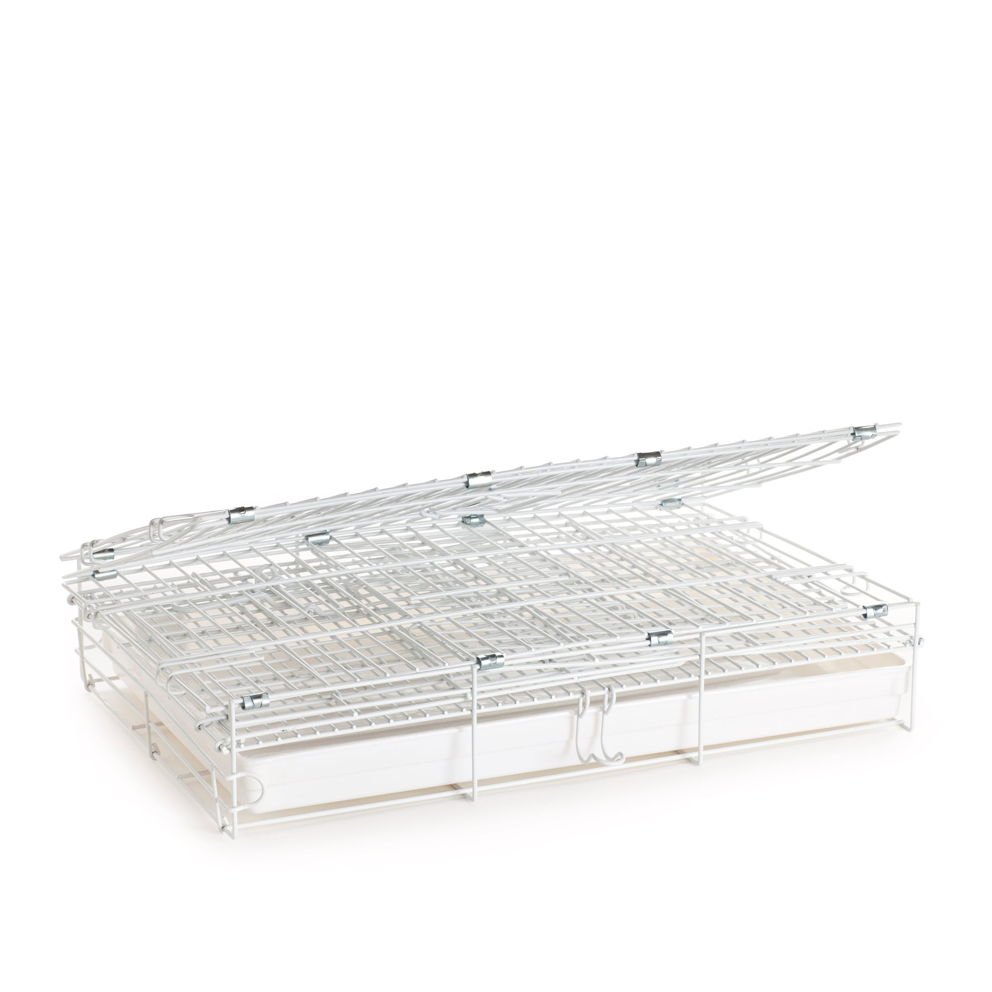 Designed for short-term travel use for medium to large birds Cup holders lock in place to keep cups secure during travel Pull-out debris tray with wire rail stopper to hold tray in place Large 9 inch x 9 inch access door Integrated bottom grille is not removable 7/8″ diameter wood perch Cage folds & packs flat for storage Model NO : 1305 Travel Cage