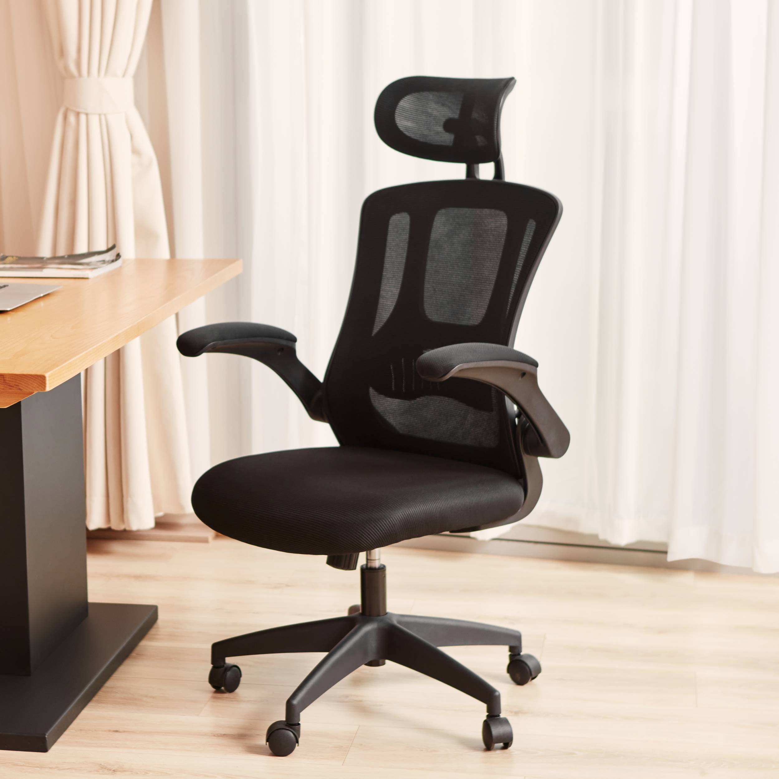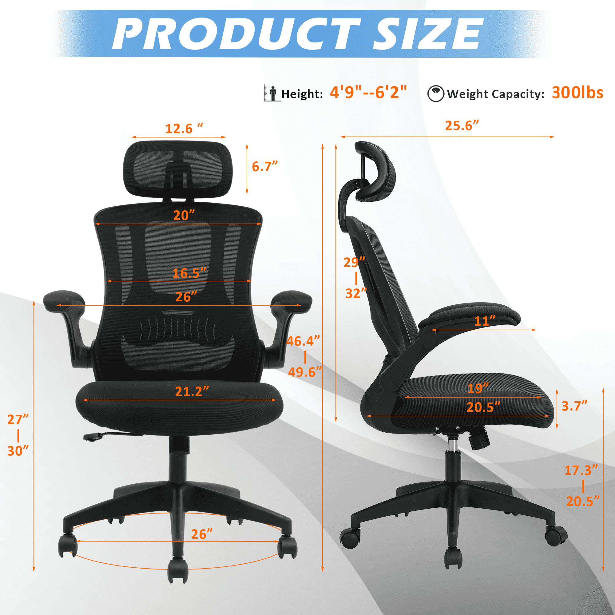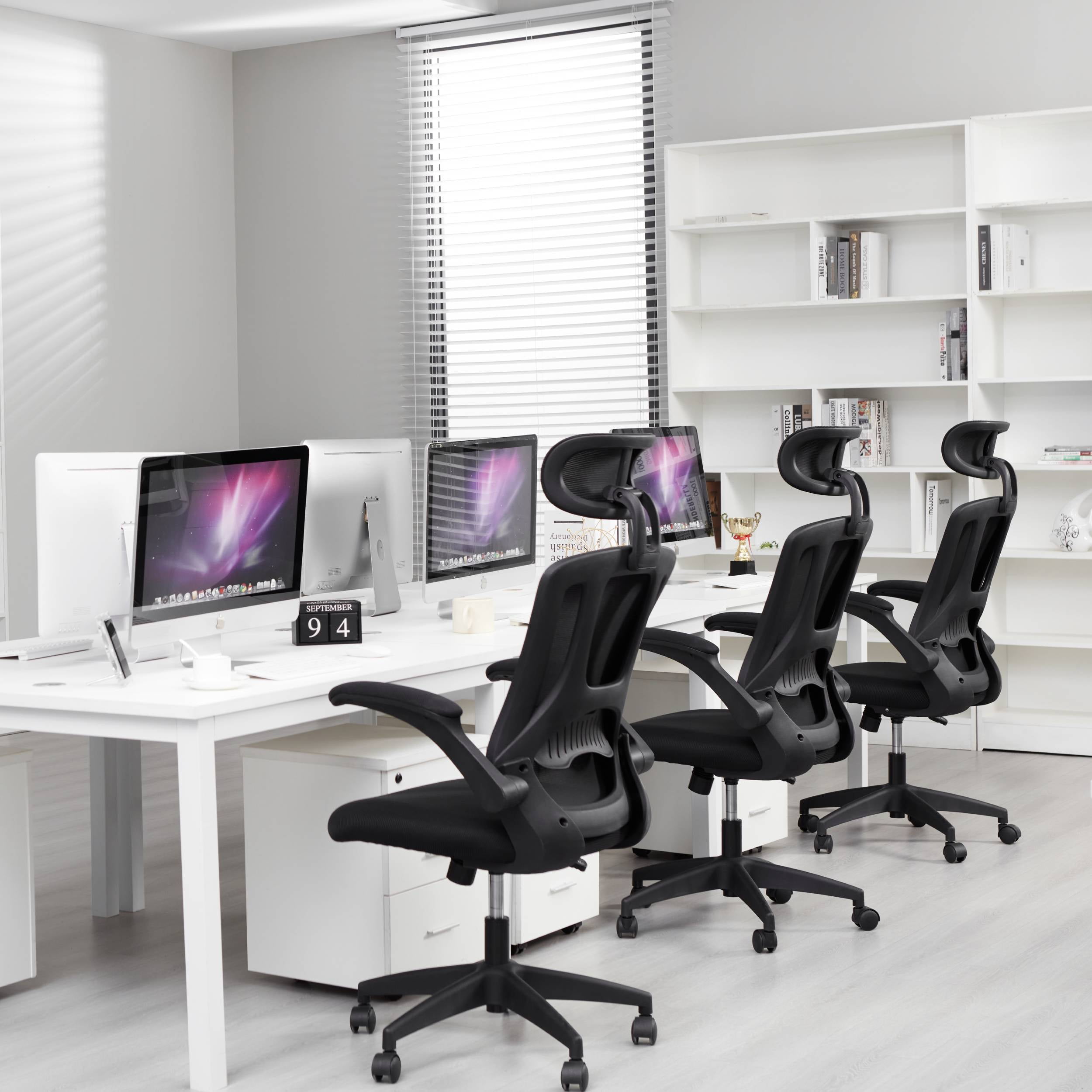 【Ergonomic office chair】The ergonomic computer chair provides 4 supporting points(head/ back/ hips/ hands) and a proper lumbar support. The lockable reclining function allows you to tilt and lock the backrest to any position you desire. With a breathable mesh backrest, sturdy frame, and soft lumbar support pillow, this high-back mesh chair offers a level of ergonomic support and comfort that is unbeatable. 【Adjustable office chair】The adjustable headrest, and height-adjustable feature of this home office desk chair allow you to customize your sitting experience to meet your specific needs. Whether you are working, gaming, or simply relaxing, this chair has got you covered.The adjustable flip-up armrests allow you to customize your seating position, Folding the armrests up 45°, you can push the executive office chairs directly under the desk to save valuable space. 【Comfortable Breathable Mesh Seat】 He mesh back and mesh seat keep air circulation for extra comfy. High quality mesh resists abrasion and transformation, it makes the high back computer desk chairs good for sitting for 4 ~ 8 hours, perfect for a long day sitting.The recline function makes you tilt the backrest back (90~120°) or sit straight freely. 【Mute wheels】With its sturdy nylon base and smooth-rolling casters, The 360-degree swivel feature allows for easy maneuverability without any worries about tipping over or damaging your floor.while the adjustable 3D headrest provides personalized comfort and support for your neck and head, with the ability to tilt up to 45 degrees. 【Suitable for any scene】This home office desk chair also used as student office chairs, computer chairs, ergonomic chairs, desk chairs, and gaming chairs. This office chair also suits office workers, home office workers. Wherever you are, This computer chair is a perfect match for. 【WE ASSURED】The installation manual is included in the package, so you can easily assemble your new chair without any extra tools or fittings. If you have any questions or concerns, our professional customer service team is always available to assist you. So, rest assured that you’re making the right choice when you invest in this high-quality mesh office chair.