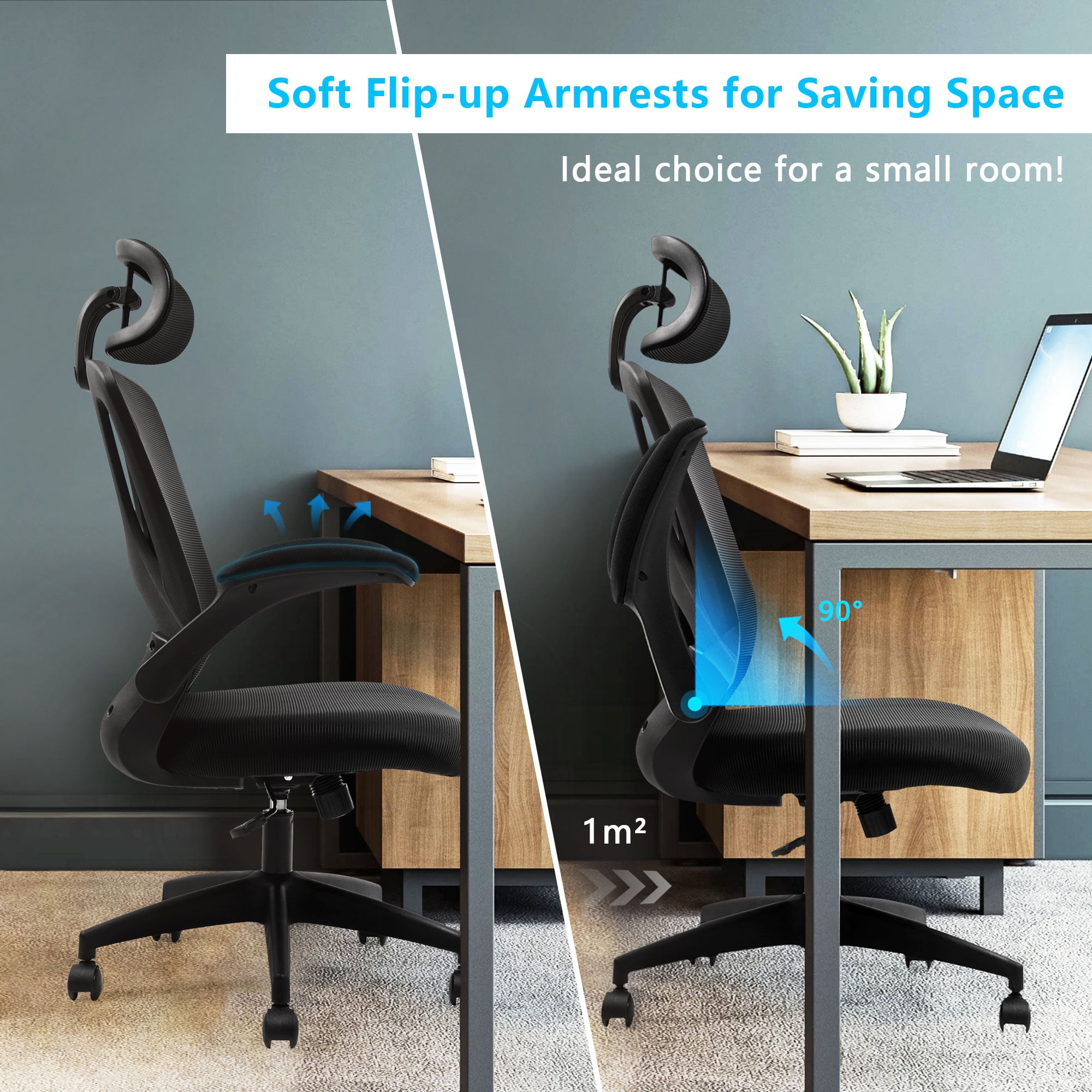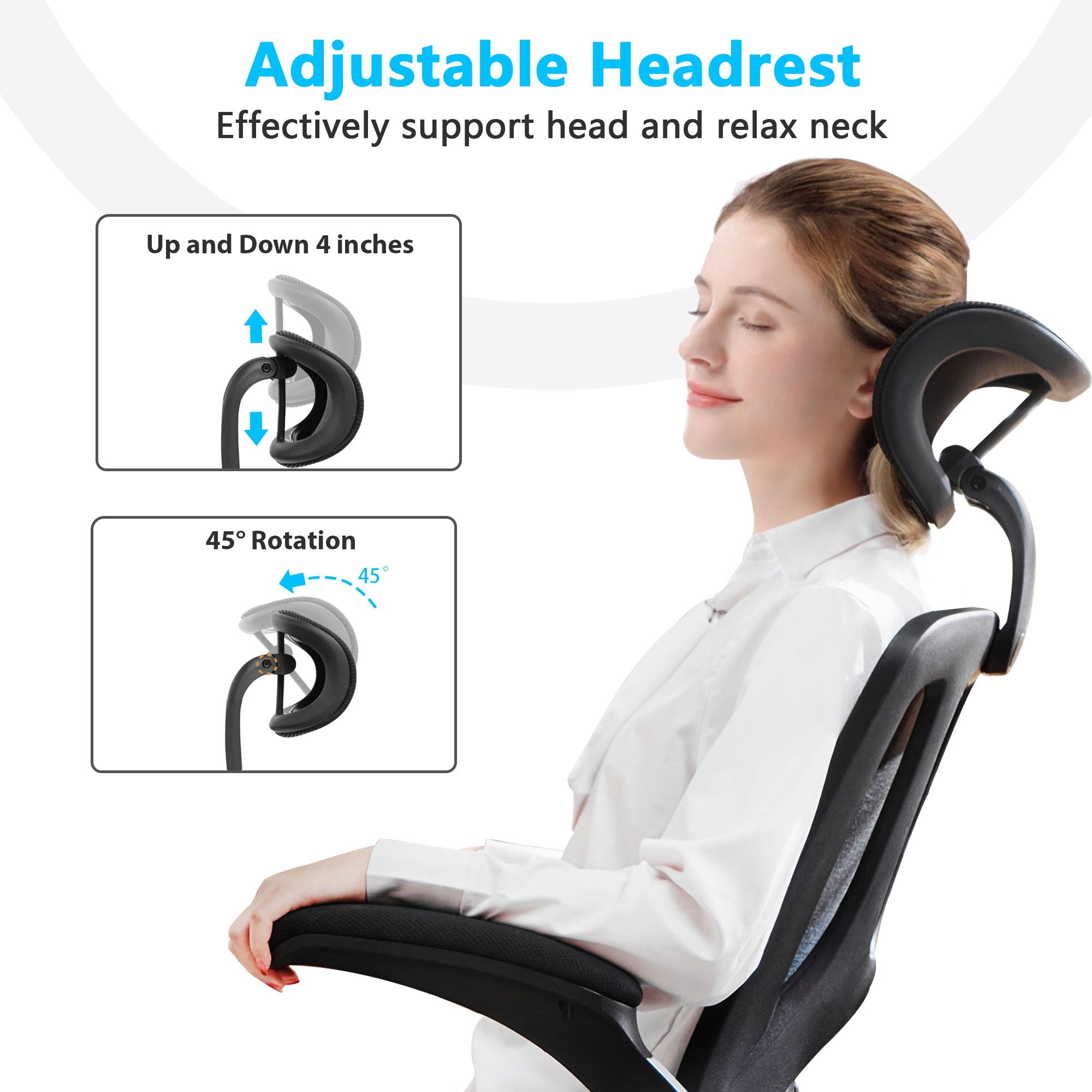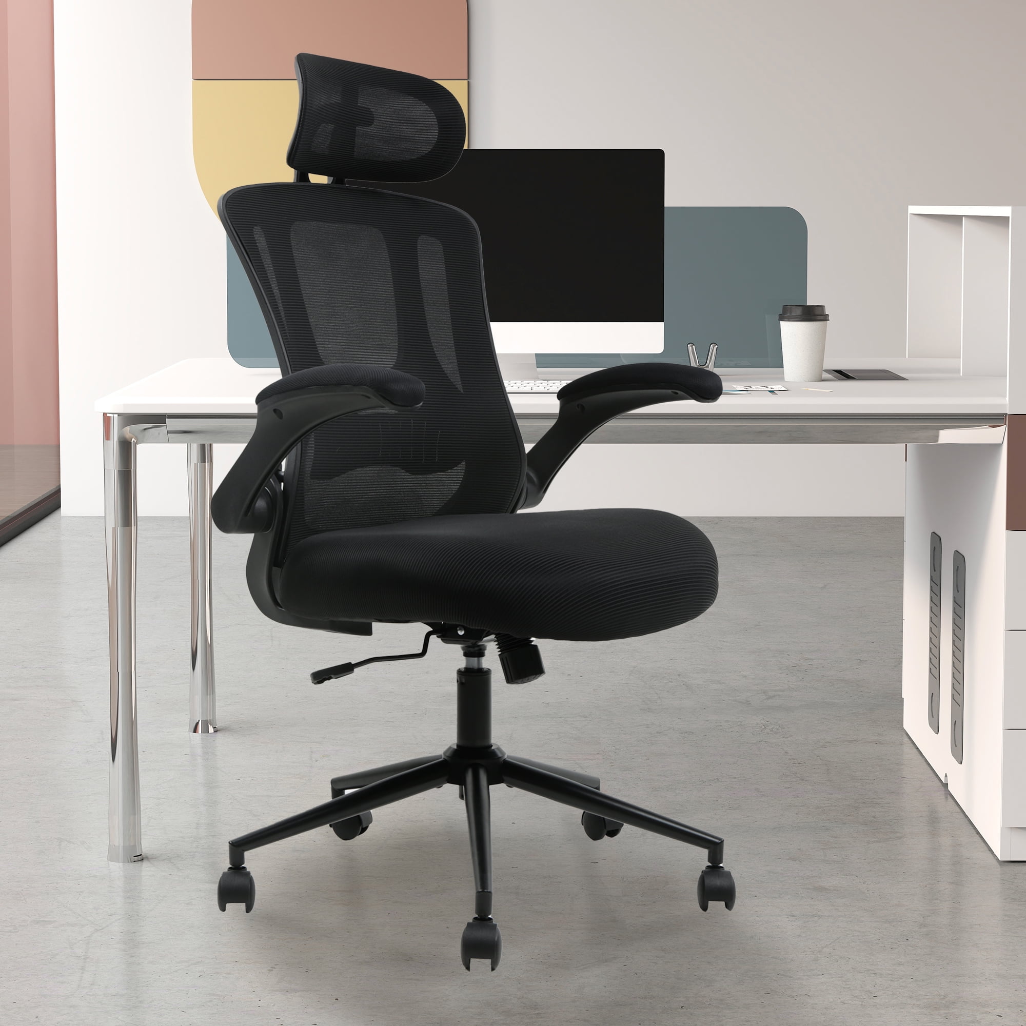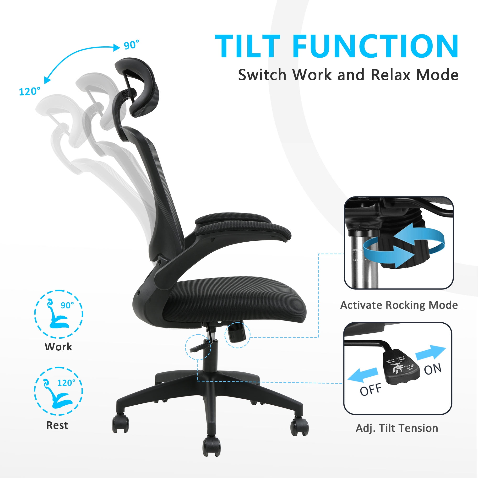 【Ergonomic office chair】The ergonomic computer chair provides 4 supporting points(head/ back/ hips/ hands) and a proper lumbar support. The lockable reclining function allows you to tilt and lock the backrest to any position you desire. With a breathable mesh backrest, sturdy frame, and soft lumbar support pillow, this high-back mesh chair offers a level of ergonomic support and comfort that is unbeatable. 【Adjustable office chair】The adjustable headrest, and height-adjustable feature of this home office desk chair allow you to customize your sitting experience to meet your specific needs. Whether you are working, gaming, or simply relaxing, this chair has got you covered.The adjustable flip-up armrests allow you to customize your seating position, Folding the armrests up 45°, you can push the executive office chairs directly under the desk to save valuable space. 【Comfortable Breathable Mesh Seat】 He mesh back and mesh seat keep air circulation for extra comfy. High quality mesh resists abrasion and transformation, it makes the high back computer desk chairs good for sitting for 4 ~ 8 hours, perfect for a long day sitting.The recline function makes you tilt the backrest back (90~120°) or sit straight freely. 【Mute wheels】With its sturdy nylon base and smooth-rolling casters, The 360-degree swivel feature allows for easy maneuverability without any worries about tipping over or damaging your floor.while the adjustable 3D headrest provides personalized comfort and support for your neck and head, with the ability to tilt up to 45 degrees. 【Suitable for any scene】This home office desk chair also used as student office chairs, computer chairs, ergonomic chairs, desk chairs, and gaming chairs. This office chair also suits office workers, home office workers. Wherever you are, This computer chair is a perfect match for. 【WE ASSURED】The installation manual is included in the package, so you can easily assemble your new chair without any extra tools or fittings. If you have any questions or concerns, our professional customer service team is always available to assist you. So, rest assured that you’re making the right choice when you invest in this high-quality mesh office chair.