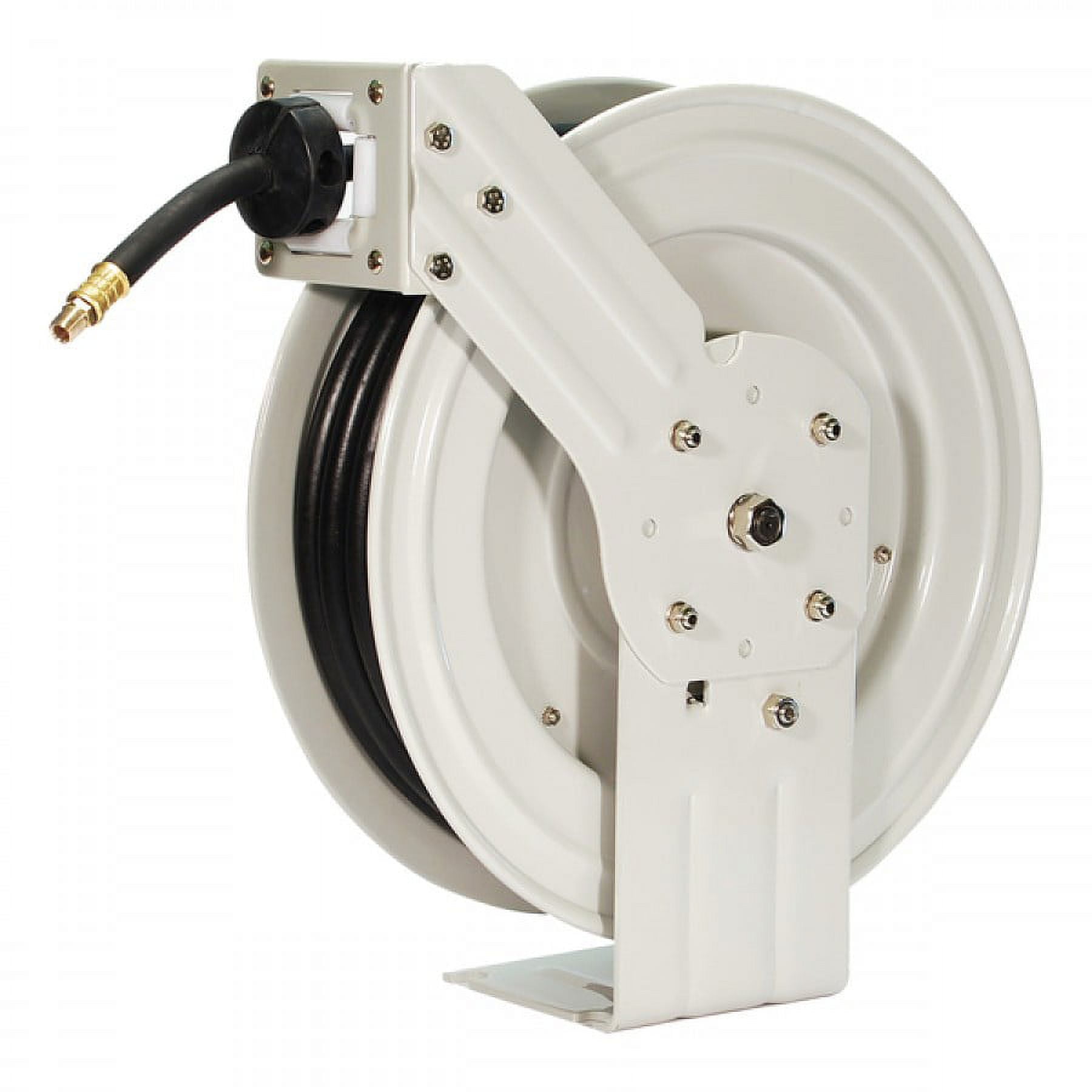 The Primefit Industrial-Grade Retractable Air Hose Reel with 50-Foot Rubber Air Hose is great for do-it-yourself projects to professional and industrial applications. The PrimeFit retractable 50′ air hose reel takes all the work out of coiling and storing air hoses in your shop, garage or workplace. This professional-grade, all-steel construction hose reel features a corrosion-resistant powder-coat finish for added life and increased durability.