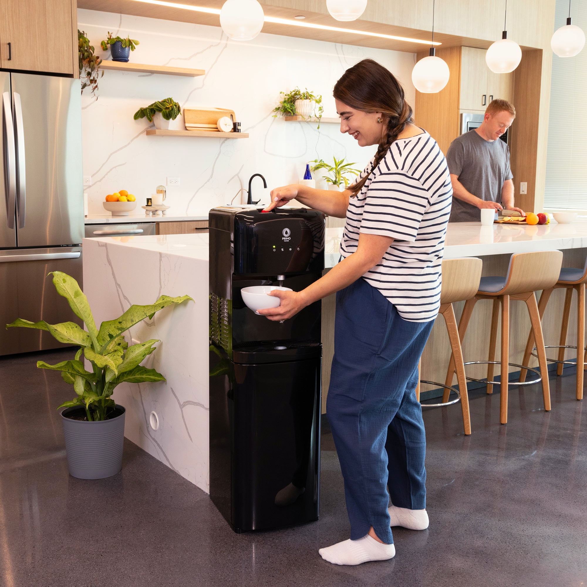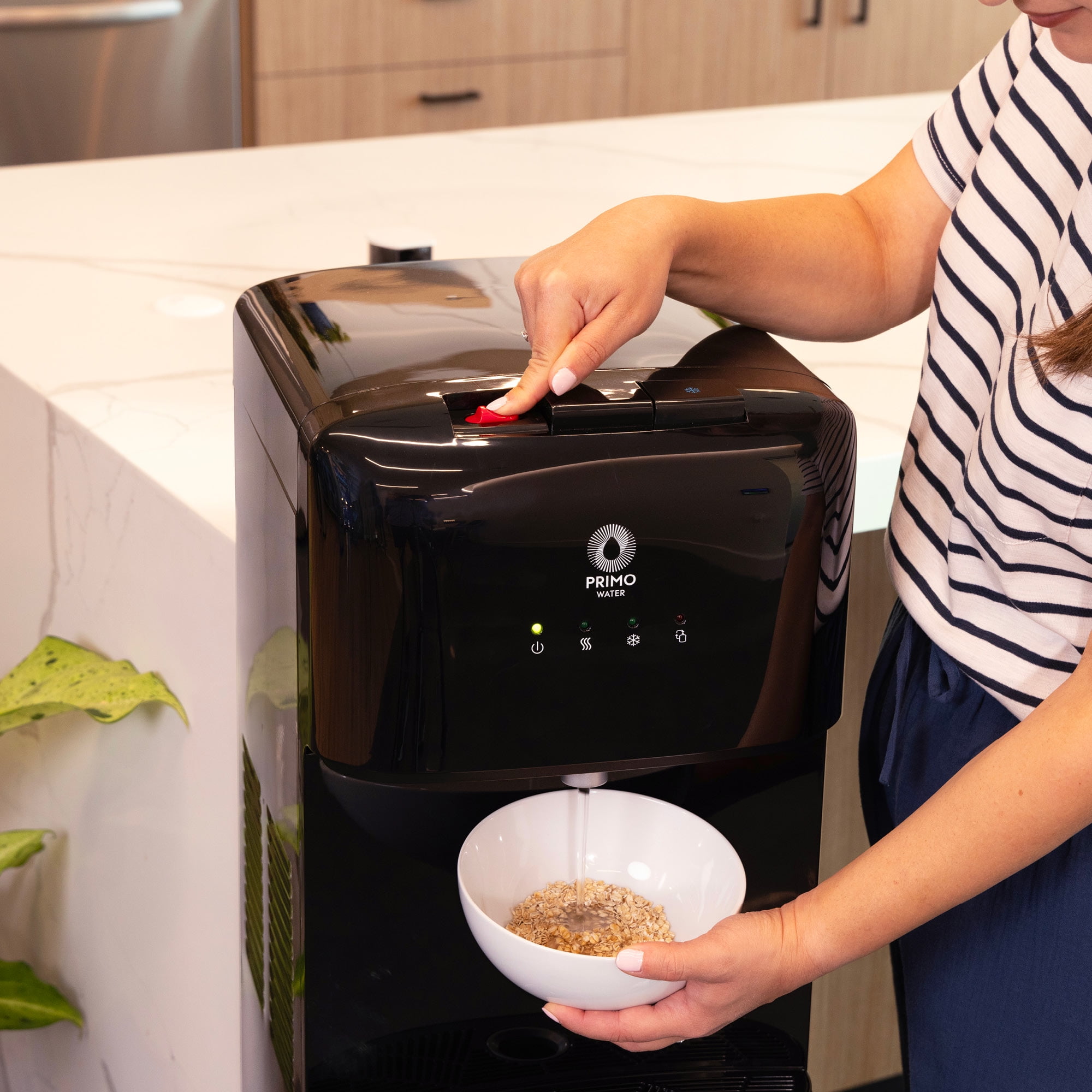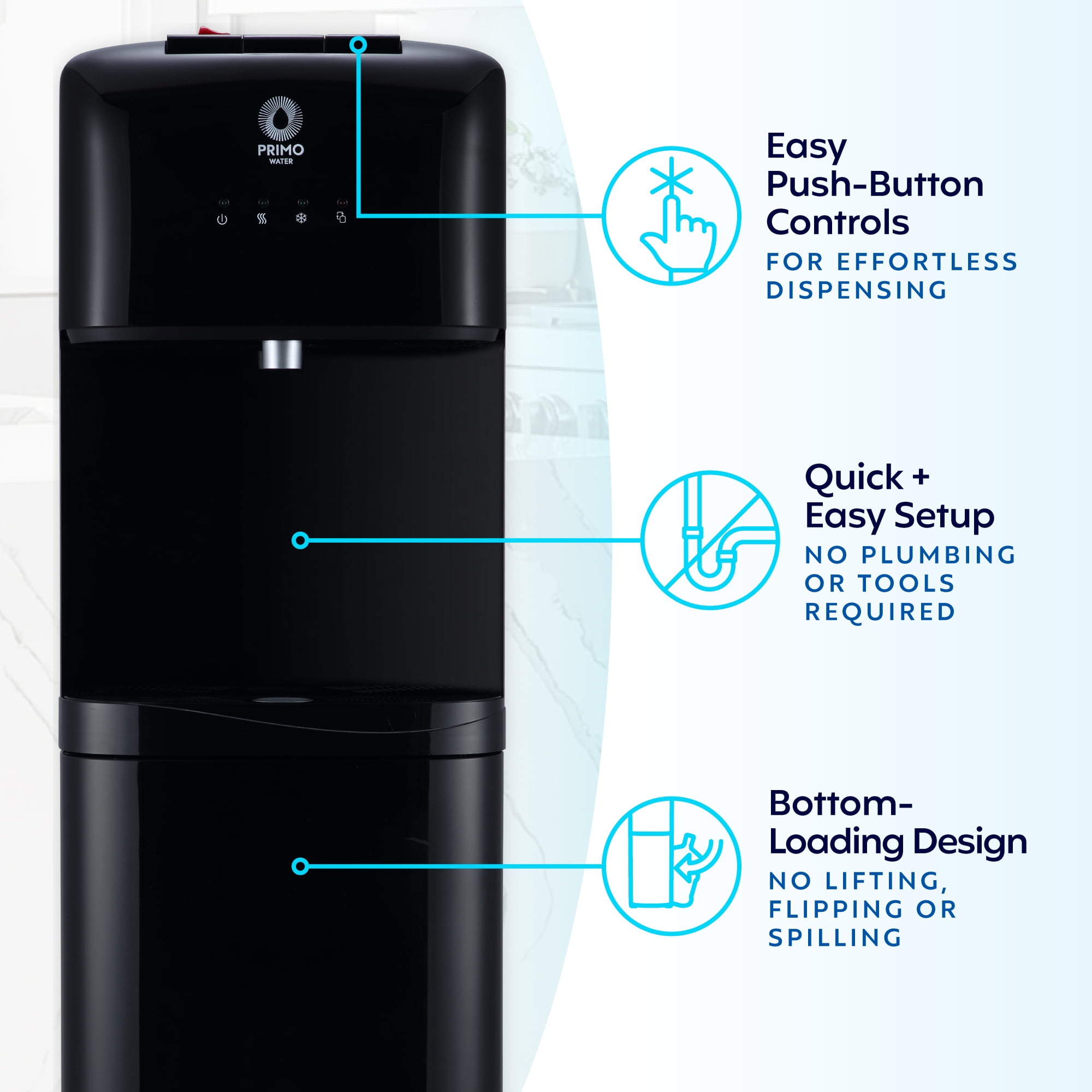 Enjoy hot sips or cold refreshment with this classic water dispenser that delivers on everyday hydration and convenience. The bottom-loading design means no heavy lifting, flipping, or spilling—just load your Primo Water™ bottle and start dispensing. With simple, push-button controls and quiet heating and cooling, it fits into your routine without getting in the way. The stainless-steel reservoirs help maintain great-tasting water and resist corrosion over time, while the 2-step hot water child safety lock adds peace of mind. Start your hydration journey with no plumbing, tools, or hassle required. Plus, enjoy free water coupons with your dispenser purchase.