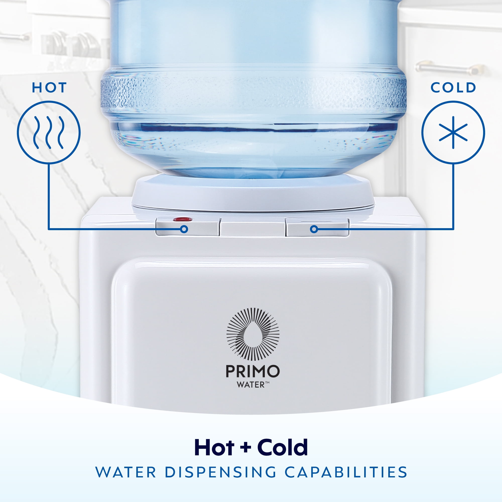 Dispenses 2 temperatures: cold and hot water Mess-free, spill-proof bottle holder with leak guard Push-button controls with child-safety feature No filters to maintain Quiet cooling and heating Quick and easy set-up, no plumbing required Removable, dishwasher safe drip tray Designed for use with Primo® Water 3- and 5-gallon bottles Coupons for Primo® Water included (*up to a $14.99 value)