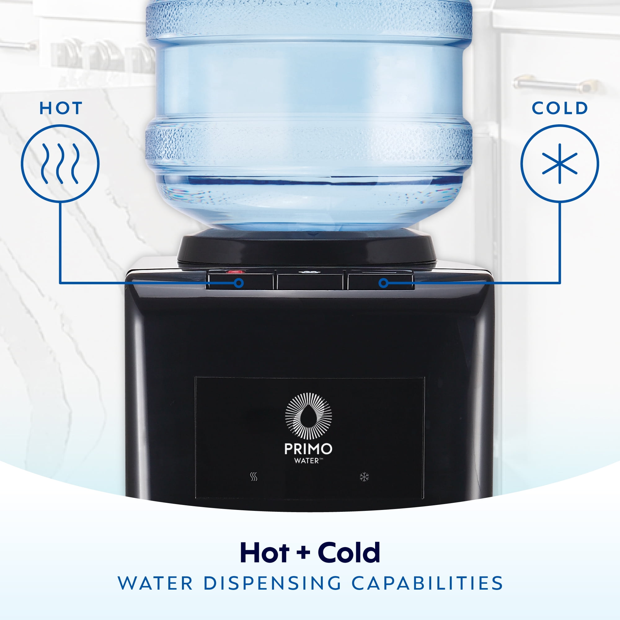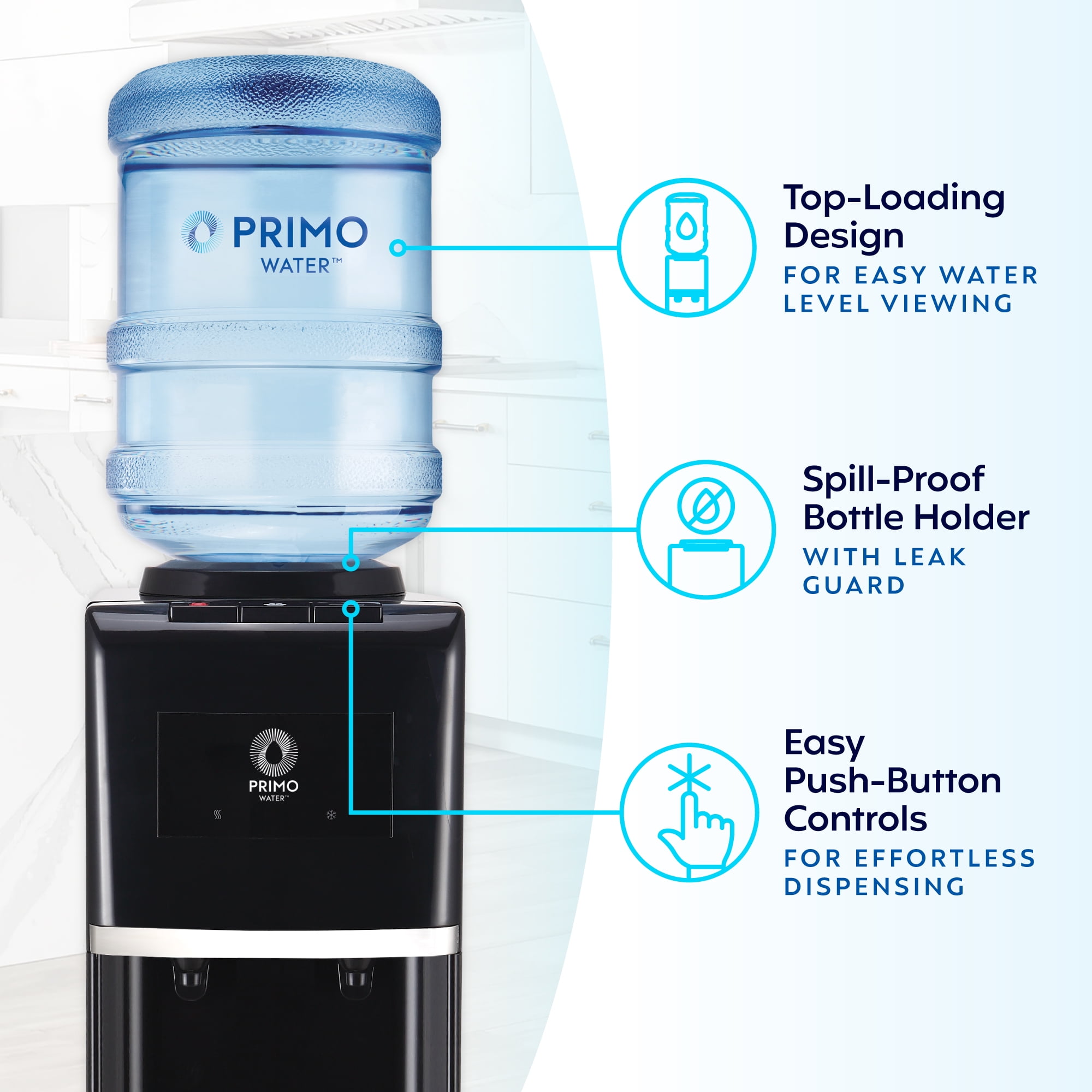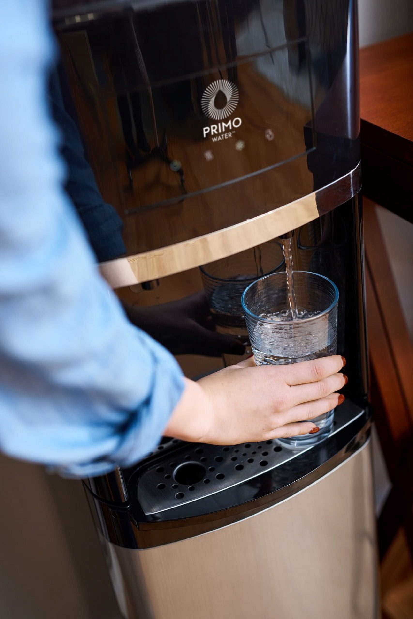 Dispenses 3 temperatures: cold, room temp, and hot water Designed with a high dispensing area to accommodate tall bottles and tumblers effortlessly. Top loading design for easy water level viewing Spill-proof bottle holder with leak guard Easy push-button controls for effortless dispensing FREE water coupons included with dispenser purchase Quiet heating and cooling for minimal disruption Fast-flow dispensing to quickly fill cups + bottles Durable stainless steel finishes elevates style and resists wear 2-step hot water child safety lock Removable, dishwasher safe drip tray LED night light illuminates waterspouts to help prevent spills Energy Star compliant UL-certified for safety & reliability