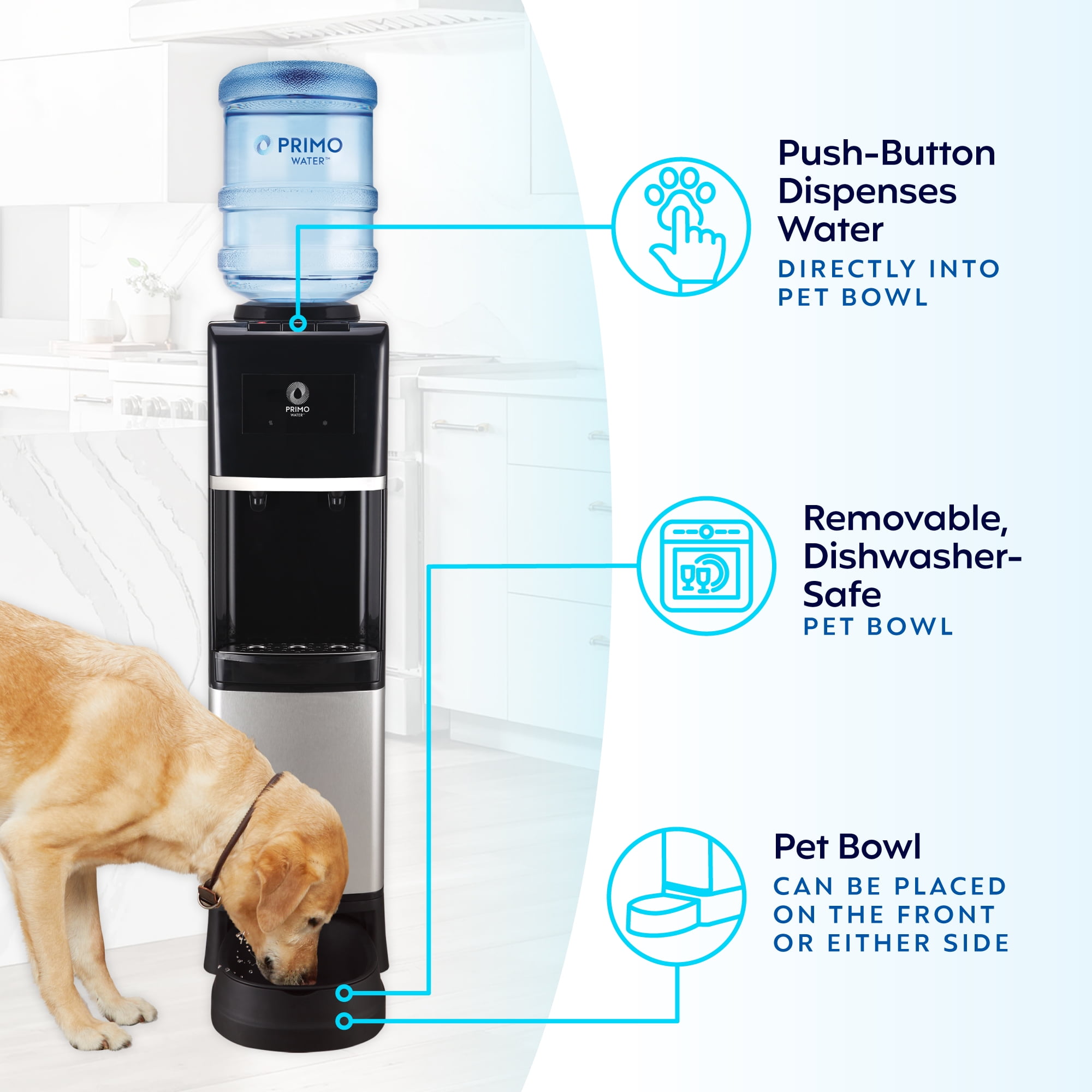 Hydrate your whole family, including your pets, with this versatile top-loading water dispenser. The attachable pet bowl fits on the front or side of the dispenser for more flexibility, making it a great fit as both a home and office water dispenser. A spill-proof bottle holder offers a cleaner pour, and the removable drip tray and pet bowl are both dishwasher-safe for your convenience. Simply load a 3- or 5-gallon water bottle and get your fill of reliable, filtered hydration from a dispenser made with pet-friendly families in mind. Plus, enjoy free water coupons with your Primo Water dispenser purchase.