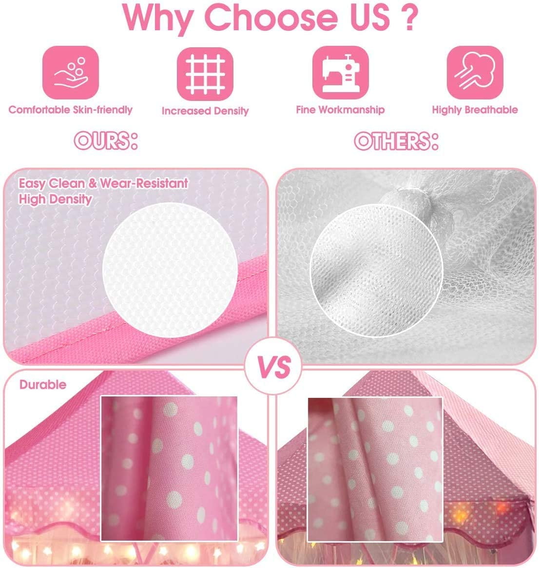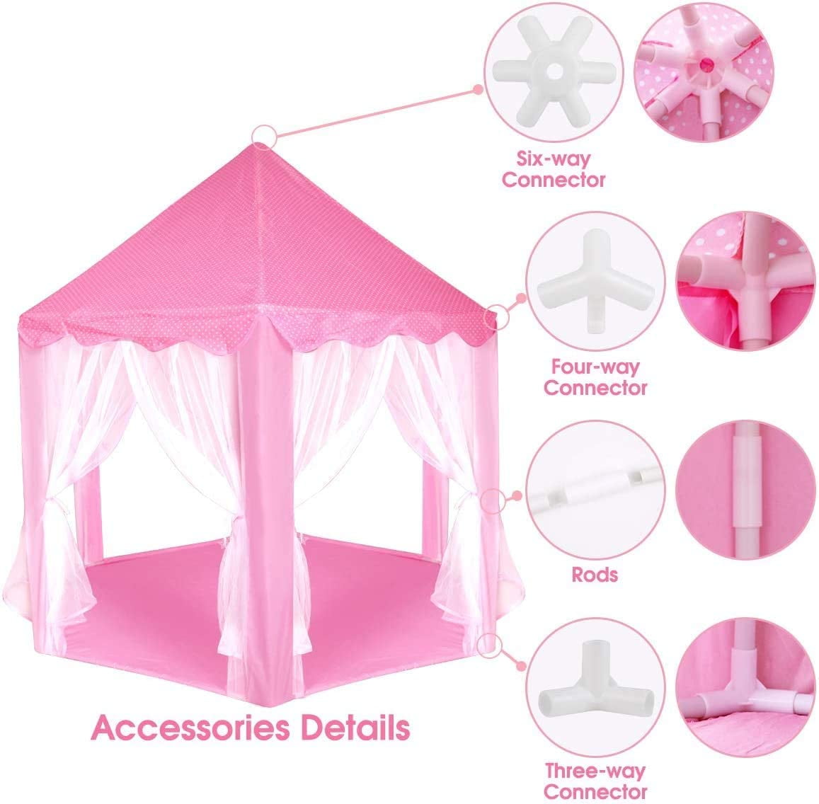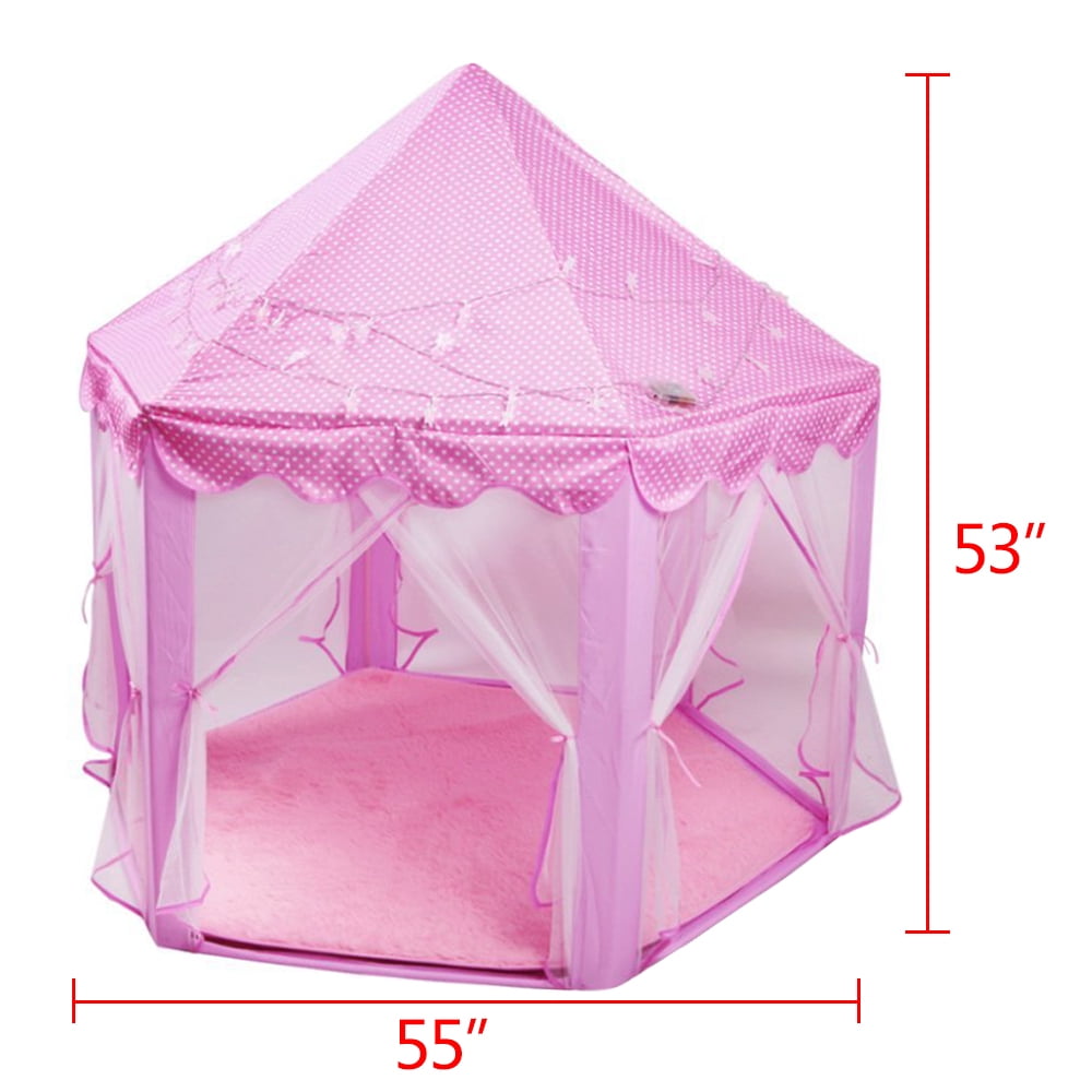 Specifications The Hexagon Rug: Rug Material: Coral fleece+ Sponge+ Flannelette w/ anti-slip granules Rug Color:Pink The length of angle to angle: 140 cm/55.11” The length of midcourt line: 120cm/47.24” The length of each side: 68cm/26.77” The Play Tent: Tent Material: 230T Polyester pongee+PVC Tent Dimension: 55″ (Diameter) x 53″ (H) Tent Color:Pink The String Lights: Length of string lights: 24.6ft Light Color: Warm white light Quantity of light: 50 Power Supply: 3×AAA batteries(not included) Rug Material: Coral fleece+ Sponge+ Flannelette w/ anti-slip granules Rug Color:Pink The length of angle to angle: 140 cm/55.11” The length of midcourt line: 120cm/47.24” The length of each side: 68cm/26.77” Tent Material: 230T Polyester pongee+PVC Tent Dimension: 55″ (Diameter) x 53″ (H) Tent Color:Pink Length of string lights: 24.6ft Light Color: Warm white light Quantity of light: 50 Power Supply: 3×AAA batteries(not included) This is the cutest fairy house tent, providing a private space for your kids to entertain themselves, read and relax This beautiful and remarkable princess house can help your little princess dreams come true Ideal for both indoor and outdoor sites such as home, kindergarten, backyard, parks Gift your child with the magic of having their own special place to read, relax, and play Package included: 1 x Pink Princess Castle Play Tent; 1 x Carrying Bag; 1 x Hexagon Rug; 1 x Warm White String Lights This is the cutest fairy house tent, providing a private space for your kids to entertain themselves, read and relax This beautiful and remarkable princess house can help your little princess dreams come true Ideal for both indoor and outdoor sites such as home, kindergarten, backyard, parks Gift your child with the magic of having their own special place to read, relax, and play Package included: 1 x Pink Princess Castle Play Tent; 1 x Carrying Bag; 1 x Hexagon Rug; 1 x Warm White String Lights