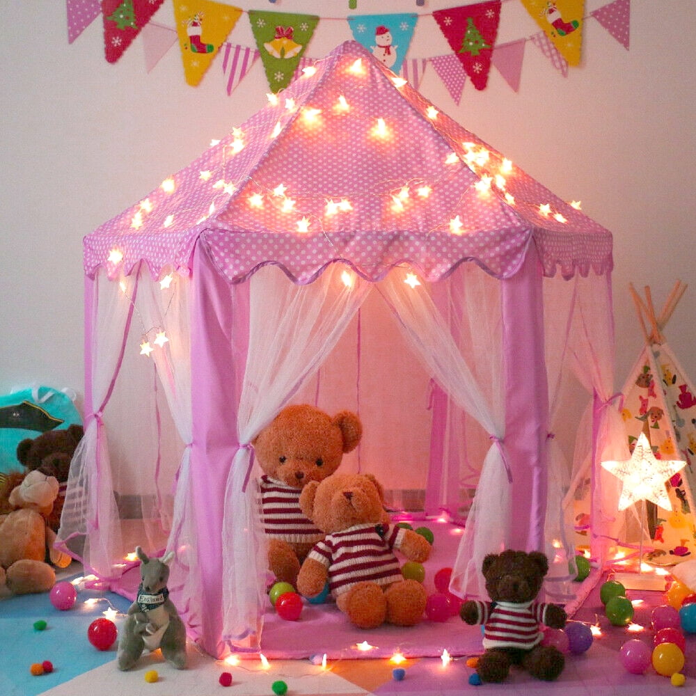 Princess Castle Play Tent Girls Kids Large Playhouse Toy Pink + Rug + Star Light