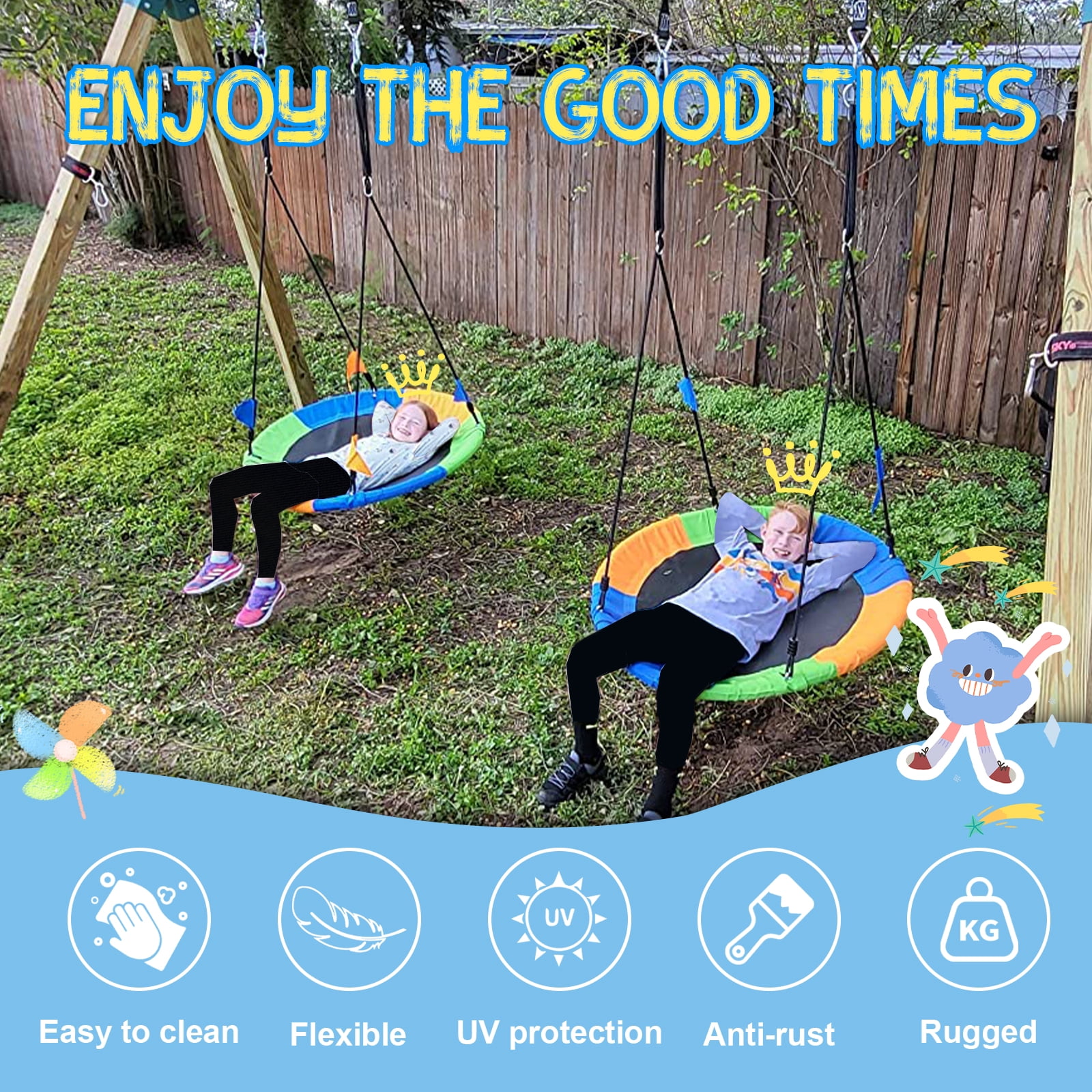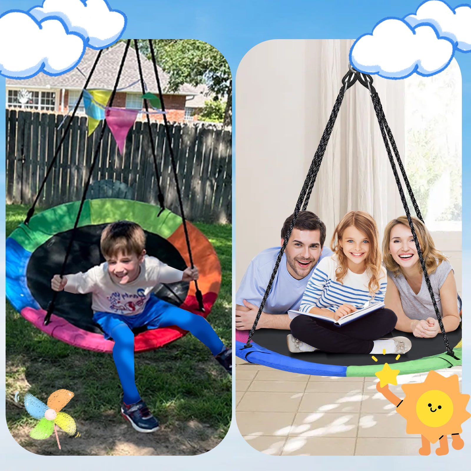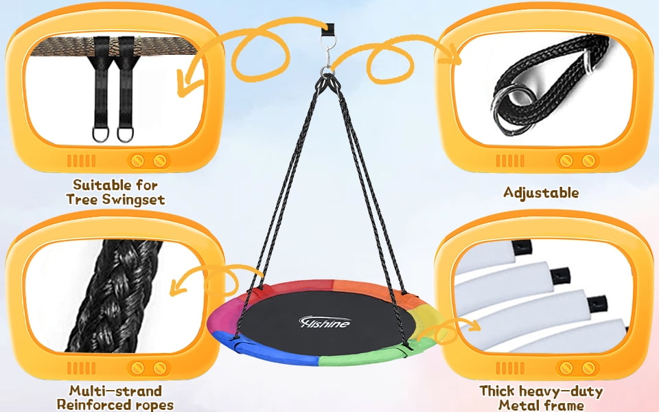 700lbs Weight Capacity- The heavy-duty swing seat and circular steel frame could hold up to 700lbs, strong enough for 3 kids swinging together. Have fun together with your friends. The nest swing is fun for all ages. Your whole family would love it! Easy Installation- The saucer tree swing is easy to set up. Follow the detailed instructions we provide, the swing will be fully assembled in 5 minutes. Please make sure all parts are properly assembled and use it under adult supervision. Strong Integrated connector- Strong integrated connectors connect ropes with frames, better than traditional screw assembly ways where screws are easily rusted and fall out. It shortens the installation steps, reduces the assembly difficulty, prolongs the swing use time, makes kids safer and away from danger. Durable Fabric Seat- We use tightly- woven, well-seamed Textilene fabric to make the round mat swing seat. The swing mat is much thicker and stronger than normal oxford fabric, won’t fade, break, tear apart or sag down for years. It is also waterproof, UV-resistant, wear-resistant and long-lasting. Adjustable Length & Height- The length of the swing can be adjusted from 44″ to 91″ by ropes and straps. Multistrand ropes are adjustable in length. 12mm multistrand ropes ensure your kids’ safety. Heavy-duty straps also can be adjusted, help to hang your swing on a tree or a swing set. You will find endless fun in your backyard. 3 Hanging Options-360° rotating swivel -Customize your fun with a swivel ring! Hang the spinner swing with a swivel hook to enjoy swinging like a flying saucer. 2 point hanging- swing back and forth to enjoy a wonderful quiet leisure time. 1 point hanging- easily hang the swing on one point to swing freely. Everything Included- Textilene fabric seat 1x | Stainless steel frame parts 4x | Adjustable ropes 2x | Heavy duty hanging straps 2x | Reinforced carabiners 2x | Swivel hook 1x | Instruction mannual 1x | Storage bag 1x