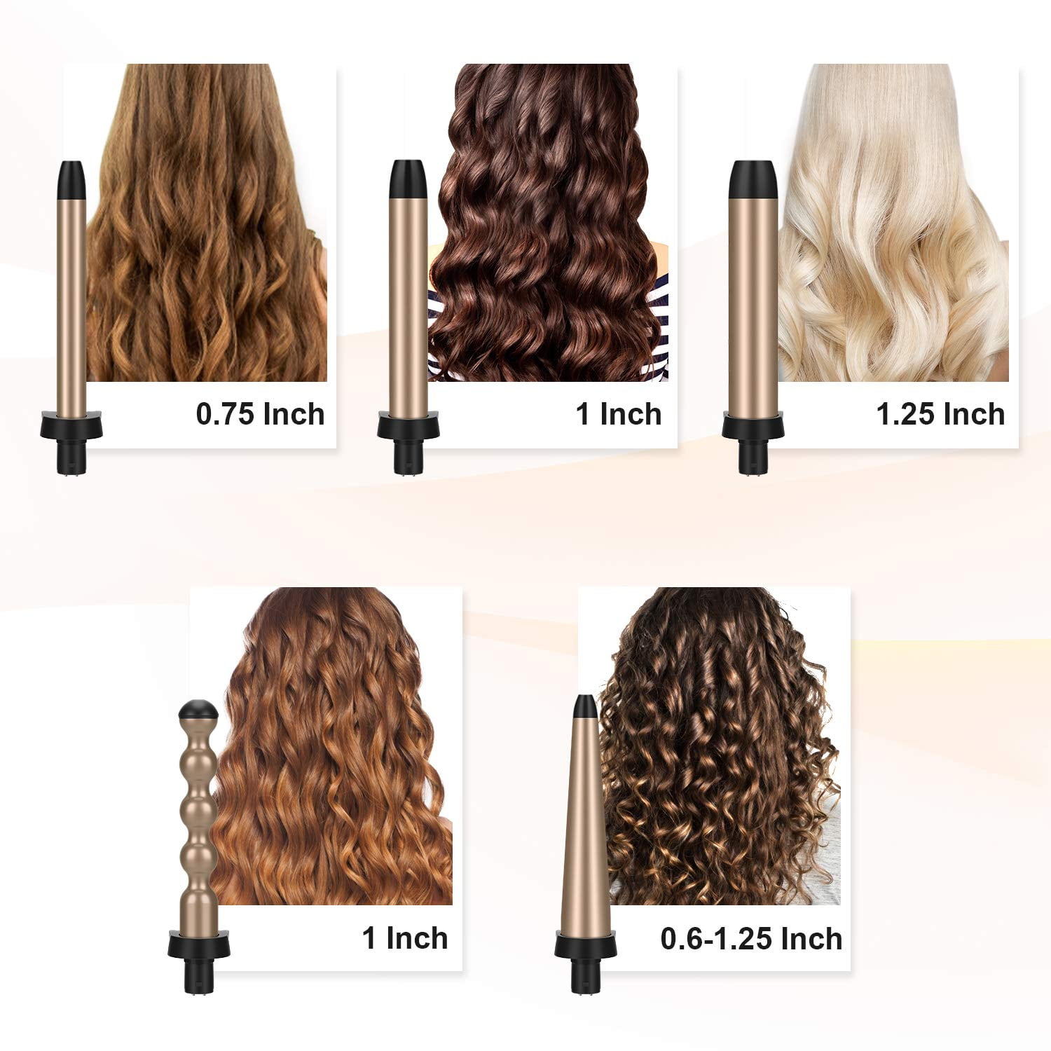 [ 5 in 1 Professional Curling Iron Set]: This curling iron set includes a 0.6-1.25 inch tapered clipless barrel designed for small wave style. 0.6/1.25 inch Curling Barrel designed for small wave fine,medium length hair. 1 inch Bead Barrel designed for voluminous waves. With a heat resistant glove. Curling iron wand set gives you looping curls or defined natural, soft beach waves for medium to long hair. [ 30s Fast Heat up & High Heat Longer-Lasting Shaped Curling Wand ]: Curling iron wand rapid heats up in only 30s to 450°F, high heat ensure longer-lasting shaped curls.you can even keep your hair curly for a day. Different size curlers enable to style your hair in different style. Suitable for all hair types from short, medium, and long hair to thin, fine, normal, thick, and coarse hair. Curling iron wand set works as a great gift to send to friends or family. [ LED Display & Temperature Control & Easy to Use ]: The temperature is directly indicated on the LED display screen, convenient for you to easily check the temperature you need. By pressing the +/- keys to adjust the temperature from 250°F to 450°F which is suitable for all kinds of hair. [ Tourmaline Ceramic Technology Protect Hair from Damage & 360 Degree Swivel Cord ]: Hair wand adopt smooth tourmaline ceramic material technology, by producing negative ions to seal moisture, protect cuticles, and reduce hair static and frizz.Curling iron wand ceramic coating can reduce hair loss and damage, without pulling on the hair,you can easily enjoy choose beachy waves or loose curls.Curling iron wand 360°no-tangle swivel cord for ultimate experience when styling hair. [ Dual Voltage & Perfect Gift ]: Curling iron wand Compatible 100V-240V voltage ensure you are able to use it any country. Professional curling wave iron with 5 interchangeable barrels and a heat protective glove. Curling iron wand set provide the 90 DAYS NO QUESTIONS ASKED. Please do not hesitate to tell us.