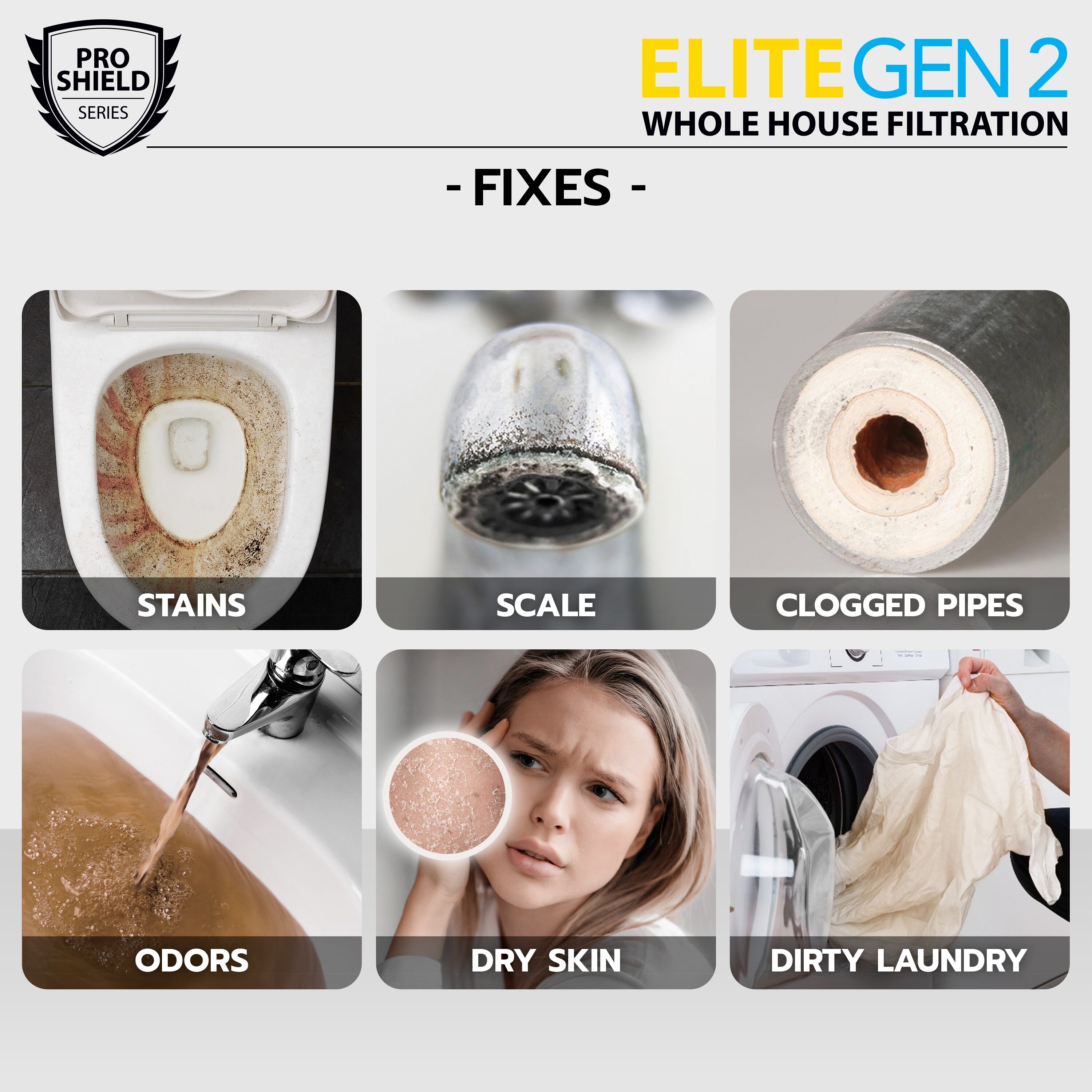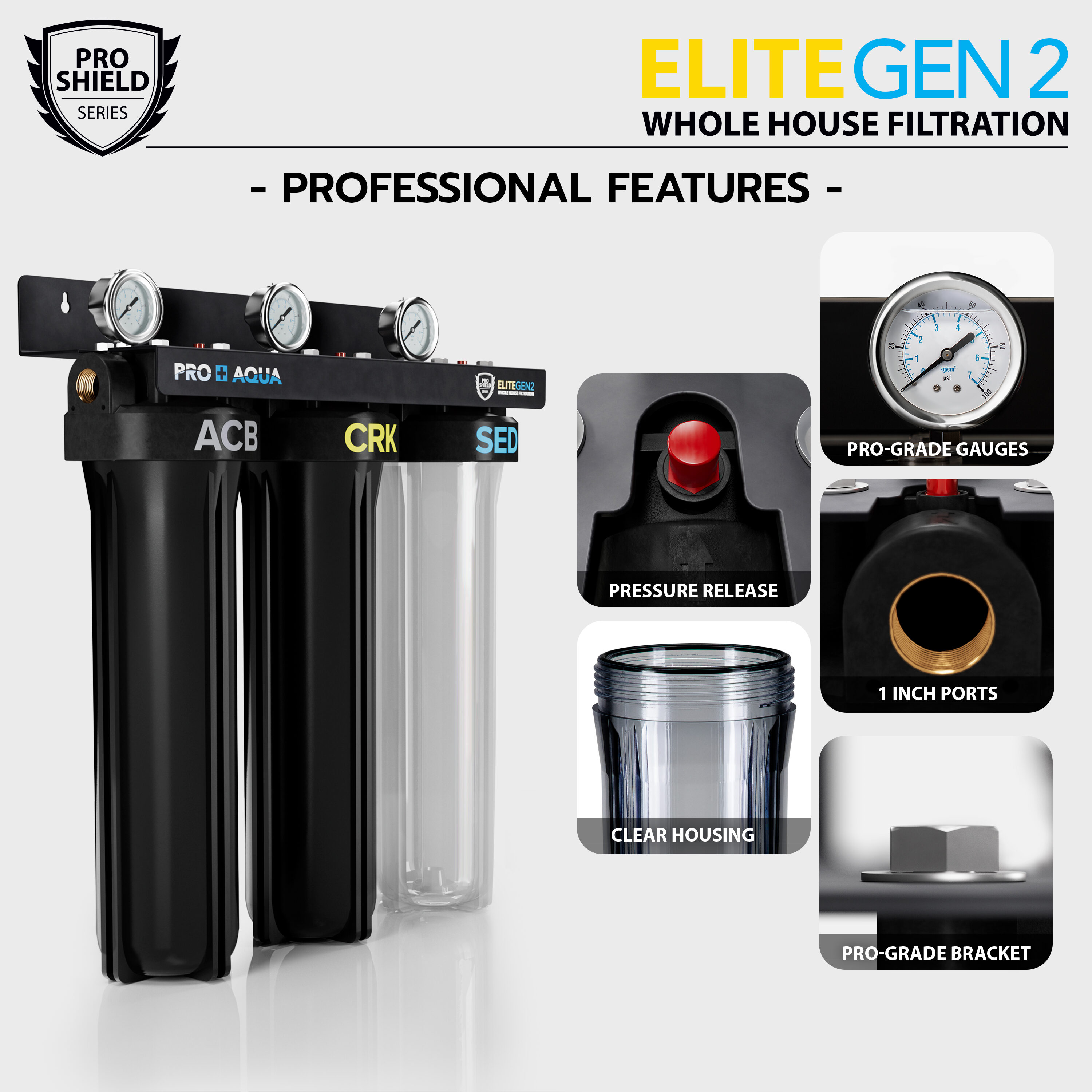 Protect your family from what you cannot see. The Pro-Shield Series ELITE Model Whole House Filtration System offers 3 stages for ultimate performance and clean safe water for your whole house. The specially engineered filters offer unmatched performance with up to 99% reduction for Chlorine and Heavy Metals. Protect your home, health, and appliances by filtering all of your incoming water and removing harmful contaminants like lead, mercury and other cancer-causing contaminants. The ELITE Whole House Water Filtration System removes major contaminants from your Well water or City water and provides clean safe water for showering, cooking, laundry, pets, plants, and other home uses. Provide your family with healthy clean water. Provide your pets and plants with cleaner water. Extend the life of your dishwasher, laundry machine, and other appliances, and reduce energy cost. You will love the whiter whites from your laundry and the healthy feel of clean water in your shower. This ELITE model Whole House Filtration System is designed for ease of use and efficiency. A filter set is good for up to 100,000 gallons or 6-12 months (filter life depends on your water quality). This system comes complete with a full filter set. High-flow ports are designed for minimal reduction in water pressure allowing for an incredible flow rate of up to 7 GPM. This is a Pro-Grade heavy-duty whole house filtration system made for durability in demanding commercial environments but, designed for home use for those that want professional filtration results without the price. The system comes assembled on a heavy-duty bracket with Stainless Steel Bolts and Stainless Steel Pressure Gauges for system monitoring. Each Housing comes with a built-in Pressure relief button for easy filter change-outs and a housing wrench. Works with 45-80 psi and between 40-100 water temperature.
