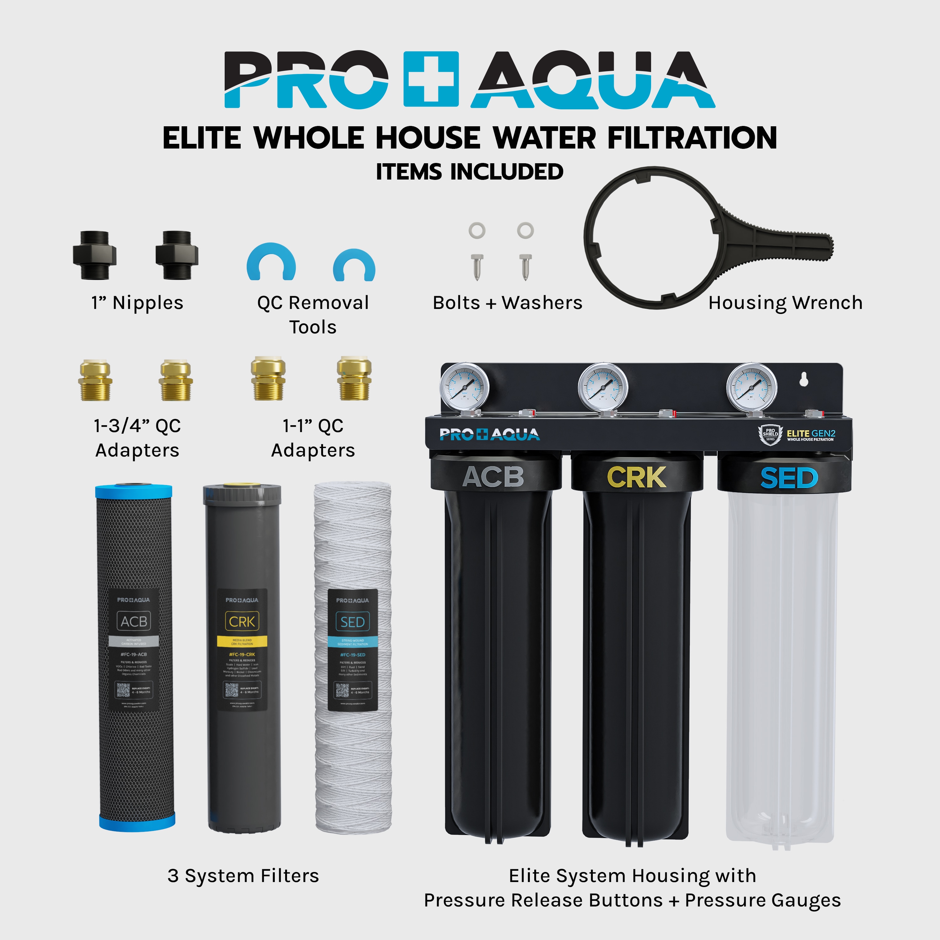Package Contents: Prograde filter housings (1 clear, 2 black), 1″ port filter caps, heavy-duty metal bracket, stainless steel pressure gauges, stage 1 premium prefilter, stage 2 heavy metals filter, stage 3 carbon block filter, stainless steel lug screws, filter wrench