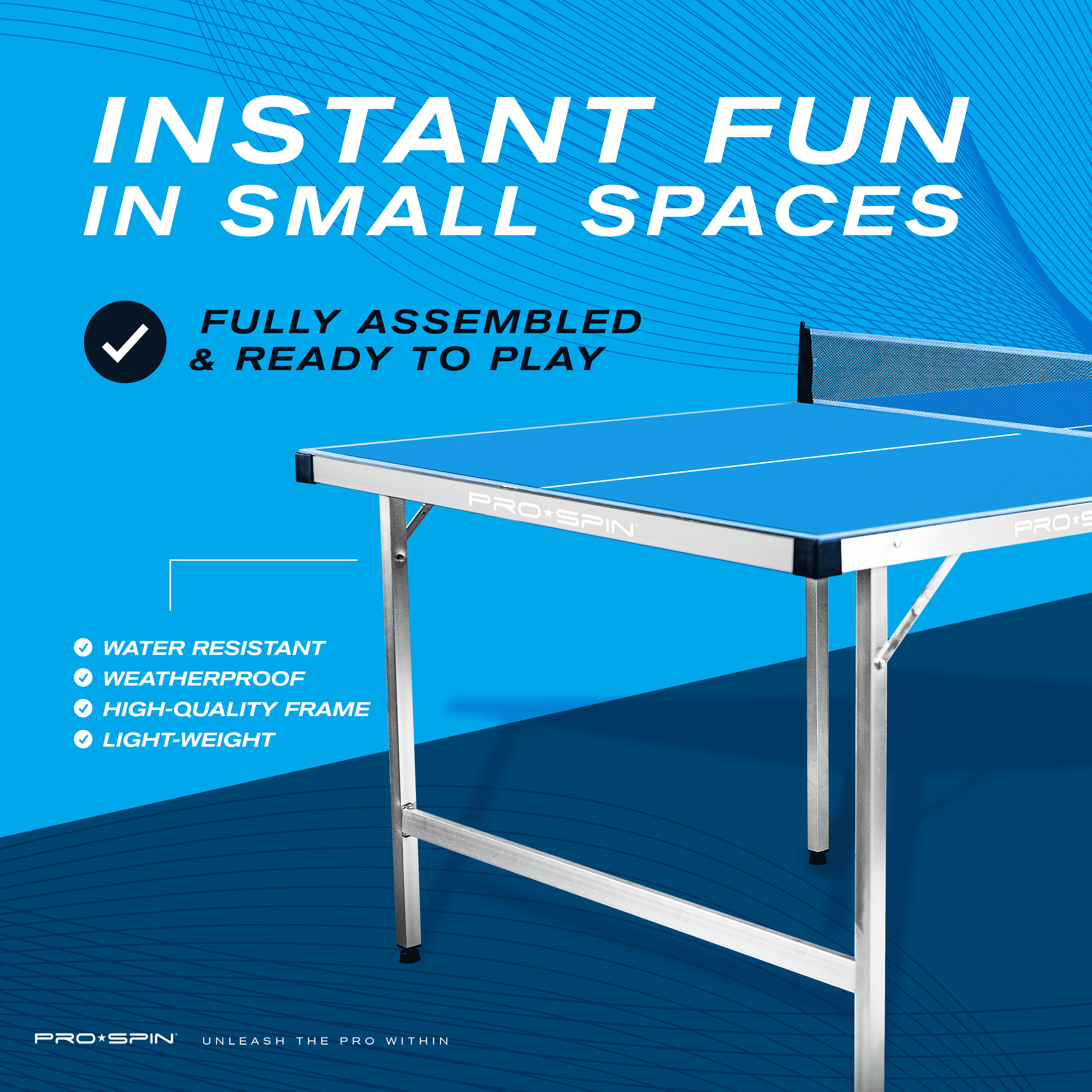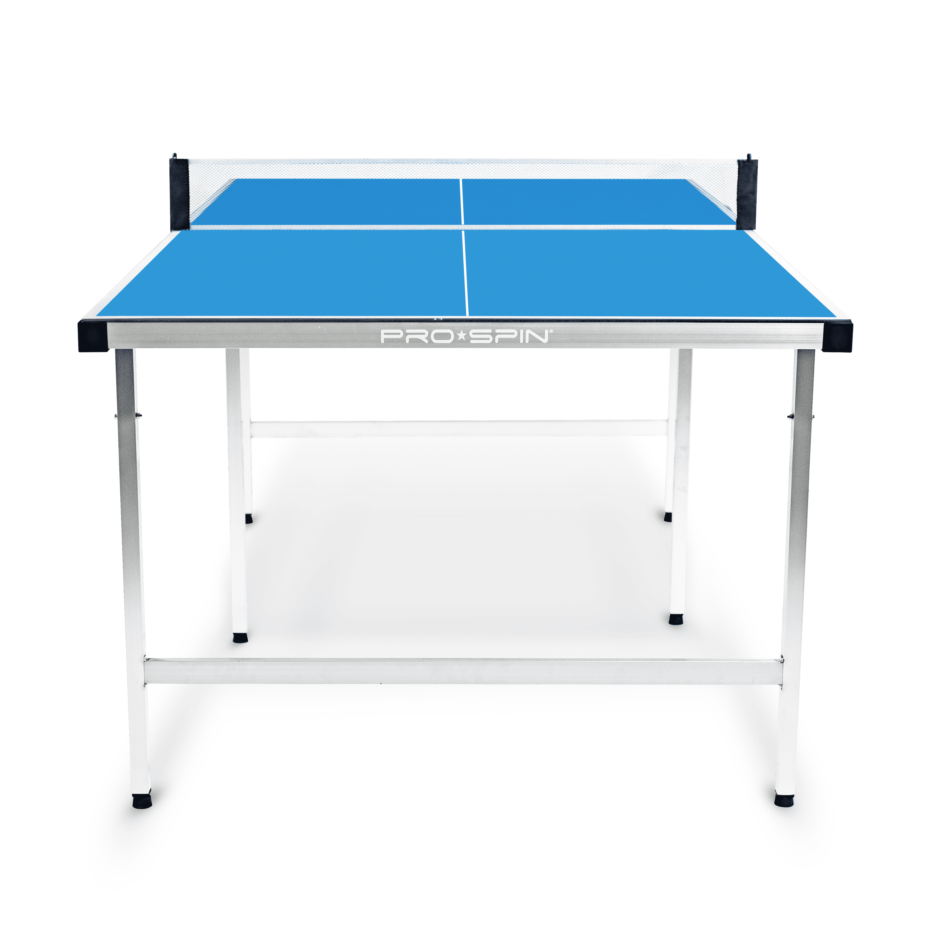 The perfect choice for hours of fun anywhere! From apartments, and game rooms, to offices, dorms, and outdoor patios, the Pro-Spin Sports Midsize Portable Ping Pong Table comes 100% pre-assembled and ready to play! It sets up easily and folds in half making it simple to store away under the bed, in your closet, or anywhere you have just a little extra space. With regulation height and mid-sized convenience, measuring 71″ x 40″ x 30″, it makes enjoying fun table tennis action possible, even in tight spaces. A fully aluminum construction means you can set up indoors or out and adjustable leg levellers ensure a balanced game, even on uneven floors. Set now includes our best-selling 2-Player set of High-Performance Ping Pong Paddles and Balls.