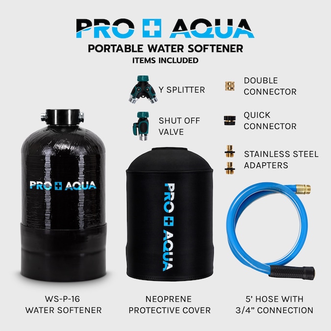 - Full-featured: includes all the accessories you will need; main softener unit, tank jacket, garden hose QC adapters, shutoff valve, Y valve, female to female adapter, premium water hose; the only system in the market that comes fully bundled