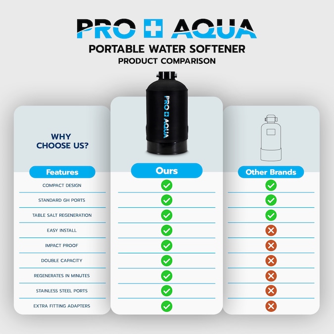 - Premium value: this portable water softener and conditioner produces twice the gallons compared to a standard model, offers the best value, and it is the best compact RV water softener on the market measuring about 10×9.5 inches at 35 lbs
