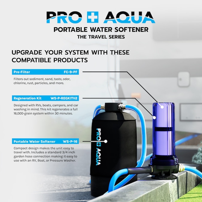 The WS-P-16 portable mobile water softener is the best performing and best-priced RV water softener on the market. This high-quality professional portable water softener eliminates your hard water while on the road or on your boat. It is also ideal for carpet cleaners, car wash/detailer, for home or commercial professionals. Protect your health by eliminating hard water health concerns and improve dry itchy skin, red dry spots, dry scalps, and eczema by removing skin-damaging hard minerals. This softener prevents hard water and rust stains, avoids scale build-up, improves taste and odor, increases lathering of soaps, and reduces soap over-usage. Built for portability and durability for serious RV, boat, carpet cleaners, or mobile detail owners. This 16,000 grain unit is a perfect choice and supplies approximately 40 percent more soft water than any other unit on the market. This portable water softener comes fully charged and ready for use in under 5 minutes. Regenerates in under 30 minutes with the optional regeneration kit and standard table salt, no chemicals or special salts needed. Provides up to 2,000 gallons of soft water (at 8 GPG hardness) or up to 40 days. The WS-P-16 compact space-saving design allows it to be installed in the tightest places such as your RV storage bay or boat dockside locker. Features a wide 10-3/8in sturdy base, high-grade premium capacity resin, standard 3/4 in garden hose connections, female to female adapter, Y adapter, quick connect adapter, and a premium garden hose. Optional 2-in-1 pre-filter and regeneration kit (SKU: WS-P-REG-KITV2) sold separately for a no-fuss regeneration, no tools required.