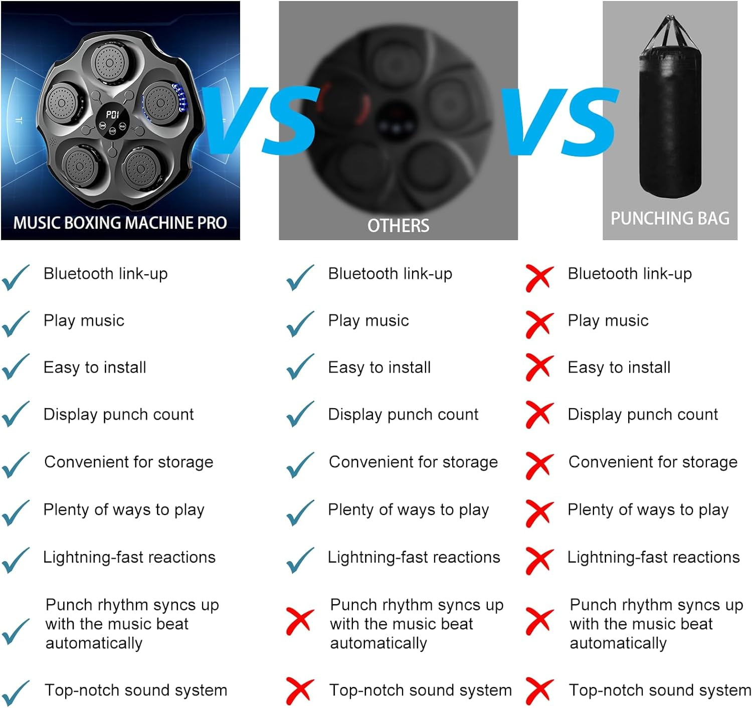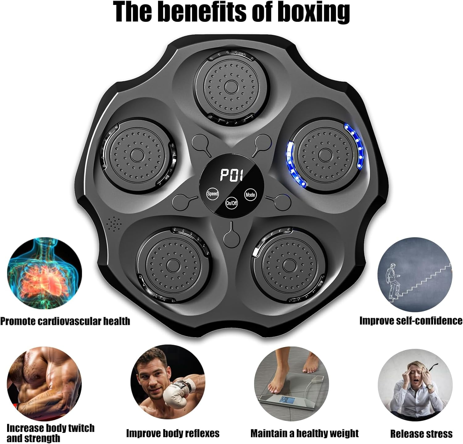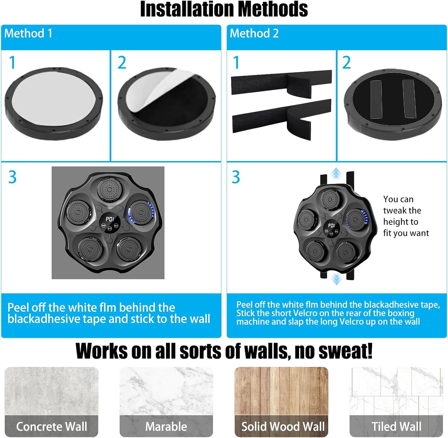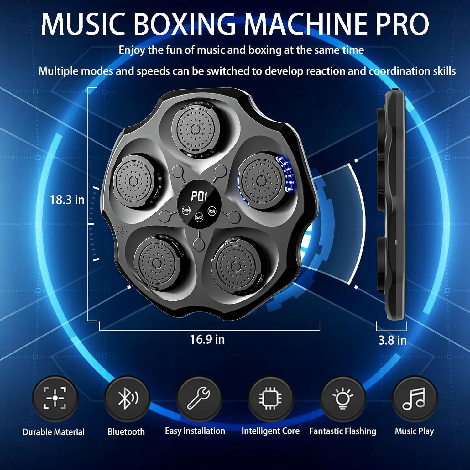 【Advanced Music Boxing Experience】Upgrade your workout with our improved Music Boxing Machine, featuring enhanced smart Bluetooth connectivity for a seamless link to your favorite tracks. The device automatically adjusts to the rhythm of the music for a dynamic and immersive experience, providing superior sound quality that makes your fitness journey more enjoyable and effective. 【Enhanced Safety Features】Enjoy added protection with our high-performance foam material and sturdy PU components, designed to absorb shock and provide a safe boxing experience. The upgraded version comes with improved pressure sensors for accurate punch recording. 【Versatile Modes and Speeds】Tailored for all skill levels, our machine offers 9 modes and various speed adjustments. Whether you’re a beginner or a seasoned boxer, enhance your focus and reflexes for a comprehensive workout. 【Sleek and Easy Installation】Our wall-mounted design saves space and is perfect for any home gym. The upgraded version offers an even more compact and easier installation process, ensuring a hassle-free setup. 【Professional after-sales】The product has been strictly tested to ensure high quality, if you encounter any problems and questions during installation and use, please feel free to contact our professional customer service team, we will try our best to help you!